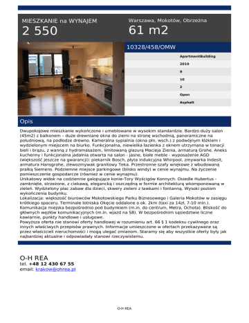 MIESZKANIE na WYNAJEM 2 550 Warszawa, Mokotów, Obrzeżna 61 m2 10328/458/OMW ApartmentBuilding 2010 9 10 2 Open Asphalt Opis Dwupokojowe mieszkanie wykończone i umeblowane w wysokim standardzie. Bardzo duży salon (45m2) z balkonem – duże drewniane okna do ziemi na stronę wschodnią, panoramiczne na południową, na podłodze drewno. Kameralna sypialnia (okna płn, wsch.) z podwójnym łóżkiem i wydzielonym miejscem na biurko. Funkcjonalna, niewielka łazienka z oknem utrzymana w tonacji bieli i brązu, z wanną z hydromasażem, limitowaną glazurą Macieja Zienia, armaturą Grohe. Aneks kuchenny i funkcjonalna jadalnia otwarta na salon - jasne, białe meble - wyposażenie AGD (większość jeszcze na gwarancji): piekarnik Bosch, płyta indukcyjna Whirpool, zmywarka Indesit, armatura Hansgrohe, zlewozmywak granitowy Teka. Przestronne szafy wnękowe z wbudowaną pralką Siemens. Podziemne miejsce parkingowe (blisko windy) w cenie wynajmu. Na życzenie pomieszczenie gospodarcze (również w cenie wynajmu). Unikatowy widok na codziennie galopujące konie-Tory Wyścigów Konnych. Osiedle Hubertus zamknięte, strzeżone, z ciekawą, elegancką i oszczędną w formie architekturą wkomponowaną w zieleń. Wydzielony plac zabaw dla dzieci, skwery zieleni z ławkami i fontanną. Wysoki poziom wykończenia budynku. Lokalizacja: większość biurowców Mokotowskiego Parku Biznesowego i Galeria Mokotów w zasięgu krótkiego spaceru. Terminale lotniska Okęcie oddalone o ok. 2km (taxi za 14zł, 7-10 min.). Komunikacja miejska bezpośrednio pod budynkiem (m.in. do centrum, Metra, Ochota). Bliskość do głównych węzłów komunikacyjnych (m.in. wjazd na S8). W bezpośrednim sąsiedztwie liczne kawiarnie, punkty handlowe i usługowe. Powyższa oferta nie stanowi oferty handlowej w rozumieniu art. 66 § 1 kodeksu cywilnego oraz innych właściwych przepisów prawnych. Informacje umieszczone w ofertach przekazywane są przez właścicieli nieruchomości i mogą ulegać zmianom. Staramy się aby wszystkie oferty były jak najbardziej aktualne i odpowiadały stanowi rzeczywistemu. O-H REA tel. +48 12 430 67 55 email: [email protected] O-H REA Powered by TCPDF (www.tcpdf.org)