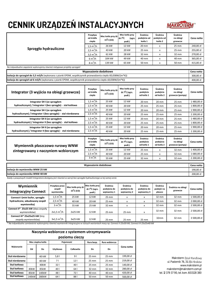 Przepływ od źródła ciepła Sprzęgło hydrauliczne Moc kotła przy 15 C (CO) Δt 7 C (ogrz. podł.) Średnica podejścia od kotła 1 Średnica podejścia od kotła 2 Średnica na obiegi grzewcze Cena netto 1,5 m3/h 26 kW 12 kW 20 mm x 25 mm 240,00 zł 2,5 m3/h 43 kW 20 kW 25 mm x 25 mm 255,00 zł 3,5 m3/h 61 kW 28 kW 32 mm x 32 mm 270,00 zł 6 m3/h 104 kW 49 kW 40 mm x 40 mm 365,00 zł 8 m3/h 139 kW 65 kW 50 mm x 50 mm 415,00 zł Moc kotła przy Δt 0 0 Na indywidualne zapytanie wykonujemy również nietypowe projekty sprzęgieł Wyposażenie dodatkowe Cena netto Izolacja do sprzegieł do 3,5 m3/h (wykonana z pianki EPDM, współczynnik przewodzenia ciepła ≤0,038W/(m*K)) 300,00 zł Izolacja do sprzegieł od 6 m3/h (wykonana z pianki EPDM, współczynnik przewodzenia ciepła ≤0,038W/(m*K)) 400,00 zł Integrator (3 wyjścia na obiegi grzewcze) Przepływ od źródła ciepła Moc kotła przy 15 C (CO) Δt 70C (ogrz. podł.) Średnica podejścia od kotła 1 Średnica podejścia od kotła 2 Średnica na obiegi grzewcze (pompy) Cena netto Moc kotła przy Δt 0 Integrator SH I (ze sprzęgłem hydraulicznym) / Integrator I (bez sprzęgła) - stal kotłowa 1,5 m3/h 25 kW 12 kW 20 mm 20 mm 25 mm 1 480,00 zł 2,5 m3/h 40 kW 20 kW 25 mm 25 mm 25 mm 1 800,00 zł Integrator SH I (ze sprzęgłem hydraulicznym) / Integrator I (bez sprzęgła) - stal nierdzewna 1,5 m3/h 2,5 m3/h 25 kW 12 kW 20 mm 20 mm 25 mm 1 900,00 zł 40 kW 20 kW 25 mm 25 mm 25 mm 2 200,00 zł Integrator SH II (ze sprzęgłem hydraulicznym) / Integrator II (bez sprzęgła) - stal kotłowa 1,5 m3/h 25 kW 12 kW 20 mm 20 mm 25 mm 1 480,00 zł 2,5 m3/h 40 kW 20 kW 25 mm 25 mm 25 mm 1 800,00 zł Integrator SH II (ze sprzęgłem hydraulicznym) / Integrator II (bez sprzęgła) - stal nierdzewna 1,5 m3/h 2,5 m3/h 25 kW 12 kW 20 mm 20 mm 25 mm 1 900,00 zł 40 kW 20 kW 25 mm 25 mm 25 mm 2 200,00 zł Moc kotła przy Wymiennik płaszczowo rurowy WNW zintegrowany z naczyniem wzbiorczym Przepływ od źródła ciepła 150C (CO) Δt 70C (ogrz. podł.) Średnica podejścia od kotła 1 Średnica podejścia od kotła 2 Średnica na obiegi grzewcze (pompy) Cena netto 1,5 m3/h 25 kW 12 kW 25 mm x 32 mm 1 400,00 zł 2,5 m3/h 3 m3/h 40 kW 20 kW 25 mm x 32 mm 1 680,00 zł 55 kW 25 kW 32 mm x 32 mm 2 200,00 zł Moc kotła przy Δt Wyposażenie dodatkowe Cena netto Izolacja do wymiennika WNW 25 kW 190,00 zł Izolacja do wymiennika WNW 40 kW 200,00 zł Każdy z powyższych modeli Integratora dostępny jest również w wersji bez sprzęgła hydraulicznego w tej samej cenie. Wymiennik Integracyjny Connect Connect I (mini bufor, sprzęgło hydrauliczne, wbudowany zespół wymiennika) Przepływ przez zespół wymiennika Moc kotła przy 150C (CO) Δt 70C (ogrz. podł.) Średnica podejścia do wężownicy 1 Średnica podejścia do wężownicy 2 Średnica podejścia do wężownicy 3 Średnica podejść na płaszcz Średnica na obiegi grzewcze Cena netto 1,5 m3/h 25 kW 12 kW 25 mm x x 32 mm 32 mm 1 500,00 zł 2,5 m3/h 40 kW 20 kW 25 mm x x 32 mm 32 mm 2 000,00 zł 3 m3/h 55 kW 25 kW 32 mm x x 32 mm 32 mm 2 500,00 zł 32 mm 32 mm 2 500,00 zł 32mm 32 mm 3 500,00 zł Moc kotła przy Δt Connect II* 25x25 kW (dwa zespoły wymienników) 2x1,5 m /h 2x25 kW 12 kW 25 mm 25 mm x Connect III* 25x25x25 kW (trzy zespoły wymienników) 3x1,5 m3/h 3x25 kW 12 kW 25 mm 25 mm 25 mm 3 * Na indywidualne zamówienie wykonujemy również wymienniki integracyjne w różnych wariantach mocy np. Connect II 25x30 kW, Connect III 25x25x40 kW Naczynia wzbiorcze z systemem utrzymywania poziomu cieczy Moc cieplna kotła Wykonanie Od Stal nierdzewna Stal nierdzewna Stal kotłowa Pojemność Rura bezp. Rura wzbiorcza Całkowita Dn Dn Cena netto Do Użytkowa 40 kW 5,8 l 9l 25 mm 25 mm 199,00 zł 40 kW 7l 12 l 25 mm 25 mm 219,00 zł 40kW 32 l 40 l 25 mm 25 mm 140,00 zł Stal kotłowa 40kW 85kW 40 l 64 l 32 mm 32 mm 280,00 zł Stal kotłowa Stal kotłowa 85kW 140kW 140kW 280kW 48 l 64 l 72 l 88 l 40 mm 50 mm 40 mm 50 mm 420,00 zł 560,00 zł Makroterm ul. Pasternik 76, 31www.makroterm.pl [email protected] tel. 12 379 37 90, tel. kom. 601 528 380