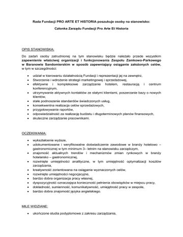 Rada Fundacji PRO ARTE ET HISTORIA poszukuje osoby na stanowisko: Członka Zarządu Fundacji Pro Arte Et Historia OPIS STANOWISKA: Do zadań osoby zatrudnionej na tym stanowisku będzie należało przede wszystkim zapewnienie właściwej organizacji i funkcjonowania Zespołu Zamkowo-Parkowego w Baranowie Sandomierskim w sposób zapewniający osiąganie założonych celów, w tym w szczególności: udział w kierowaniu działalnością Fundacji i reprezentacji jej na zewnętrz, Stworzenie i wdrożenie strategii marketingowej i sprzedażowej, efektywne i kompleksowe zarządzanie hotelem, restauracją i centrum konferencyjnym, utrzymywanie aktywnych kontaktów ze stałymi klientami, poszerzanie bazy o nowych klientów, stałe podnoszenie standardów świadczonych usług, konsekwentna realizacja celów sprzedażowych, przygotowywanie raportów, odpowiedzialność za realizację budżetu i długoterminowych planów finansowych, skuteczne zarządzanie pracownikami. OCZEKIWANIA: wykształcenie wyższe, udokumentowane i weryfikowalne doświadczenie zawodowe w branży hotelowo – gastronomicznej w tym minimum 3– letnim na stanowisku zarządczym, znajomość aktualnych trendów i mechanizmów zmian rynkowych w branży hotelarsko – gastronomicznej, rozwinięte umiejętności analityczne, w tym umiejętność optymalizacji kosztów zarządzania, kreatywność zorientowana na osiąganie wyznaczonych celów, rozwinięte umiejętności negocjacyjne, bardzo dobra organizacja pracy własnej, dyspozycyjność oznaczająca konieczność pełnienia obowiązków w miejscu pracy, dokładność, sumienność, komunikatywność, umiejętność pracy w zespole, bardzo dobra znajomość języka angielskiego. MILE WIDZIANE: ukończone studia podyplomowe z zakresu zarządzania, znajomość przepisów dotyczących fundacji, doświadczenie w zarządzaniu obiektami zabytkowymi lub znajomość zasad i przepisów dotyczących zarządzania obiektami zabytkowymi. doświadczenie w pozyskiwaniu funduszy unijnych, Rekomendacje z poprzednich miejsc pracy związanych z aktywnością zawodową w branży hotelowo- gastronomicznej będą dodatkowym atutem w ocenie Państwa aplikacji. OFERUJEMY: stabilne zatrudnienie, możliwość rozwoju zawodowego, możliwość podejmowania kreatywnych działań służących kształtowaniu wizerunku Fundacji i własnej osobowości zawodowej. Aplikacje, zawierające CV i list motywacyjny, prosimy przesyłać na adres [email protected] do dnia 04.09.2015 r. lub poprzez opcję „Aplikuj teraz” znajdującą się na dole ogłoszenia. W temacie maila prosimy wpisać numer referencyjny ogłoszenia 1001. Uprzejmie informujemy, iż odpowiemy tylko na wybrane oferty. Prosimy o dopisanie następującej klauzuli: „Oświadczam, iż wyrażam zgodę na przetwarzanie moich danych osobowych do celów rekrutacji ARP S.A. z siedzibą w Warszawie, zgodnie z ustawą z dnia 29.08.1997 r. o ochronie danych osobowych (Dz. U. z 2014 r. poz. 1182, ze zm.)”.