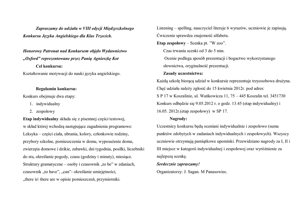Zapraszamy do udziału w VIII edycji Międzyszkolnego Konkursu Języka Angielskiego dla Klas Trzecich. Listening – spelling, nauczyciel literuje 6 wyrazów, uczniowie je zapisują. Ćwiczenie sprawdza znajomość alfabetu. Etap zespołowy – Scenka pt. ”W zoo”. Honorowy Patronat nad Konkursem objęło Wydawnictwo Czas trwania scenki od 3 do 5 min. „Oxford” reprezentowane przez Panią Agnieszkę Kot Ocenie podlega sposób prezentacji i bogactwo wykorzystanego Cel konkursu: Kształtowanie motywacji do nauki języka angielskiego. słownictwa, oryginalność prezentacji. Zasady uczestnictwa: Każdą szkołę biorącą udział w konkursie reprezentuje trzyosobowa drużyna. Regulamin konkursu: Konkurs obejmuje dwa etapy: Chęć udziału należy zgłosić do 15 kwietnia 2012r. pod adres: S P 17 w Koszalinie, ul. Wańkowicza 11, 75 – 445 Koszalin tel. 3451730 1. indywidualny Konkurs odbędzie się 9.05.2012 r. o godz. 13.45 (etap indywidualny) i 2. zespołowy 16.05. 2012r.(etap zespołowy) w SP 17. Etap indywidualny składa się z pisemnej części testowej, Nagrody: w skład której wchodzą następujące zagadnienia programowe: Uczestnicy konkursu będą oceniani indywidualnie i zespołowo (suma Leksyka – części ciała, ubrania, kolory, członkowie rodziny, punktów zdobytych w zadaniach indywidualnych i zespołowych). Wszyscy przybory szkolne, pomieszczenia w domu, wyposażenie domu, uczniowie otrzymują pamiątkowe upominki. Przewidziano nagrody za I, II i zwierzęta domowe i dzikie, zabawki, dni tygodnia, posiłki, liczebniki III miejsce w kategorii indywidualnej i zespołowej oraz wyróżnienie za do stu, określanie pogody, czasu (godziny i minuty), miesiące. najlepszą scenkę. Struktury gramatyczne – osoby i czasownik „to be” w zdaniach, Serdecznie zapraszamy! czasownik „to have”, „can”- określanie umiejętności, Organizatorzy: J. Sagan. M Panasowiec. „there is\ there are w opisie pomieszczeń, przymiotniki.