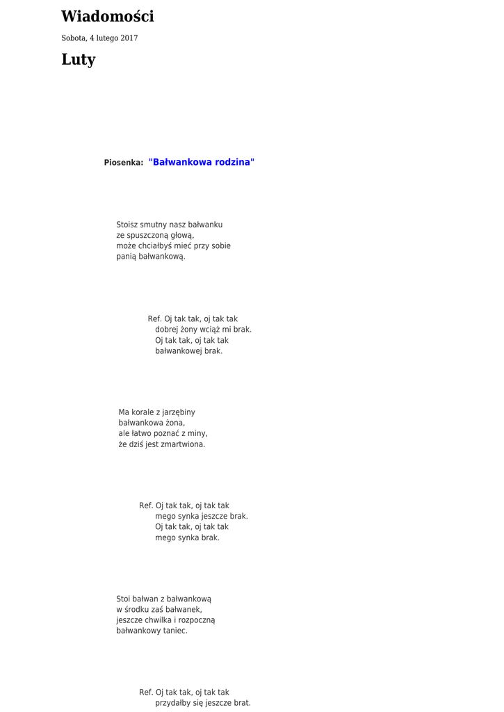 Wiadomości Sobota, 4 lutego 2017 Luty Piosenka: "Bałwankowa rodzina" Stoisz smutny nasz bałwanku ze spuszczoną głową, może chciałbyś mieć przy sobie panią bałwankową. Ref. Oj tak tak, oj tak tak dobrej żony wciąż mi brak. Oj tak tak, oj tak tak bałwankowej brak. Ma korale z jarzębiny bałwankowa żona, ale łatwo poznać z miny, że dziś jest zmartwiona. Ref. Oj tak tak, oj tak tak mego synka jeszcze brak. Oj tak tak, oj tak tak mego synka brak. Stoi bałwan z bałwankową w środku zaś bałwanek, jeszcze chwilka i rozpoczną bałwankowy taniec. Ref. Oj tak tak, oj tak tak przydałby się jeszcze brat. Oj tak tak oj tak tak przydałby się brat. Już wesołe dwa bałwanki tańczą z rodzicami, i my także się pobawmy razem z bałwankami. Ref. Oj tak tak, oj tak tak zatańcz z nami raz i dwa. Oj tak tak oja tak tak zatańcz raz i dwa. Wiersz: "Zimowe zabawy" Oj, bałwanki, bałwanki Pojedziemy dziś na sanki, Zabierzemy łyżwy, narty, Siedzi w domu, kto uparty. Już na nartach zjazd zrobimy I bałwanka ulepimy. Śnieżne kule w krąg migają, W plecy dzieci uderzają. Wiersz: "Karnawał" D. Gellner Już Karnawał włożył maskę. Drzwi otworzył z hukiem, z trzaskiem! Wpadł jak wicher do pokoju. W czym? W karna wałowym stroju! - Cześć! Przybiegłem w dwie godziny! Mam wstążeczki i cekiny, Nut wesołych dwie kieszenie I do tańca ZAPROSZENIE!