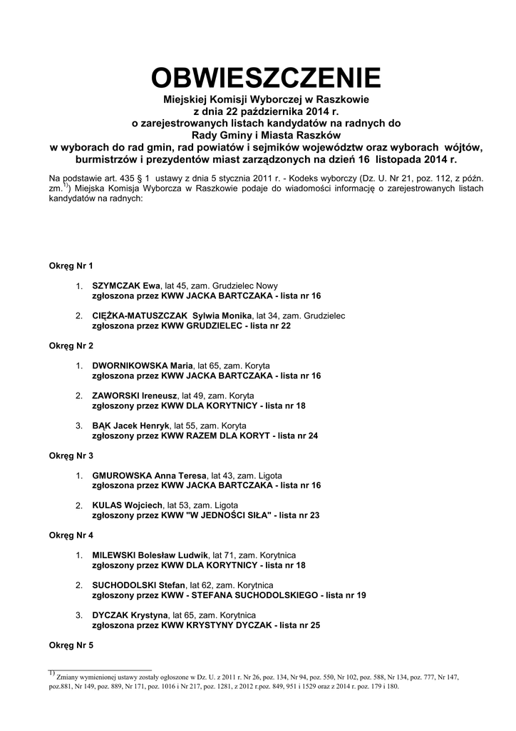 OBWIESZCZENIE Miejskiej Komisji Wyborczej w Raszkowie z dnia 22 października 2014 r. o zarejestrowanych listach kandydatów na radnych do Rady Gminy i Miasta Raszków w wyborach do rad gmin, rad powiatów i sejmików województw oraz wyborach wójtów, burmistrzów i prezydentów miast zarządzonych na dzień 16 listopada 2014 r. Na podstawie art. 435 § 1 ustawy z dnia 5 stycznia 2011 r. - Kodeks wyborczy (Dz. U. Nr 21, poz. 112, z późn. 1) zm. ) Miejska Komisja Wyborcza w Raszkowie podaje do wiadomości informację o zarejestrowanych listach kandydatów na radnych: Okręg Nr 1 1. SZYMCZAK Ewa, lat 45, zam. Grudzielec Nowy zgłoszona przez KWW JACKA BARTCZAKA - lista nr 16 2. CIĘŻKA-MATUSZCZAK Sylwia Monika, lat 34, zam. Grudzielec zgłoszona przez KWW GRUDZIELEC - lista nr 22 Okręg Nr 2 1. DWORNIKOWSKA Maria, lat 65, zam. Koryta zgłoszona przez KWW JACKA BARTCZAKA - lista nr 16 2. ZAWORSKI Ireneusz, lat 49, zam. Koryta zgłoszony przez KWW DLA KORYTNICY - lista nr 18 3. BĄK Jacek Henryk, lat 55, zam. Koryta zgłoszony przez KWW RAZEM DLA KORYT - lista nr 24 Okręg Nr 3 1. GMUROWSKA Anna Teresa, lat 43, zam. Ligota zgłoszona przez KWW JACKA BARTCZAKA - lista nr 16 2. KULAS Wojciech, lat 53, zam. Ligota zgłoszony przez KWW "W JEDNOŚCI SIŁA" - lista nr 23 Okręg Nr 4 1. MILEWSKI Bolesław Ludwik, lat 71, zam. Korytnica zgłoszony przez KWW DLA KORYTNICY - lista nr 18 2. SUCHODOLSKI Stefan, lat 62, zam. Korytnica zgłoszony przez KWW - STEFANA SUCHODOLSKIEGO - lista nr 19 3. DYCZAK Krystyna, lat 65, zam. Korytnica zgłoszona przez KWW KRYSTYNY DYCZAK - lista nr 25 Okręg Nr 5 1) Zmiany wymienionej ustawy zostały ogłoszone w Dz. U. z 2011 r. Nr 26, poz. 134, Nr 94, poz. 550, Nr 102, poz. 588, Nr 134, poz. 777, Nr 147, poz.881, Nr 149, poz. 889, Nr 171, poz. 1016 i Nr 217, poz. 1281, z 2012 r.poz. 849, 951 i 1529 oraz z 2014 r. poz. 179 i 180. 1. LIS Daniel Piotr, lat 25, zam. Bieganin zgłoszony przez KW PRAWO I SPRAWIEDLIWOŚĆ - lista nr 3 2. OWCZAREK Grażyna Danuta, lat 53, zam. Głogowa zgłoszona przez KWW "RAZEM DLA GMINY" RASZKÓW - lista nr 21 Okręg Nr 6 1. MARSZAŁ Karol Dominik, lat 35, zam. Skrzebowa zgłoszony przez KWW JACKA BARTCZAKA - lista nr 16 Okręg Nr 7 1. MATYBA Andrzej, lat 56, zam. Raszków zgłoszony przez KWW JACKA BARTCZAKA - lista nr 16 Okręg Nr 8 1. NOWICKI Zdzisław, lat 48, zam. Raszków zgłoszony przez KW PRAWO I SPRAWIEDLIWOŚĆ - lista nr 3 2. JĘDRZEJAK Włodzimierz Marian, lat 60, zam. Raszków zgłoszony przez KWW "DZIAŁAJMY RAZEM" RASZKÓW - lista nr 17 Okręg Nr 9 1. BĘDZIESZAK Halina, lat 55, zam. Raszków zgłoszona przez KWW JACKA BARTCZAKA - lista nr 16 Okręg Nr 10 1. MICHALAK Andrzej Piotr, lat 44, zam. Jaskółki zgłoszony przez KWW JACKA BARTCZAKA - lista nr 16 Okręg Nr 11 1. BOLACH Marcin, lat 30, zam. Janków Zaleśny zgłoszony przez KOMITET WYBORCZY PSL - lista nr 1 2. PETNIAKOWSKI Leszek Stanisław, lat 59, zam. Walentynów zgłoszony przez KWW JACKA BARTCZAKA - lista nr 16 Okręg Nr 12 1. PRZYGODA Eugenia Maria, lat 61, zam. Przybysławice zgłoszona przez KWW JACKA BARTCZAKA - lista nr 16 2. MARCISZEWSKI Karol Antoni, lat 29, zam. Pogrzybów zgłoszony przez KWW "DZIAŁAJMY RAZEM" RASZKÓW - lista nr 17 3. WŁODARCZYK Robert, lat 25, zam. Przybysławice zgłoszony przez KWW ROBERTA WŁODARCZYKA RADNY DLA MIESZKAŃCÓW - lista nr 20 Okręg Nr 13 1. SZNAJDER Gabriela Jadwiga, lat 38, zam. Szczurawice zgłoszona przez KOMITET WYBORCZY PSL - lista nr 1 2. BIADAŁA Maria, lat 52, zam. Rąbczyn zgłoszona przez KWW JACKA BARTCZAKA - lista nr 16 Okręg Nr 14 1. WALKOWIAK Jan, lat 55, zam. Radłów zgłoszony przez KWW JACKA BARTCZAKA - lista nr 16 Okręg Nr 15 1. GIWERSKI Kazimierz, lat 59, zam. Radłów zgłoszony przez KWW JACKA BARTCZAKA - lista nr 16 Przewodnicząca Miejskiej Komisji Wyborczej w Raszkowie /-/ Anna Szymankiewicz