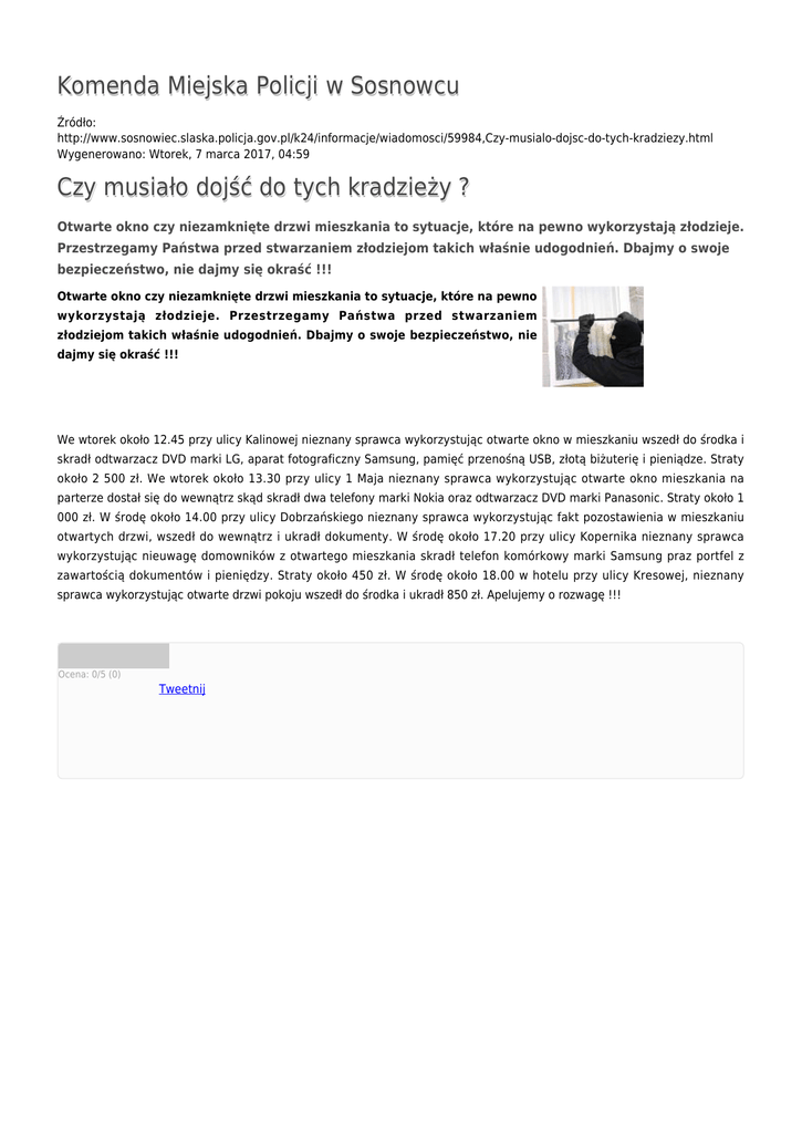 Komenda Miejska Policji w Sosnowcu Źródło: http://www.sosnowiec.slaska.policja.gov.pl/k24/informacje/wiadomosci/59984,Czy-musialo-dojsc-do-tych-kradziezy.html Wygenerowano: Wtorek, 7 marca 2017, 04:59 Czy musiało dojść do tych kradzieży ? Otwarte okno czy niezamknięte drzwi mieszkania to sytuacje, które na pewno wykorzystają złodzieje. Przestrzegamy Państwa przed stwarzaniem złodziejom takich właśnie udogodnień. Dbajmy o swoje bezpieczeństwo, nie dajmy się okraść !!! Otwarte okno czy niezamknięte drzwi mieszkania to sytuacje, które na pewno wykorzystają złodzieje. Przestrzegamy Państwa przed stwarzaniem złodziejom takich właśnie udogodnień. Dbajmy o swoje bezpieczeństwo, nie dajmy się okraść !!! We wtorek około 12.45 przy ulicy Kalinowej nieznany sprawca wykorzystując otwarte okno w mieszkaniu wszedł do środka i skradł odtwarzacz DVD marki LG, aparat fotograficzny Samsung, pamięć przenośną USB, złotą biżuterię i pieniądze. Straty około 2 500 zł. We wtorek około 13.30 przy ulicy 1 Maja nieznany sprawca wykorzystując otwarte okno mieszkania na parterze dostał się do wewnątrz skąd skradł dwa telefony marki Nokia oraz odtwarzacz DVD marki Panasonic. Straty około 1 000 zł. W środę około 14.00 przy ulicy Dobrzańskiego nieznany sprawca wykorzystując fakt pozostawienia w mieszkaniu otwartych drzwi, wszedł do wewnątrz i ukradł dokumenty. W środę około 17.20 przy ulicy Kopernika nieznany sprawca wykorzystując nieuwagę domowników z otwartego mieszkania skradł telefon komórkowy marki Samsung praz portfel z zawartością dokumentów i pieniędzy. Straty około 450 zł. W środę około 18.00 w hotelu przy ulicy Kresowej, nieznany sprawca wykorzystując otwarte drzwi pokoju wszedł do środka i ukradł 850 zł. Apelujemy o rozwagę !!! Ocena: 0/5 (0) Tweetnij