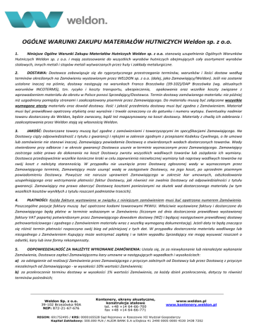 OGÓLNE WARUNKI ZAKUPU MATERIAŁÓW HUTNICZYCH Weldon sp. z o.o. 1. Niniejsze Ogólne Warunki Zakupu Materiałów Hutniczych Weldon sp. z o.o. stanowią uzupełnienie Ogólnych Warunków Hutniczych Weldon sp. z o.o. i mają zastosowanie do wszystkich wyrobów hutniczych obejmujących cały asortyment wyrobów stalowych, innych metali i stopów metali wytwarzanych przez huty i zakłady metalurgiczne. 2. DOSTAWA: Dostawca zobowiązuje się do rygorystycznego przestrzegania terminów, warunków i ilości dostaw według terminów określonych na Zamówieniu wystawionym przez WELDON sp. z o.o. (dalej, jako Zamawiający/Weldon). Jeśli nie zostanie ustalone inaczej na piśmie, dostawy następują na warunkach Franco Brzezówka (39-102)/DAP Brzezówka (wg. aktualnych warunków INCOTERMS), tzn. ryzyko i koszty transportu, ubezpieczenia, opakowania oraz wszelkie koszty związane z wprowadzeniem materiału do obrotu w Polsce ponosi Sprzedający/Dostawca. Termin dostawy zamówionego materiału: nie później niż uzgodniony pomiędzy stronami i zaakceptowany pisemnie przez Zamawiającego. Do materiału muszą być załączone wszystkie wymagane atesty materiału oraz dowód dostawy. Ilość i jakość przedmiotu dostawy musi być zgodna z Zamówieniem. Materiał musi być prawidłowo opatrzony etykietą oraz wyraźnie i trwale oznaczony co do gatunku i numeru wytopu. Ewentualny nadmiar towaru dostarczony do Weldon, będzie zwracany, bądź też magazynowany na koszt dostawcy. Materiały z chwilą ich odebrania i zaakceptowania przez Weldon stają się własnością Weldon. 3. JAKOŚĆ: Dostarczane towary muszą być zgodne z zamówieniami i towarzyszącymi im specyfikacjami Zamawiającego. Na Dostawcy ciąży odpowiedzialność z tytułu z gwarancji i rękojmi w zakresie zgodnym z przepisami Kodeksu Cywilnego, o ile umowa lub zamówienie nie stanowi inaczej. Zamawiający powiadamia Dostawcę o stwierdzonych wadach dostarczonych towarów. Wady stwierdzone przy odbiorze i w okresie gwarancji Dostawca usunie w terminie wyznaczonym przez Zamawiającego. Zamawiający zastrzega sobie prawo do dokonania na koszt Dostawcy zwrotu wszystkich wadliwych towarów lub zażądania ich wymiany. Dostawca przedsięweźmie wszelkie konieczne kroki w celu zapewnienia niezwłocznej wymiany lub naprawy wadliwych towarów na swój koszt z należytą starannością. W przypadku nie usunięcia przez Dostawcę zgłoszonej wady w wyznaczonym przez Zamawiającego terminie, Zamawiający może usunąć wadę w zastępstwie Dostawcy, na jego koszt, po uprzednim pisemnym powiadomieniu Dostawcy. Powyższe nie narusza uprawnień Zamawiającego w zakresie kar umownych, odszkodowania uzupełniającego oraz wstrzymania płatności faktur Dostawcy, jak również nie zwalnia Dostawcy od odpowiedzialności z tytułu gwarancji. Zamawiający ma prawo obarczyć Dostawcę kosztami poniesionymi na skutek wad dostarczonego materiału (w tym wszelkich kosztów wynikłych z tytułu roszczeń podmiotów trzecich). 4. PŁATNOŚCI: Każda faktura wystawiona w związku z niniejszym zamówieniem musi być opatrzona numerem Zamówienia. Poszczególne pozycje faktury muszą być opatrzone kodami towarowymi PKWiU. Właściwie wystawione faktury i dostarczone do Zamawiającego będą płatne w terminie wskazanym w Zamówieniu (liczonym od dnia dostarczenia prawidłowo wystawionej faktury VAT popartej potwierdzonym przez Zamawiającego dowodem dostawy (WZ) i będącej następstwem prawidłowej dostawy pełnowartościowego i zgodnego z Zamówieniem materiału wraz z wszelką wymaganą dokumentacją). Jeżeli daty te będą znacząco się różnić termin płatności rozpoczyna swój bieg od późniejszej z tych dat. W przypadku dostarczenia materiału wadliwego lub niezgodnego z Zamówieniem Kupujący może wstrzymać zapłatę i w takim wypadku Sprzedający nie mogą wysuwać roszczeń o odsetki, kary lub inne formy rekompensaty. 5. ODPOWIEDZIALNOŚĆ ZA NALEŻYTE WYKONANIE ZAMÓWIENIA: Ustala się, że za niewykonanie lub nienależyte wykonanie Zamówienia, Dostawca zapłaci Zamawiającemu kary umowne w następujących wypadkach i wysokościach: a) za odstąpienie od realizacji Zamówienia przez Zamawiającego z przyczyn zależnych od Dostawcy lub przez Dostawcę z przyczyn niezależnych od Zamawiającego - w wysokości 10% wartości Zamówienia; b) za przekroczenie terminu dostawy w wysokości 1% wartości Zamówienia, za każdy dzień przekroczenia, dotyczy to również terminów pośrednich; Weldon Sp. z o.o. 39-102 Brzezówka 90A NIP: 872-21-67-676 Kontenery, ekrany akustyczne, konstrukcje stalowe tel. +48 +14 64-66-700 fax +48 +14 64-66-771 www.weldon.pl www.kontenery.weldon.pl REGON: 691752495 / KRS: 0000165528 Sąd Rejonowy w Rzeszowie XII Wydział Gospodarczy Kapitał Zakładowy: 500.000 PLN / ALIOR BANK S.A o/Dębica 41 2490 0005 0000 4530 3438 7202 c) za opóźnienie w usunięciu wad stwierdzonych przy odbiorze przedmiotu Zamówienia lub w okresie gwarancji i rękojmi za wady w wysokości 1% wartości Zamówienia, za każdy dzień opóźnienia, liczony od upływu terminu wyznaczonego przez Zamawiającego na usunięcie wad; d) za opóźnienia w dostarczeniu dokumentów towarzyszących dla danej partii materiałów (w tym właściwych atestów) – w wysokości 2% za każdy dzień opóźnienia (licząc od terminu dostawy); e) dostawa materiału bez etykiety lub wyraźnego i czytelnego oznaczenia co do gatunku i numeru wytopu, będzie traktowana jako niezrealizowana wraz ze wszystkimi tego konsekwencjami. Zamawiający ma prawo potrącić naliczone kary z wszelkich płatności należnych Dostawcy od Zamawiającego, na co Dostawca niniejszym wyraża nieodwołalną zgodę. Jednocześnie Zamawiający zastrzega sobie prawo do dochodzenia odszkodowania uzupełniającego, gdy ewentualne szkody i koszty spowodowane opóźnieniem dostawy (lub dostawą materiału niezgodnego z Zamówieniem) przekroczą wysokość kary umownej. Dotyczy to również i w szcze