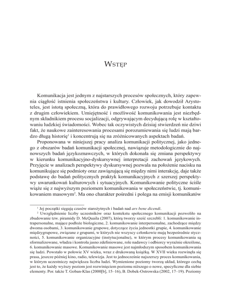 Wstęp Komunikacja jest jednym z najstarszych procesów społecznych, który zapewnia ciągłość istnienia społeczeństwa i kultury. Człowiek, jak dowodził Arystoteles, jest istotą społeczną, która do prawidłowego rozwoju potrzebuje kontaktu z drugim człowiekiem. Umiejętność i możliwość komunikowania jest niezbędnym składnikiem procesu socjalizacji, odgrywającym decydującą rolę w kształtowaniu ludzkiej świadomości. Wobec tak oczywistych dzisiaj stwierdzeń nie dziwi fakt, że naukowe zainteresowania procesami porozumiewania się ludzi mają bardzo długą historię1 i koncentrują się na zróżnicowanych aspektach badań. Proponowana w niniejszej pracy analiza komunikacji politycznej, jako jednego z obszarów badań komunikacji społecznej, nawiązuje metodologicznie do najnowszych badań językoznawczych, w których dokonała się zmiana perspektywy w kierunku komunikacyjno-dyskursywnej interpretacji zachowań językowych. Przyjęcie w analizach perspektywy dyskursywnej pozwala na położenie nacisku na komunikujące się podmioty oraz zawiązującą się między nimi interakcję, daje także podstawę do badań politycznych praktyk komunikacyjnych z szerszej perspektywy uwarunkowań kulturowych i sytuacyjnych. Komunikowanie polityczne ściśle wiąże się z najwyższym poziomem komunikowania w społeczeństwie, tj. komunikowaniem masowym2. Ma ono charakter pośredni i polega na emisji komunikatów Jej początki sięgają czasów starożytnych i badań nad ars bene dicendi. Uwzględnienie liczby uczestników oraz kontekstu społecznego komunikacji pozwoliło na zbudowanie tzw. piramidy D. McQuaila (2007), którą tworzy sześć szczebli: 1. komunikowanie intrapersonalne, mające podłoże biologiczne, 2. komunikowanie interpersonalne, zachodzące między dwoma osobami, 3. komunikowanie grupowe, dotyczące życia jednostki grupie, 4. komunikowanie międzygrupowe, związane z grupami, w których nie wszyscy członkowie mają bezpośrednie styczności, 5. komunikowanie organizacyjne (instytucjonalne), w którym procesy komunikowania są sformalizowane, władza i kontrola jasno zdefiniowane, role nadawcy i odbiorcy wyraźnie określone, 6. komunikowanie masowe. Komunikowanie masowe jest najmłodszym sposobem komunikowania się ludzi. Powstało w połowie XV wieku, wraz z drukowaną książką. W XVII wieku rozwinęła się prasa, jeszcze później kino, radio, telewizja. Jest to jednocześnie najszerszy proces komunikowania, w którym uczestniczy największa liczba ludzi. Wymienione poziomy tworzą układ, którego cechą jest to, że każdy wyższy poziom jest rozwinięciem poziomu niższego o nowe, specyficzne dla siebie elementy. Por. także T. Goban-Klas (2000[b], 15–16), B. Dobek-Ostrowska (2002, 17–19). Poziomy 1 2 10 W stęp od nadawcy medialnego do publiczności środków masowego przekazu za pośrednictwem mediów. Obecność mediów masowych3 we współczesnym życiu społecznym jest jedną z konstytutywnych cech demokracji. Najpierw prasa, potem radio i telewizja stały się ogólnie dostępne. Kluczowymi zatem kategoriami określającymi kulturowy rozwój współczesnego społeczeństwa postmodernistycznego (Ożóg 2006; 2007; 2010) stały się informacja i media, stąd też cywilizacja określana jest wiekiem informacji, a społeczeństwo – społeczeństwem informacyjnym bądź też społeczeństwem medialnym4. Informacja jest dziś podstawą życia ekonomicznego, społecznego, kulturalnego i politycznego, co w dużej mierze wpływa na zmianę modelu zachowań (także językowych) oraz sposób myślenia charakteryzujący się otwartością i kreatywnością (Żydek-Bednarczuk 2007, 23). Fakt, iż dominującą współcześnie formę kontaktów społecznych stanowią kontakty zapośredniczone przez media, spowodował ogromny wzrost zainteresowania językoznawców tym środkiem przekazu i zaowocował wielością opracowań, w których obręb wpisuje się także niniejsza praca. Spowodowane zaostrzającą się konkurencją rynkową przeobrażenia w sferze medialnej, które nastąpiły w Polsce na przełomie wieków, przyczyniły się nie tylko do modyfikacji znanych i rozwoju nowych form przekazu wykorzystywanych w pracy dziennikarskiej (Żydek-Bednarczuk 2004[b]; Wolny-Zmorzyński 2009; Wojtak 2009), lecz wywołały także zmianę rozumienia roli mediów, dla których telewidz czy radiosłuchacz stał się klientem. Istotę współczesnej komunikacji politycznej określa fakt, iż polityka to nie tyle sfera poszukiwania prawdy, wymiany informacji dotyczących faktów, ile postaw dotyczących wartości. Z tego względu w komunikacji politycznej ważną rolę odgrywają te narzędzia komunikowania, które odwołują się nie do komunikacji jednokierunkowej, lecz do komunikacji dwukierunkowej, a więc do komunikacji interaktywnej5. te uzależnione są od typu sytuacji, w której odbywa się komunikacja, dlatego niektórzy badacze nie nazywają tego poziomami, lecz rodzajami kontekstów komunikacyjnych. Por. B. Sobkowiak (2005, 19). Rozwój nowych technologii zmobilizował badaczy do wyodrębnienie pośrednich poziomów komunikowania, np. W. Głodowski (2006, 63) wyodrębnił poziom komunikowania interpersonalno-medialnego, łączącego cechy obu poziomów (użycie urządzeń technicznych z natychmiastowym sprzężeniem zwrotnym). We współczesnych mediach ten typ komunikowania obecny jest np. w programie publicystycznym TVN 24 pt. Szkło kontaktowe. 3 Na swoistą całość mediów, tzw. mediosferę składają się: media masowe (prasa, radio, telewizja), media telekomunikacyjne (telefon, Internet) oraz multimedia (CD-ROM-y, rzeczywistość wirtualna). Por. A. Lepa (2011). 4 Cykl modernizacyjny społeczeństwa składa się z pięć etapów: 1. społeczeństwo tradycyjne, 2. społeczeństwo na poły uprzemysłowione, 3. społeczeństwo przemysłowe (nowoczesne), 4. społeczeństwo poprzemysłowe (ponowoczesne), 5. społeczeństwo informacyjne (postmod