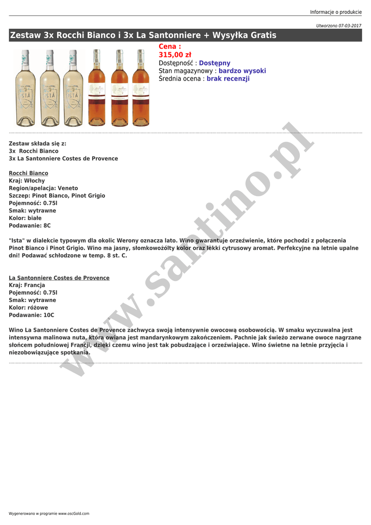 Informacje o produkcie Utworzono 07-03-2017 Zestaw 3x Rocchi Bianco i 3x La Santonniere + Wysyłka Gratis Cena : 315,00 zł Dostępność : Dostępny Stan magazynowy : bardzo wysoki Średnia ocena : brak recenzji pl Zestaw składa się z: 3x Rocchi Bianco 3x La Santonniere Costes de Provence an t in o. Rocchi Bianco Kraj: Włochy Region/apelacja: Veneto Szczep: Pinot Bianco, Pinot Grigio Pojemność: 0.75l Smak: wytrawne Kolor: białe Podawanie: 8C "Ista" w dialekcie typowym dla okolic Werony oznacza lato. Wino gwarantuje orzeźwienie, które pochodzi z połączenia Pinot Bianco i Pinot Grigio. Wino ma jasny, słomkowożólty kolor oraz lekki cytrusowy aromat. Perfekcyjne na letnie upalne dni! Podawać schłodzone w temp. 8 st. C. w .s La Santonniere Costes de Provence Kraj: Francja Pojemność: 0.75l Smak: wytrawne Kolor: różowe Podawanie: 10C w w Wino La Santonniere Costes de Provence zachwyca swoją intensywnie owocową osobowością. W smaku wyczuwalna jest intensywna malinowa nuta, która owiana jest mandarynkowym zakończeniem. Pachnie jak świeżo zerwane owoce nagrzane słońcem południowej Francji, dzięki czemu wino jest tak pobudzające i orzeźwiające. Wino świetne na letnie przyjęcia i niezobowiązujące spotkania. Wygenerowano w programie www.oscGold.com