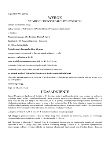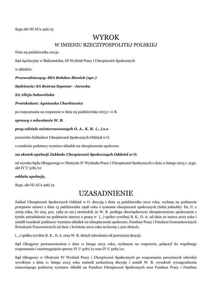 Sygn.akt III AUa 496/13 WYROK W IMIENIU RZECZYPOSPOLITEJ POLSKIEJ Dnia 29 października 2013r. Sąd Apelacyjny w Białymstoku, III Wydział Pracy i Ubezpieczeń Społecznych w składzie: Przewodniczący: SSA Bohdan Bieniek (spr.) Sędziowie: SA Bożena Szponar - Jarocka SA Alicja Sołowińska Protokolant: Agnieszka Charkiewicz po rozpoznaniu na rozprawie w dniu 29 października 2013 r. w B. sprawy z odwołania W. B. przy udziale zainteresowanych O. A., K. B. (...) s.c. przeciwko Zakładowi Ubezpieczeń Społecznych Oddział w O. o ustalenie podstawy wymiaru składek na ubezpieczenia społeczne na skutek apelacji Zakładu Ubezpieczeń Społecznych Oddział w O. od wyroku Sądu Okręgowego w Olsztynie IV Wydziału Pracy i Ubezpieczeń Społecznych z dnia 11 lutego 2013 r. sygn. akt IV U 3181/12 oddala apelację. Sygn. akt III AUa 496/13 UZASADNIENIE Zakład Ubezpieczeń Społecznych Oddział w O. decyzją z dnia 15 października 2012 roku, wydaną na podstawie przepisów ustawy z dnia 13 października 1998 roku o systemie ubezpieczeń społecznych (tekst jednolity: Dz. U. z 2009 roku, Nr 205, poz. 1585 ze zm.) stwierdził, że W. B. podlega obowiązkowym ubezpieczeniom społecznym z tytułu zatrudnienia na podstawie umowy o pracę w (...) spółce cywilnej B. K., O. A. od dnia 10 marca 2012 roku i ustalił wysokość podstawy wymiaru składek na ubezpieczenie społeczne, Fundusz Pracy i Fundusz Gwarantowanych Świadczeń Pracowniczych od dnia 1 kwietnia 2012 roku na kwotę 1.500 złotych. (...) spółka cywilna B. K., O. A. oraz W. B. złożyli odwołania od powyższej decyzji. Sąd Okręgowy postanowieniem z dnia 11 lutego 2013 roku, wydanym na rozprawie, połączył do wspólnego rozpoznania i rozstrzygnięcia sprawy IV U 3181/12 oraz IV U 3182/12. Sąd Okręgowy w Olsztynie IV Wydział Pracy i Ubezpieczeń Społecznych po rozpoznaniu powyższych odwołań wyrokiem z dnia 11 lutego 2013 roku zmienił zaskarżoną decyzję i ustalił W. B. wysokość wynagrodzenia stanowiącego podstawę wymiaru składki na Fundusz Ubezpieczeń Społecznych oraz Fundusz Pracy i Fundusz Gwarantowanych Świadczeń Pracowniczych od miesiąca 1 kwietnia 2012 roku na 3.400 złotych. Sąd Okręgowy ustalił, że wnioskodawczyni została zatrudniona na podstawie umowy o pracę na czas określony w Bistro C.. W dniu 10.03.2012 r. stosunek pracy został zawarty na ½ wymiaru czasu pracy. Wnioskodawczyni powierzono obowiązki barmana – kelnera. Wynagrodzenie ustalono na kwotę 9 złotych za godzinę. Po upływie czasu, na jaki została zawarta nowa umowa o pracę w dniu 1.04.2012 r. na czas określony do dnia 31.03.2015 r. Tym razem skarżącej powierzono obowiązki menadżera restauracji. Wynagrodzenie określono na kwotę 3.400 złotych. Zgodnie z umową, do obowiązków W. B. należało zarządzanie pozostałymi pracownikami, organizowanie przyjęć, spotkań i imprez okolicznościowych, zarządzanie zapasami i ustalanie grafiku pracy oraz prowadzenie spraw finansowych. W kwietniu i maju 2012 roku w (...) spółce cywilnej było zatrudnionych czterech pracowników (wnioskodawczyni za wynagrodzeniem 3.400 złotych, A. B. i K. K. (2) za wynagrodzeniem 9 złotych na godzinę, E. B. za wynagrodzeniem 1.500 złotych). Spółka cywilna (...) za rok 2011 wykazała w Urzędzie Skarbowym stratę w kwocie 45.211,08 złotych. Na ujemny wynik finansowy spółki miała wpływ umowa pożyczki udzielona przez (...) w W.. M. H., prowadzący Biuro Usług (...) prowadził (...) S.C. Bistro C.. Listę płac za miesiąc kwiecień sporządził w dniu 5.05.2012 r. Raport za miesiąc kwiecień został wysłany do ZUS w terminie, to jest 15.06.2012 r. W dniu 17.05.2012 r. wnioskodawczyni zgłosiła się do lekarza ginekologa. Ze sporządzonej karty ciąży wynikało, że W. B. ostatnią miesiączkę miała w dniu 29.02.2012 r., a spodziewaną datę porodu określono na 6.12.2012 r. Następnego dnia, to jest 18.05.2012 r. skarżąca trafiła do szpitala, gdzie przebywała do 21.05.2012 r. Decyzją z dnia 7.09.2012 r. organ rentowy stwierdził, że W. B. nie podlega obowiązkowym ubezpieczeniom społecznym jako pracownik u płatnika składek Bistro C. od dnia 10.03.2012 r. Następnie decyzją z dnia 15.10.2012 r. uchylono decyzję z dnia 7.09.2012 r. Mając na uwadze powyżej ustalony stan faktyczny, Sąd Okręgowy stwierdził, że nie był on sporny pomiędzy stronami. Organ rentowy w czasie postępowania nie kwestionował wprost, że wnioskodawczyni wykonywała obowiązki menadżera, a wynagrodzenie w kwocie 3.400 złotych ustalono w chwili zawarcia umowy o pracę, to jest w dniu 1.04.2012 r. W decyzji i odwołaniu podkreślono jednak, że dokumenty rozliczeniowe za miesiąc kwiecień 2012 r. zostały złożone do ZUS w dniu 16.06.2012 r. Należy jednak zauważyć, że płatnik składek uczynił to zgodnie z przepisem art. 47 ust 1 pkt 3 ustawy o systemie ubezpieczeń społecznych. Staje się to zrozumiałe, jeżeli uwzględni się, że wynagrodzenie za miesiąc kwiecień zostało wypłacone w maju 2012 r. Oznacza to, że wypłacone wynagrodzenie jest rozliczane dokumentami z ZUS do 15 następnego miesiąca. W tym kontekście, w ocenie Sądu Okręgowego, warto było podkreślić, że w sprawie brak jakiegokolwiek dowodu, że strony umowy o pracę zawarły ją i ustaliły wysokość wynagrodzenia na kwotę 3.400 złotych po dniu 1.04.2012 r., a w szczególności po dniu 18.05.2012 r. Sąd nie miał podstaw, aby odmówić wiary świadkowi M. H., prowadzącemu Biuro Usług (...), że sporządził listę płac za kwiecień w dniu 5.05.2012 r., a zatem jeszcze przed potwierdzeniem stanu ciąży wnioskodawczyni. Oznaczało to, że twierdzenia ZUS zawarte w uzasadnieniu decyzji na temat celowego zawarcia umowy o pracę od 1.04.2012 r. i zatrudnieniu skarżącej na stanowisku menadżera nie były zasadne. Zważywszy, że to na organie rentowym spoczywał obowiązek wykazania zamiaru wyłudzenia świadczeń z ubezpieczenia chorobowego, Sąd O