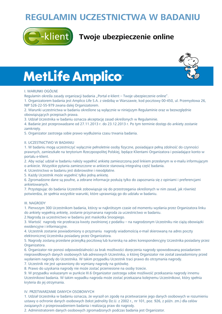 REGULAMIN UCZESTNICTWA W BADANIU Twoje ubezpieczenie online I. WARUNKI OGÓLNE Regulamin określa zasady organizacji badania „Portal e-klient – Twoje ubezpieczenie online”. 1. Organizatorem badania jest Amplico Life S.A. z siedzibą w Warszawie, kod pocztowy 00-450, ul. Przemysłowa 26, NIP 526-22-55-979 zwana dalej Organizatorem. 2. Warunki uczestnictwa w badaniu określone są wyłącznie w niniejszym Regulaminie oraz w bezwzględnie obowiązujących przepisach prawa. 3. Udział Uczestnika w badaniu oznacza akceptację zasad określonych w Regulaminie. 4. Badanie jest przeprowadzane od 27.11.2013 r. do 23.12.2013 r. Po tym terminie dostęp do ankiety zostanie zamknięty. 5. Organizator zastrzega sobie prawo wydłużenia czasu trwania badania. II. UCZESTNICTWO W BADANIU 1. W badaniu mogą uczestniczyć wyłącznie pełnoletnie osoby fizyczne, posiadające pełną zdolność do czynności prawnych, zamieszkałe na terytorium Rzeczpospolitej Polskiej, będące Klientami Organizatora i posiadające konto w portalu e-klient. 2. Aby wziąć udział w badaniu należy wypełnić ankietę zamieszczoną pod linkiem przesłanym w e-mailu informującym o ankiecie. Wszystkie pytania zamieszczone w ankiecie stanowią integralną część badania. 4. Uczestnictwo w badaniu jest dobrowolne i nieodpłatne. 5. Każdy Uczestnik może wypełnić tylko jedną ankietę. 6. Zgromadzone dane są poufne, a zebrane informacje posłużą tylko do zapoznania się z opiniami i preferencjami ankietowanych. 7. Przystępując do badania Uczestnik zobowiązuje się do przestrzegania określonych w nim zasad, jak również potwierdza, że spełnia wszystkie warunki, które uprawniają go do udziału w badaniu. III. NAGRODY 1. Pierwszym 300 Uczestnikom badania, którzy w najkrótszym czasie od momentu wysłania przez Organizatora linku do ankiety wypełnią ankietę, zostanie przyznanana nagroda za uczestnictwo w badaniu. 2.Nagrodą za uczestnictwo w badaniu jest maskotka Snoopiego. 3. Wartość nagrody nie przekracza kwoty zwolnionej z podatku – na nagrodzonym Uczestniku nie ciążą obowiązki ewidencyjne i informacyjne. 4. Uczestnik zostanie powiadomiony o przyznaniu nagrody wiadomością e-mail skierowaną na adres poczty elektronicznej Uczestnika posiadany przez Organizatora. 5. Nagrody zostaną przesłane przesyłką pocztową lub kurierską na adres korespondencyjny Uczestnika posiadany przez Organizatora. 6. Organizator nie ponosi odpowiedzialności za brak możliwości doręczenia nagrody spowodowaną posiadaniem nieprawidłowych danych osobowych lub adresowych Uczestnika, o której Organizator nie został zawiadomiony przed wysłaniem nagrody do Uczestnika. W takim przypadku Uczestnik traci prawo do otrzymania nagrody. 7. Uczestnik nie jest uprawniony do wymiany nagrody na gotówkę. 8. Prawo do uzyskania nagrody nie może zostać przeniesione na osoby trzecie. 9. W przypadku wskazanym w punkcie III.6 Organizator zastrzega sobie możliwość przekazania nagrody innemu Uczestnikowi badania. W takim wypadku nagroda może zostać przekazana kolejnemu Uczestnikowi, który spełnia kryteria do jej otrzymania. IV. PRZETWARZANIE DANYCH OSOBOWYCH 1. Udział Uczestnika w badaniu oznacza, że wyraził on zgodę na przetwarzanie jego danych osobowych w rozumieniu ustawy o ochronie danych osobowych (tekst jednolity Dz.U. z 2002 r., nr 101, poz. 926, z późn. zm.) dla celów związanych z przeprowadzeniem badania i realizacją praw do nagrody. 2. Administratorem danych osobowych zgromadzonych podczas badania jest Organizator. Powered by TCPDF (www.tcpdf.org) V. REKLAMACJE 1. Prawo do składania reklamacji, w zakresie niezgodności przeprowadzenia badania lub przyznania nagrody z niniejszym Regulaminem, służy każdemu Uczestnikowi w ciągu 7 (siedmiu) dni od daty zakończenia badania. 2. Zgłoszenie reklamacji powinno zawierać imię, nazwisko oraz adres reklamującego, a także wskazanie podstaw reklamacji wraz z uzasadnieniem. 3. Reklamacje należy zgłaszać w formie pisemnej na adres Organizatora. 4. Reklamacja zostanie rozpatrzona przez organizatora w ciągu 30 (trzydziestu) dni od jej otrzymania. 5. Odpowiedź na reklamację zostanie przesłana w formie pisemnej na adres podany przez Uczestnika badania składającego reklamacje. VI. POSTANOWIENIA KOŃCOWE 1. Zabrania się Uczestnikom przesyłania w związku z udziałem w badaniu, treści sprzecznych z prawem lub łamiących normy społeczne i obyczajowe, w tym w szczególności: a) treści powszechnie uznawanych za wulgarne i obraźliwe, b) treści obrażających uczucia innych osób, w tym również uczucia religijne, c) treści prezentujących przemoc albo tematykę rasistowską, d) treści naruszających prawo do prywatności, e) treści zawierających materiały chronione prawem własności intelektualnej bez zgody posiadacza praw. 2. Organizator nie ponosi odpowiedzialności za naruszenia w jakikolwiek sposób przez Uczestników majątkowych praw autorskich, praw własności intelektualnej lub dóbr osobistych osób trzecich. 3. Organizator zastrzega sobie prawo do żądania natychmiastowego zaprzestania działań dokonywanych przez Uczestnika, które nie są zakazane przez Regulamin, jednak mogą godzić w interesy Organizatora lub innych Uczestników. Odmowa zastosowania się do takiego zadania przez Uczestnika badania będzie w takim przypadku uznana za naruszenie Regulaminu. 4. W razie wykrycia jakichkolwiek nieprawidłowości w zachowaniach Uczestników, które mogłyby mieć potencjalnie wpływ na wynik badania, Organizator zastrzega sobie prawo wykluczenia z badania Uczestników, co do których istnieje uzasadnione podejrzenie, że próbowali w niedozwolony sposób wpływać na przebieg badania lub dopuścili się naruszenia Regulaminu, a także, w sytuacjach szczególnych, do przerwania badania. 5. Organizator zastrzega sobie prawo zmiany niniejszego Regulaminu w każdym czasie bez podania przyczyny, jeżeli nie będzie miało to wpływu na pra