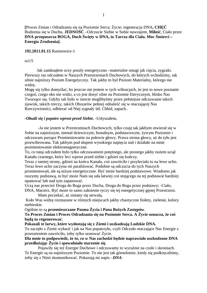 1 [Proces Zmian i Odradzania się na Poziomie Serca; Życie; regeneracja DNA, CHĘĆ Budzenia się w Duchu, JEDNOŚĆ –Odczucie Siebie w Sobie nawzajem, Miłość, Ciało przez DNA przepuszcza BOGA, Duch Święty w DNA, to Tarcza dla Ciała. Moc Śmierci – Energia Zrodzenia]. 192.2011.01.15 Rusinowice-1 ss1/5 Jak zamknąłem oczy poszły energetyczno –materialne smugi jak cięcia, zygzaki. Pierwszy raz odczułem w Naszych Przestrzeniach Duchowych, do których wchodzimy, tak silnie najniższy Poziom Energetyczny. Tak jakby to był Poziom Materialny, którego nie widzę. Mogę się tylko domyślać, bo jeszcze nie jestem w tych wibracjach, że jest to nowe poznanie czegoś, czego oko nie widzi, a co jest dosyć silne na Poziomie Eterycznym, blisko Nas Tworzące się. Gdyby tak było w istocie moglibyśmy przez pełniejsze odczuwanie takich zjawisk, takich rzeczy, takich Obszarów pełniej odnaleźć się w otaczającej Nas Rzeczywistości, odbierać od Niej sygnały itd. Chłód, zapach.. -Obudź się i popatrz wprost przed Siebie. -Usłyszałem. -Ja nie jestem w Przestrzeniach Duchowych, tylko czuję tak jakbym otwierał się w Sobie na najniższym, niemal dziewiczym, brutalnym, podstawowym, żywym Poziomie i odczuwam parzące Promieniowanie na połowie głowy. Prawa strona głowy, aż do tyłu jest przewibrowana. Tak jakbym pod słupem wysokiego napięcia stał i działało na mnie promieniowanie elektromagnetyczne. To, co tutaj odczułem było tylko odczuwaniem potężnego, ale prostego jakby nożem uciął Kanału czarnego, który leci wprost przed siebie i gdzieś się kończy. Teraz z tamtej strony, gdzieś na końcu Kanału, coś zawróciło i przyleciało tu na lewe ucho. Teraz lewe ucho zaczyna mi paraliżować. Podobne są odczucia do tych Naszych promieniowań, ale są niższe energetycznie. Być może bardziej podstawowe. Wiadomo jak ruszymy podstawą, to być może Nam się uda łatwiej coś stojącego na tej podstawie bardziej opanować lub nad tym zapanować. Uczą nas przecież Droga do Boga przez Ducha, Droga do Boga przez podstawy; -Ciało, DNA, Macierz. Być może to samo założenie tyczy się tej energetycznej gęstej Przestrzeni. Mam poczekać, aż zmiany się utrwalą. Koło Was widzę rozmazane w różnych miejscach jakby chaotyczne fiolety, zielenie, kolory niebieskie. Ogólnie to są przemieszczane Pasma Życia i Pana Bożych Zastępów. To Proces Zmian i Proces Odradzania się na Poziomie Serca. A Życie oznacza, że coś będą tu regenerować. Pokazali te larwy, które wydostają się z Ziemi i uszkadzają Ludzkie DNA. To zaczęło z Ziemi wyłazić i jak na Nas popatrzyło, czyli Odczuło otaczające Nas Energie z przerażeniem zawróciło, żeby tylko uratować Życie. Dla mnie to podpowiedź, że to, co w Nas zachodzi będzie naprawiało uszkodzone DNA przedłużając Życie i spowolniało starzenie się. Pojawiły się też Energie Duchowe i odczuwamy to wyraźnie na czole i skroniach. Te Energie są na najniższym Poziomie. To nie jest tak górnolotnie, kiedy się podkręcaliśmy, żeby się z Nimi skomunikować. Pokazują mi napis –DNA. 2 To jest tak jakby Energie Duchowe mogły także na najgęstszym w Nas Poziomie energetycznym także się ujawnić, czyli także się w Nas obudzić, przeprowadzić Procesy Zmiany, o które chodzi. A skoro mówią DNA i pokazują znak Omegi, ale bardziej koła, to być może Koło się zamyka. Więc to coś, co Nas stanowiło, a więc podążanie ku Bogu poprzez Ducha i poprzez DNA w tej chwili stało się jakby takim Jego Odnalezieniem, Jego właściwym postrzeganiem. To oznacza, że przy rozłożonych rękach zamkniemy Całe Nasze Duchowe KOŁO i już nie będzie potrzeby analizowania sposobu, w jaki mamy się z Nim skontaktować, ponieważ na Nasze Życzenie Wszystko w Nas od razu będzie tę Drogę, która już jest w Nas właściwie widzieć. Czyli budzenie się w Nim nie będzie już techniką, tylko CHĘCIĄ. -Jestem, Budzę się w Odczuwaniu Ojca, w Odczuwaniu Pasm Duchowych, bo przecież w Nim i tak jesteśmy Mówimy o Odczuciu, o Doświadczeniu. -Skup się. Chcemy Ci coś powiedzieć, ale nie jesteś na to, -nie tyle przygotowany, co -zaprogramowany. –Słyszę. -Musimy Ci powiedzieć, że nie wszystko to, co mówisz jest Prawdą. Ale ujęcie tego jest właściwe na ten czas, w sensie; -rozwiązań. -Pewne rzeczy są ukryte. -W takim w sensie, że nie mogą być jeszcze w pełni -ujawione, albo nie można się nimi jeszcze posłużyć, albo przez Nie przechodzić. Niemniej na ten czas pewne treści są ukryte i wzmiankowanie o Nich, powiedzieli wprost; -i gadanie o Nich ma swój sens. -Pokazują Nam tu ręce i pokazują fizyczne ręce. Ta jedna ręka się starzeje. Jest coraz starsza, pomarszczona, a druga jest pełna Światła. Pokazują, że jak to Światło przenika na tę rękę fizyczną starzejącą się, to ona wygląda bardzo ładnie, czysto fizycznie. Porównywalnie do ręki ze Światłem. Pokazują, tylko ta ze światła jest ważna. Nasz Poziom na razie to, co idzie przeze mnie odpowiada czyszczeniu, łagodzeniu, Odradzaniu się tej fizycznej ręki i jest dopiero wchodzeniem w Pasma Światła. Dlatego pewne rzeczy w Przyszłości będą pełniejsze i -podpowiadają; -i jednoznaczne. W tej chwili jest to raczej taka forma alternatywy, kiedy do tego czegoś, w przyszłości, co będzie jednoznaczne, w tej chwili można dojść nie tylko w ten sposób, o którym mówię, ale i także w inny. Niemniej jest to jedna z właściwych Dróg. -TAK. Kiwnęli głowa i pokazali to wielkie słowo. -Ale nie jedyną. Natomiast koniec tej Drogi jest jedyny. Powiedzielibyśmy; -wszystkie Drogi prowadzą do Rzymu, wszystkie Drogi prowadzą do Ojca. Finał Dojście jest Jedno. -Siądźcie Jemu na kolanach, uklęknijcie, przytulcie się i powiedzcie; -Cześć Stary. Wreszcie mam odwagę Ci powiedzieć, tak jak lubię; -Cześć Stary. A On powie; -Witaj, Brachu. Ktoś mi powiedział z boku; -Coś się stanie. Jest