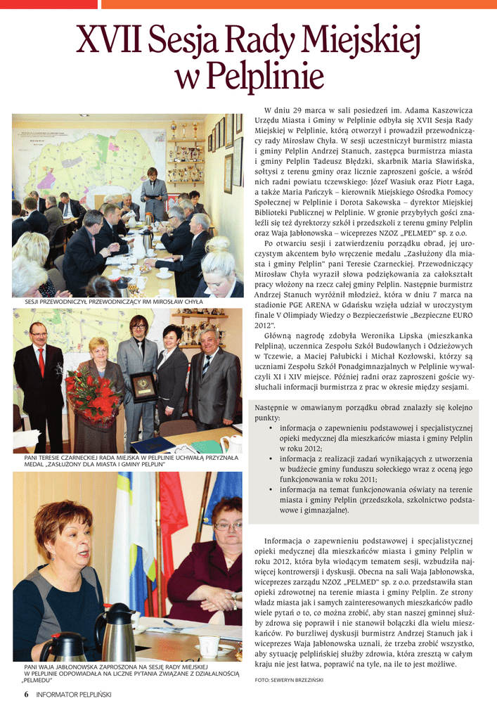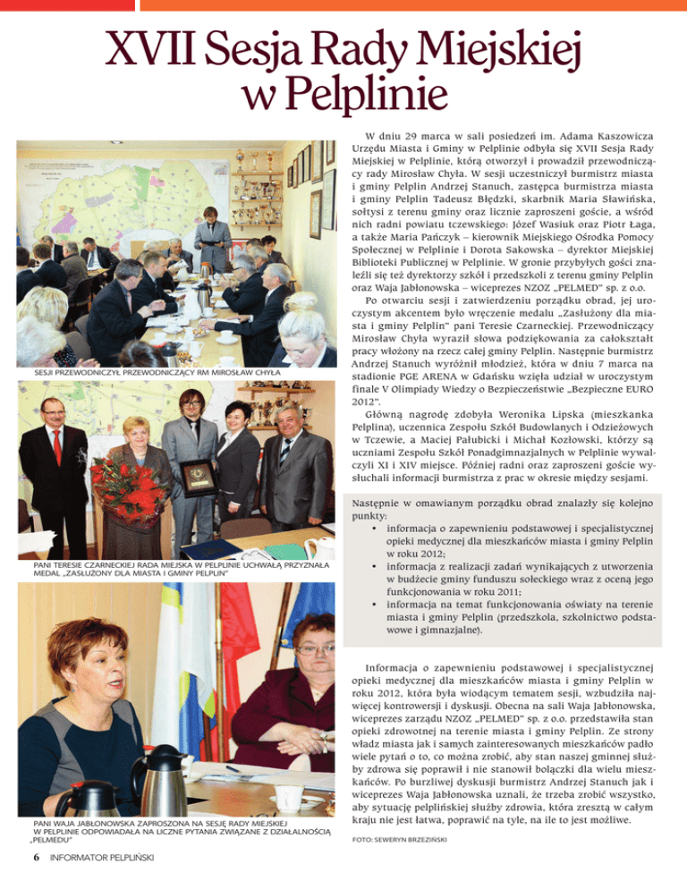 XVII Sesja Rady Miejskiej w Pelplinie sesji przeWodniczył przeWodniczący rm mirosłaW chyła pani teresie czarneckiej rada miejska W pelplinie uchWałą przyznała medal „zasłużony dla miasta i gminy pelplin” pani Waja jaBłonoWska zaproszona na sesję rady miejskiej W pelplinie odpoWiadała na liczne pytania zWiązane z działalnością „pelmedu” 6 INFORMATOR PELPLIŃSKI W dniu 29 marca w sali posiedzeń im. Adama Kaszowicza Urzędu Miasta i Gminy w Pelplinie odbyła się XVII Sesja Rady Miejskiej w Pelplinie, którą otworzył i prowadził przewodniczący rady Mirosław Chyła. W sesji uczestniczył burmistrz miasta i gminy Pelplin Andrzej Stanuch, zastępca burmistrza miasta i gminy Pelplin Tadeusz Błędzki, skarbnik Maria Sławińska, sołtysi z terenu gminy oraz licznie zaproszeni goście, a wśród nich radni powiatu tczewskiego: Józef Wasiuk oraz Piotr Łaga, a także Maria Pańczyk – kierownik Miejskiego Ośrodka Pomocy Społecznej w Pelplinie i Dorota Sakowska – dyrektor Miejskiej Biblioteki Publicznej w Pelplinie. W gronie przybyłych gości znaleźli się też dyrektorzy szkół i przedszkoli z terenu gminy Pelplin oraz Waja Jabłonowska – wiceprezes NZOZ „PELMED” sp. z o.o. Po otwarciu sesji i zatwierdzeniu porządku obrad, jej uroczystym akcentem było wręczenie medalu „Zasłużony dla miasta i gminy Pelplin” pani Teresie Czarneckiej. Przewodniczący Mirosław Chyła wyraził słowa podziękowania za całokształt pracy włożony na rzecz całej gminy Pelplin. Następnie burmistrz Andrzej Stanuch wyróżnił młodzież, która w dniu 7 marca na stadionie PGE ARENA w Gdańsku wzięła udział w uroczystym finale V Olimpiady Wiedzy o Bezpieczeństwie „Bezpieczne EURO 2012”. Główną nagrodę zdobyła Weronika Lipska (mieszkanka Pelplina), uczennica Zespołu Szkół Budowlanych i Odzieżowych w Tczewie, a Maciej Pałubicki i Michał Kozłowski, którzy są uczniami Zespołu Szkół Ponadgimnazjalnych w Pelplinie wywalczyli XI i XIV miejsce. Później radni oraz zaproszeni goście wysłuchali informacji burmistrza z prac w okresie między sesjami. Następnie w omawianym porządku obrad znalazły się kolejno punkty: • informacja o zapewnieniu podstawowej i specjalistycznej opieki medycznej dla mieszkańców miasta i gminy Pelplin w roku 2012; • informacja z realizacji zadań wynikających z utworzenia w budżecie gminy funduszu sołeckiego wraz z oceną jego funkcjonowania w roku 2011; • informacja na temat funkcjonowania oświaty na terenie miasta i gminy Pelplin (przedszkola, szkolnictwo podstawowe i gimnazjalne). Informacja o zapewnieniu podstawowej i specjalistycznej opieki medycznej dla mieszkańców miasta i gminy Pelplin w roku 2012, która była wiodącym tematem sesji, wzbudziła najwięcej kontrowersji i dyskusji. Obecna na sali Waja Jabłonowska, wiceprezes zarządu NZOZ „PELMED” sp. z o.o. przedstawiła stan opieki zdrowotnej na terenie miasta i gminy Pelplin. Ze strony władz miasta jak i samych zainteresowanych mieszkańców padło wiele pytań o to, co można zrobić, aby stan naszej gminnej służby zdrowa się poprawił i nie stanowił bolączki dla wielu mieszkańców. Po burzliwej dyskusji burmistrz Andrzej Stanuch jak i wiceprezes Waja Jabłonowska uznali, że trzeba zrobić wszystko, aby sytuację pelplińskiej służby zdrowia, która zresztą w całym kraju nie jest łatwa, poprawić na tyle, na ile to jest możliwe. foto: seWeryn Brzeziński