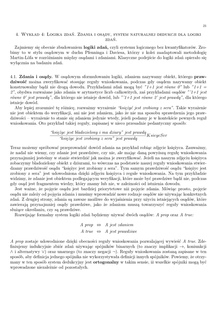21 4. Wyk≥ad 4: Logika zdaÒ. Zdania i osπdy, system naturalnej dedukcji dla logiki zdaÒ. Zajmiemy siÍ obecnie zbudowaniem logiki zdaÒ, czyli systemu logicznego bez kwantyfikatorów. Zrobimy to w stylu osπdowym w duchu Pfenninga i Daviesa, którzy z kolei zaadaptowali metodologiÍ Martin-Löfa w rozróønianiu miÍdzy osπdami i zdaniami. Klasyczne podejúcie do logiki zdaÒ opiera≥o siÍ wy≥πcznia na badaniu zdaÒ. 4.1. Zdania i osπdy. W osπdowym sformu≥owaniu logiki, zdaniem nazywamy obiekt, którego prawdziwoúÊ moøna zweryfikowaÊ stosujπc regu≥y wnioskowania, podczas gdy osπdem nazywamy obiekt konstruowalny bπdü nie drogπ dowodu. Przyk≥adami zdaÒ mogπ byÊ ”1+1 jest równe 0” lub ”1+1 = 2”, obydwa rozwaøane jako zdania w arytmetyce liczb ca≥kowitych, zaú przyk≥adami osπdów ”’1+1 jest równe 0’ jest prawdπ”, dla którego nie istnieje dowód, lub ”’1+1 jest równe 2’ jest prawdπ”, dla którego istnieje dowód. Aby lepiej zrozumieÊ tÍ róønicÍ, rozwaømy wyraøenie “ksiÍøyÊ jest zrobiony z sera”. Takie wyraøenie nie jest obiektem do weryfikacji, ani nie jest zdaniem, jako øe nie ma sposobu sprawdzenia jego prawdziwoúci – wyraøenie to stanie siÍ zdaniem jedynie wtedy, jeøeli podamy je w kontekúcie pewnych regu≥ wnioskowania. Oto przyk≥ad takiej regu≥y, zapisanej w nieco przesadnie pedantyczny sposób: “ksiÍøyc jest bladozielony i ma dziury” jest prawdπ KsieycSer “ksiÍøyc jest zrobiony z sera” jest prawdπ Teraz moøemy spróbowaÊ przeprowadziÊ dowód zdania na przyk≥ad robiπc zdjÍcie ksiÍøyca. Zauwaømy, øe nadal nie wiemy, czy zdanie jest prawdziwe, czy nie, ale majπc danπ powyøszπ regu≥Í wnioskowania przynajmniej jesteúmy w stanie stwierdziÊ jak moøna je zweryfikowaÊ. Jeøeli na naszym zdjÍciu ksiÍøyca zobaczymy bladozielony obiekt z dziurami, to wówczas na podstawie naszej regu≥y wnioskowania stwierdzamy prawdziwoúÊ osπdu “ksiÍøyc jest zrobiony z sera”. Tym samym prawdziwoúÊ osπdu “ksiÍøyc jest zrobiony z sera” jest udowodniona dziÍki zdjÍciu ksiÍøyca i regule wnioskowania. Na tym przyk≥adzie widzimy, øe zdanie jest obiektem podlegajπcym weryfikacji, które moøe byÊ prawdziwe bπdü nie, podczas gdy osπd jest fragmentem wiedzy, który znamy lub nie, w zaleønoúci od istnienia dowodu. Jest waøne, øe pojÍcie osπdu jest bardziej priorytetowe niø pojÍcie zdania. Mówiπc prosto, pojÍcie osπdu nie zaleøy od pojÍcia zdania i musimy wprowadziÊ nowe rodzaje osπdów nie uøywajπc konkretnych zdaÒ. Z drugiej strony, zdania sπ zawsze moøliwe do wyjaúnienia przy uøyciu istniejπcych osπdów, które zawierajπ przynajmniej osπdy prawdziwe, jako øe zdaniom muszπ towarzyszyÊ regu≥y wnioskowania s≥uøπce okreúlaniu, czy sπ prawdziwe. Rozwijajπc formalny system logiki zdaÒ bÍdziemy uøywaÊ dwóch osπdów: A prop oraz A true: A prop , A jest zdaniem A true , A jest prawdziwe A prop zostaje udowodnione dziÍki obecnoúci regu≥y wnioskowania pozwalajπcej wywieúÊ A true. Zdefiniujemy indukcyjnie zbiór zdaÒ uøywajπc spójników binarnych (to znaczy implikacji !, koniunkcji ^ i alternatywy _) oraz unarnego (to znaczy negacji ¬). Regu≥y wnioskowania zostanπ zapisane w ten sposób, aby definicja jednego spójnika nie wykorzystywa≥a definicji innych spójników. Powiemy, øe otrzymany w ten sposób system dedukcyjny jest ortogonalny w takim sensie, iø wszelkie spójniki mogπ byÊ wprowadzone niezaleønie od pozosta≥ych. 22 Zadanie 6. Za≥óømy, øe ¬A jest zdaniem oznaczajπcym logicznπ negacjÍ zdania A oraz A false jest true osπdem oznaczajπcym “A nie moøe byÊ prawdziwe. Co jest z≥ego w regule ¬A A false ¬E majπcej wyjaúniaÊ A false pojÍcie fa≥szywych osπdów? A co z regu≥π ¬A true ¬I? _ B true Zadanie 7. Dlaczego regu≥a ¬A A ! B false ! I jest z≥a, poza tym, øe wyglπda doúÊ dziwnie? 4.2. System naturalnej dedukcji dla logiki zdaÒ. Naturalna dedukcja jest zasadπ budowania systemów logicznych których g≥ównymi pojÍciami sπ regu≥y wnioskowania wprowadzania oraz eliminacji. Regu≥a wprowadzania wyjaúnia w jaki sposób moøna wydedukowaÊ prawdziwy osπd wykorzystujπcy konkretny spójnik, przy uøyciu prawdziwych osπdów jako przes≥anek. Innymi s≥owy, regu≥a ta wyjaúnia, jak “wprowadziÊ” spójnik w procesie dedukcji. Na przyk≥ad, regu≥a wprowadzania dla spójnika koniunkcji wyglπda≥aby tak: ... ^I A ^ Btrue PojÍciem dualnym do regu≥y wprowadzania jest regu≥a eliminacji, która wyjaúnia w jaki sposób moøna wykorzystaÊ prawdziwy osπd wykorzystujπcy konkretny spójnik celem wywnioskowania innego osπdu. Innymi s≥owy, regu≥a ta wyjaúnia, jak “wyeliminowaÊ” spójnik w procesie dedukcji. Na przyk≥ad, regu≥a eliminacji dla spójnika koniunkcji wyglπda≥aby tak: A ^ Btrue ^E ... Regu≥a wprowadzania na ogó≥ pokrywa siÍ z intuicyjnym wyobraøeniem o dzia≥aniu danego spójnika i dlatego jest relatywnie prosta do zaprojektowania. Dla kontrastu, regu≥a eliminacji ekstrahuje informacjÍ reprezentowanπ przez osπd i jej zaprojektowanie wymaga szczególnej uwagi celem unikniÍcia sytuacji, w której dany system móg≥by byÊ sprzeczny. Na przyk≥ad, üle zaprojektowana regu≥a eliminacji moøe byÊ na tyle silna, øe bÍdzie ekstrahowa≥a nieprawdziwe informacje, których nie bÍdzie siÍ da≥o udowodniÊ przez odpowiadajπcπ regu≥Í wprowadzania. Z drugiej strony, üle zaprojektowana regu≥a eliminacji moøe byÊ zbyt s≥aba, aby wydedukowaÊ cokolwiek interesujπcego. Zauwaømy, øe regu≥a wprowadzania jest w pewnym sensie waøniejsza od regu≥y eliminacji, jako øe bez regu≥y wprowadzania nie ma sensu projektowaÊ odpowiedniej regu≥y eliminacji. Innymi s≥owy, regu≥a eliminacji nie moøe byÊ rozpatrywana w oderwaniu od odpowiadajπcej jej regu≥y wprowadzania, podczas gdy zaprojektowanie re