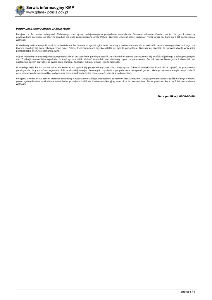 Serwis informacyjny KMP www.gdansk.policja.gov.pl PODPALACZ SAMOCHODU ZATRZYMANY Policjanci z Suchanina zatrzymali 39-letniego mężczyznę podejrzanego o podpalenie samochodu. Sprawca odpowie również za to, że groził śmiercią pracownikom parkingu, na którym znajdują się auta zabezpieczane przez Policję. Wczoraj usłyszał sześć zarzutów. Teraz grozi mu kara do 8 lat pozbawienia wolności. W niedzielę nad ranem policjanci z komisariatu na Suchaninie otrzymali zgłoszenie dotyczące pożaru samochodu suzuki swift zaparkowanego obok parkingu, na którym znajdują się auta zabezpieczone przez Policję. Funkcjonariusze szybko ustalili, że było to podpalenie. Okazało się również, że sprawca chwilę wcześniej przeciął kable m.in. telekomunikacyjne. Gdy w niedzielę rano funkcjonariusze przesłuchiwali pracowników parkingu ustalili, że kilka dni wcześniej awanturował się właściciel jednego z zabezpieczonych aut. Z relacji pracowników wynikało, że mężczyzna chciał odebrać samochód nie uiszczając opłat za parkowanie. Zaczął pracownikom grozić i stwierdził, że następnym razem przyjdzie po swoje auto z bronią. Policjanci od razu ustalili jego tożsamość. W międzyczasie ku ich zaskoczeniu, do komisariatu zgłosił się podejrzewany przez nich mężczyzna. 39-letni mieszkaniec Rumi chciał zgłosić, że pracownicy parkingu nie chcą wydać mu jego auta. Policjanci podejrzewając, że mają do czynienia z podpalaczem zatrzymali go. W trakcie przeszukania mężczyzny znaleźli przy nim atrapę broni, lornetkę, nożyce oraz inne przedmioty, które mogły mieć związek z podpaleniem. Policjanci z komisariatu zebrali materiał dowodowy na podstawie którego przedstawili 39-latkowi sześć zarzutów. Dotyczą one stosowania gróźb karalnych wobec poszczególnych osób, podpalenia samochodu, przecięcia kabli sieci telekomunikacyjnej oraz ukrycia dokumentów. Teraz grozi mu kara do 8 lat pozbawienia wolności. Data publikacji:0000-00-00 strona 1 / 1 Powered by TCPDF (www.tcpdf.org)