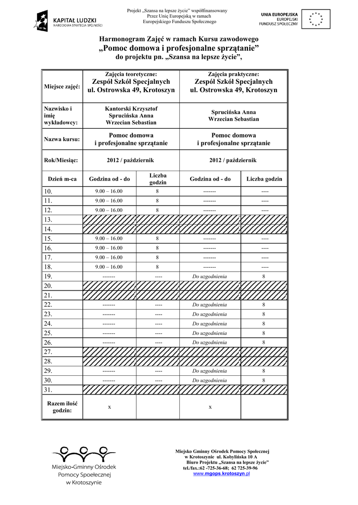 Projekt „Szansa na lepsze życie” współfinansowany Przez Unię Europejską w ramach Europejskiego Funduszu Społecznego Harmonogram Zajęć w ramach Kursu zawodowego „Pomoc domowa i profesjonalne sprzątanie” do projektu pn. „Szansa na lepsze życie”, Zajęcia teoretyczne: Zajęcia praktyczne: Miejsce zajęć: Zespół Szkół Specjalnych ul. Ostrowska 49, Krotoszyn Zespół Szkół Specjalnych ul. Ostrowska 49, Krotoszyn Nazwisko i imię wykładowcy: Kantorski Krzysztof Sprucińska Anna Wrzecian Sebastian Sprucińska Anna Wrzecian Sebastian Nazwa kursu: Pomoc domowa i profesjonalne sprzątanie Pomoc domowa i profesjonalne sprzątanie Rok/Miesiąc: 2012 / październik 2012 / październik Dzień m-ca 10. 11. 12. 13. 14. 15. 16. 17. 18. 19. 20. 21. 22. 23. 24. 25. 26. 27. 28. 29. 30. 31. Razem ilość godzin: Godzina od - do Liczba godzin Godzina od - do Liczba godzin 9.00 – 16.00 8 ------- ---- 9.00 – 16.00 8 ------- ---- 9.00 – 16.00 8 ------- ---- 9.00 – 16.00 8 ------- ---- 9.00 – 16.00 8 ------- ---- 9.00 – 16.00 8 ------- ---- 9.00 – 16.00 8 ------- ---- ------- ---- Do uzgodnienia 8 ------- ---- Do uzgodnienia 8 ------- ---- Do uzgodnienia 8 ------- ---- Do uzgodnienia 8 ------- ---- Do uzgodnienia 8 ------- ---- Do uzgodnienia 8 ------- ---- Do uzgodnienia 8 ------- ---- Do uzgodnienia 8 x x Miejsko Gminny Ośrodek Pomocy Społecznej w Krotoszynie ul. Kobylińska 10 A Biuro Projektu „Szansa na lepsze życie” tel./fax.:62 -725-36-68; 62 725-39-96 www.mgops.krotoszyn.pl