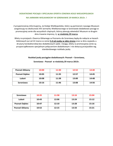 DODATKOWE POCIĄGI I SPECJALNA OFERTA CENOWA KOLEI WIELKOPOLSKICH NA JARMARK WIELKANOCNY W SZRENIAWIE 29 MARCA 2015r. ! Z przyjemnością informujemy, że Koleje Wielkopolskie, które są partnerem naszego Muzeum zorganizują na okoliczność XIV Jarmarku Wielkanocnego w Szreniawie dodatkowe pociągi w promocyjnej cenie dla wszystkich chętnych, którzy planują odwiedzić Muzeum w drugim dniu trwania imprezy, tj. w niedzielę 29 marca. Bilety na przejazd z Dworca Głównego w Poznaniu do Szreniawy będą do nabycia w kasach biletowych już od 22 marca w cenie 5 zł od osoby w obie strony oraz w dniu wyjazdu u drużyny konduktorskiej bez dodatkowych opłat. Uwaga, bilety w promocyjnej cenie są przyporządkowane specjalnym połączeniom dodatkowym i nie dotyczą przejazdów wg. standardowego rozkładu jazdy. Rozkład jazdy pociągów dodatkowych: Poznań – Szreniawa, Szreniawa - Poznań w niedzielę 29 marca 2015r. Poznań Główny 10:00 11:30 12:52 14:40 Poznań Dębiec 10:05 11:35 12:57 14:45 Luboń 10:08 11:38 13:00 14:48 Szreniawa 10:16 11:46 13:08 14:56 Szreniawa 10:35 11:58 13:16 15:04 Luboń 10:43 12:06 13:24 15:12 Poznań Dębiec 10:47 12:10 13:28 15:16 Poznań Główny 10:52 12:15 13:33 15:21