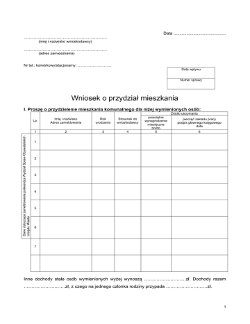 Data ............................................. ………………………………………………………… (imię i nazwisko wnioskodawcy) ………………………………………………………… (adres zamieszkania) Nr tel.: komórkowy/stacjonarny: ……………………… Data wpływu Numer sprawy Wniosek o przydział mieszkania I. Proszę o przydzielenie mieszkania komunalnego dla niżej wymienionych osób: Dane dotyczące zameldowania potwierdza Wydział Spraw Obywatelskich Urzędu Miasta Źródło utrzymania Lp. Imię i nazwisko Adres zameldowania Rok urodzenia Stosunek do wnioskodawcy 1 2 3 4 przeciętne wynagrodzenie miesięczne brutto 5 pieczęć zakładu pracy podpis głównego księgowego data 6 1 2 3 4 5 6 7 Inne dochody stałe osób wymienionych wyżej wynoszą ………………………zł. Dochody razem ………………………zł, z czego na jednego członka rodziny przypada ………………………zł. 1 Prośbę swą motywuję następująco: .......................................................................................... ......... ............................................................................................................................................................. ............................................................................................................................................................. ............................................................................................................................................................. ............................................................................................................................................................. ............................................................................................................................................................. ............................................................................................................................................................. ............................................................................................................................................................. ............................................................................................................................................................. ............................................................................................................................................................. Jednocześnie informuję: 1. Najemcą/właścicielem mieszkania, w którym zamieszkuję, jest .................................................. 2. Osobami zamieszkałymi dotychczas ze mną są osoby wymienione pod lp. ................................ powyższej tabeli oraz osoby: ........................................................................................................ ...................................................................................................................................................... ...................................................................................................................................................... 3. Zajmowane obecnie mieszkanie jest lokalem: kwaterunkowym, służbowym, spółdzielczym lokatorskim, własnościowym, innym * 4. Mieszkanie: a. znajduje się w budynku mieszkalnym, niemieszkalnym, przeznaczonym do rozbiórki (ze względu na stan zagrożenia, pod inwestycję) * b. składa się z ……………… pokoi o powierzchni każdego pokoju: 1 - ……………… m2, 2 - ……………… m2, 3 - ……………… m2, 4 - ……………… m2, 5 - ……………… m2 oraz kuchni o powierzchni ……………… m2. c. obejmuje powierzchnię użytkową ……………… m2. Potwierdzam zgodność danych dotyczących warunków zamieszkania wnioskodawcy ubiegającego się o przydział mieszkania. Data ……………………… ………………………………………………………… Podpis administracji domu OŚWIADCZENIE WNIOSKODAWCY Świadomy/a odpowiedzialności karnej z art. 233 KK potwierdzam własnoręcznym podpisem prawdziwość danych zamieszczonych we wniosku. Jednocześnie oświadczam, że nie posiadam uprawnień do żadnego lokalu mieszkalnego. Oświadczam także, że jestem świadomy/a, iż podanie nieprawdziwych danych spowoduje niezakwalifikowanie mnie do przyznania prawa do najmu lokalu mieszkalnego. Zobowiązuję się do informowania Referatu Lokalowego Urzędu Miasta Mikołów o zmianie danych podanych we wniosku. ………………………………………………………… Podpis wnioskodawcy 2 II. Opinia Zakładu Pracy Wnioskodawcy ............................................................................................................................................................. ............................................................................................................................................................. ............................................................................................................................................................. ............................................................................................................................................................. ............................................................................................................................................................. ............................................................................................................................................................. ............................................................................................................................................................. ............................................................................................................................................................. .............
