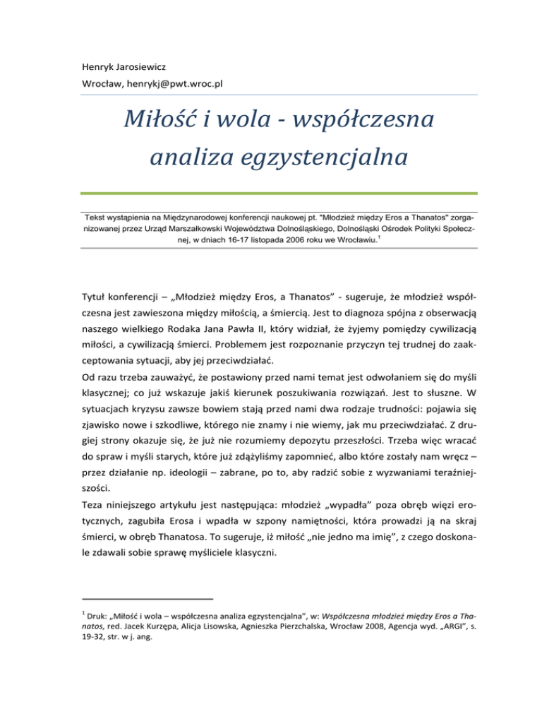 Henryk Jarosiewicz Wrocław, [email protected] Miłość i wola współczesna analiza egzystencjalna Tekst wystąpienia na Międzynarodowej konferencji naukowej pt. "Młodzież między Eros a Thanatos" zorganizowanej przez Urząd Marszałkowski Województwa Dolnośląskiego, Dolnośląski Ośrodek Polityki Społecznej, w dniach 16-17 listopada 2006 roku we Wrocławiu.1 Tytuł konferencji – „Młodzież między Eros, a Thanatos” ‐ sugeruje, że młodzież współ‐ czesna jest zawieszona między miłością, a śmiercią. Jest to diagnoza spójna z obserwacją naszego wielkiego Rodaka Jana Pawła II, który widział, że żyjemy pomiędzy cywilizacją miłości, a cywilizacją śmierci. Problemem jest rozpoznanie przyczyn tej trudnej do zaak‐ ceptowania sytuacji, aby jej przeciwdziałać. Od razu trzeba zauważyć, że postawiony przed nami temat jest odwołaniem się do myśli klasycznej; co już wskazuje jakiś kierunek poszukiwania rozwiązań. Jest to słuszne. W sytuacjach kryzysu zawsze bowiem stają przed nami dwa rodzaje trudności: pojawia się zjawisko nowe i szkodliwe, którego nie znamy i nie wiemy, jak mu przeciwdziałać. Z dru‐ giej strony okazuje się, że już nie rozumiemy depozytu przeszłości. Trzeba więc wracać do spraw i myśli starych, które już zdążyliśmy zapomnieć, albo które zostały nam wręcz – przez działanie np. ideologii – zabrane, po to, aby radzić sobie z wyzwaniami teraźniej‐ szości. Teza niniejszego artykułu jest następująca: młodzież „wypadła” poza obręb więzi ero‐ tycznych, zagubiła Erosa i wpadła w szpony namiętności, która prowadzi ją na skraj śmierci, w obręb Thanatosa. To sugeruje, iż miłość „nie jedno ma imię”, z czego doskona‐ le zdawali sobie sprawę myśliciele klasyczni. 1 Druk: „Miłość i wola – współczesna analiza egzystencjalna”, w: Współczesna młodzież między Eros a Tha‐ natos, red. Jacek Kurzępa, Alicja Lisowska, Agnieszka Pierzchalska, Wrocław 2008, Agencja wyd. „ARGI”, s. 19‐32, str. w j. ang. Oblicza miłości Tradycyjne rozumienie miłości R. May, autor znanej pracy pt. „Miłość i wola”, do której mam zamiar nawiązać w swoim wystąpieniu, stwierdza, że w „tradycji europejskiej odnajdujemy cztery sposoby rozu‐ mienia miłości. Pierwszym jest s e k s , zmysłowość, libido. Drugim jest e r o s – miłość dą‐ żąca do prokreacji lub kreacji, czyli, jak podkreślali to grecy, tęsknota do wyższych form istnienia i więzi miedzy ludźmi. Trzecim jest p h i l i a – przyjaźń, miłość braterska. Czwarta – to a g a p e – jak ją nazywali Rzymianie, C a r i t a s – miłość będąca poświęceniem się dla dobra innych, której prawzorem jest miłość Boga do człowieka. W każdym autentycznym przeżyciu miłości występują – w różnym stopniu – te cztery jej rodzaje”2 Miłość dojrzewa, a wraz z miłością dojrzewa człowiek, przechodząc od seksu do agape. Nikt nie żąda od dziecka, aby kochało miłością agape; ta zdolność to dzieło wychowania. Nie jest też tajemnicą, jak to ukazał choćby K. Dąbrowski w swej koncepcji „dezintegracji pozytywnej” (Dąbrowski 1985), że droga do wyższych postaci miłości wiąże się z pew‐ nym wysiłkiem, a nawet cierpieniem. Rozwój polega bowiem na „dezintegracji” struktur niższych, aby budować struktury wyższe. Patrząc więc na cierpienie rozwojowe od strony „pozytywnej” widzimy konieczność procesu integracji, a więc scalenia ludzkich dążeń tak, aby to, co „wyższe” mieściło w sobie to, co „niższe”. Stąd też inny znany autor, C. Lewis, w swej słynnej pracy pt. „Cztery miłości”, stwierdza, że „najwyższe na najniższym wznosi się i opiera”3. Lewis wyróżnia p r z y w i ą z a n i e (grecki termin to storge), p r z y ‐ j a ź ń , e r o s i c a r i t a s . Wyróżnia również upodobanie i zamiłowanie do świata material‐ nego; lubimy np. kawę, mamy do niej upodobanie, a nawet jej pożądamy! Nie wyróżnia jednak seksu, lecz daje mu miejsce w obrębie Erosa. Jak pisze: „Sprawy płci wchodzą w zakres naszego tematu na tyle, na ile są składnikami skomplikowanego stanu zwanego „zakochaniem”. Uważam za rzecz nie podlegającą dyskusji, że doznania seksualne mogą mieć miejsce bez Erosa, bez „zakochania” i że w pojęciu Erosa mieści się wiele innych rzeczy prócz działania zmysłów. (…) Pierwiastki cielesne czy zwierzęco‐seksualne tkwiące w Erosie mam zamiar nazywać (według dawnego zwyczaju): Wenus. (…) Dla ewolucjoni‐ sty Eros (jego ludzka odmiana) będzie czymś wyrastającym z łona Wenus, późniejszym w czasie zróżnicowaniem i rozwojem prawiecznego biologicznego popędu.”4 Interesujące jest również to, że Lewis uznaje za zgodną z doświadczeniem uwagę Lukre‐ 2 (May, 1993), str. 33. 3 (Lewis, 1983), str. 10. 4 (Lewis, 1983), str. 117‐119. Strona 2 cjusza, iż „miłość osłabia rozkosz zmysłową. Emocjonalność jest tu przeszkodą. (…) Eros Miłość i wola. przemienia w ten sposób to, co było par excellence przyjemnością‐potrzebą, w przyjem‐ ność, w której upodobanie odgrywa dominującą rolę. (..) pod wpływem Erosa potrzeba nawet najbardziej intensywna odnosi się do swego obiektu jako do zjawiska w swej isto‐ cie godnego podziwu i ważnego, zupełnie niezależnie od potrzeb kochanka.”5 Dlatego też Eros „nie wzmaga, lecz łagodzi dokuczliwy nałogowy charakter samego głodu zmy‐ słów. I nie dlatego, że go po prostu zaspokaja: Eros nie umniejsza pożądania, ale ułatwia wstrzemięźliwość.”6 Trzeba zauważyć też, że myśl ludzka przebyła długą drogę refleksji, aby nazwać różnice między miłością cielesną, związaną z popędowością, a miłością Eros powodowaną przez wartość osoby. Od Marsa i Wenus do Erosa i Psyche W ludzkiej refleksji Eros pojawia się obok Wenus: „gdy Afrodyta wynurzyła się z