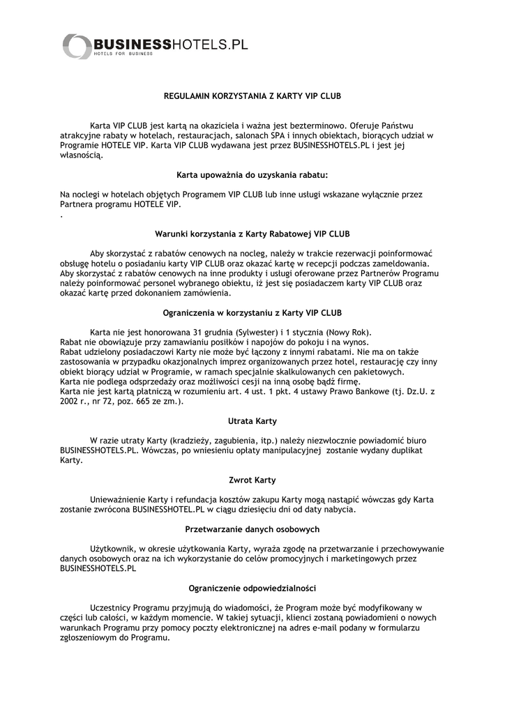 REGULAMIN KORZYSTANIA Z KARTY VIP CLUB Karta VIP CLUB jest kartą na okaziciela i waŜna jest bezterminowo. Oferuje Państwu atrakcyjne rabaty w hotelach, restauracjach, salonach SPA i innych obiektach, biorących udział w Programie HOTELE VIP. Karta VIP CLUB wydawana jest przez BUSINESSHOTELS.PL i jest jej własnością. Karta upowaŜnia do uzyskania rabatu: Na noclegi w hotelach objętych Programem VIP CLUB lub inne usługi wskazane wyłącznie przez Partnera programu HOTELE VIP. . Warunki korzystania z Karty Rabatowej VIP CLUB Aby skorzystać z rabatów cenowych na nocleg, naleŜy w trakcie rezerwacji poinformować obsługę hotelu o posiadaniu karty VIP CLUB oraz okazać kartę w recepcji podczas zameldowania. Aby skorzystać z rabatów cenowych na inne produkty i usługi oferowane przez Partnerów Programu naleŜy poinformować personel wybranego obiektu, iŜ jest się posiadaczem karty VIP CLUB oraz okazać kartę przed dokonaniem zamówienia. Ograniczenia w korzystaniu z Karty VIP CLUB Karta nie jest honorowana 31 grudnia (Sylwester) i 1 stycznia (Nowy Rok). Rabat nie obowiązuje przy zamawianiu posiłków i napojów do pokoju i na wynos. Rabat udzielony posiadaczowi Karty nie moŜe być łączony z innymi rabatami. Nie ma on takŜe zastosowania w przypadku okazjonalnych imprez organizowanych przez hotel, restaurację czy inny obiekt biorący udział w Programie, w ramach specjalnie skalkulowanych cen pakietowych. Karta nie podlega odsprzedaŜy oraz moŜliwości cesji na inną osobę bądź firmę. Karta nie jest kartą płatniczą w rozumieniu art. 4 ust. 1 pkt. 4 ustawy Prawo Bankowe (tj. Dz.U. z 2002 r., nr 72, poz. 665 ze zm.). Utrata Karty W razie utraty Karty (kradzieŜy, zagubienia, itp.) naleŜy niezwłocznie powiadomić biuro BUSINESSHOTELS.PL. Wówczas, po wniesieniu opłaty manipulacyjnej zostanie wydany duplikat Karty. Zwrot Karty UniewaŜnienie Karty i refundacja kosztów zakupu Karty mogą nastąpić wówczas gdy Karta zostanie zwrócona BUSINESSHOTEL.PL w ciągu dziesięciu dni od daty nabycia. Przetwarzanie danych osobowych UŜytkownik, w okresie uŜytkowania Karty, wyraŜa zgodę na przetwarzanie i przechowywanie danych osobowych oraz na ich wykorzystanie do celów promocyjnych i marketingowych przez BUSINESSHOTELS.PL Ograniczenie odpowiedzialności Uczestnicy Programu przyjmują do wiadomości, Ŝe Program moŜe być modyfikowany w części lub całości, w kaŜdym momencie. W takiej sytuacji, klienci zostaną powiadomieni o nowych warunkach Programu przy pomocy poczty elektronicznej na adres e-mail podany w formularzu zgłoszeniowym do Programu.