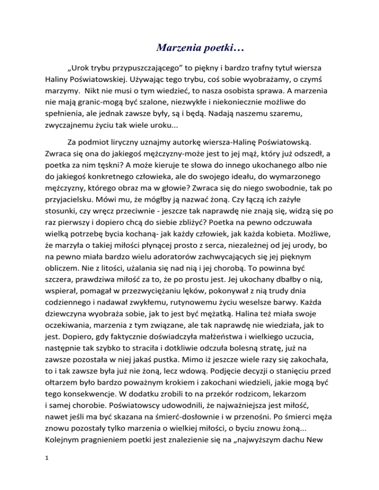 Marzenia poetki… „Urok trybu przypuszczającego” to piękny i bardzo trafny tytuł wiersza Haliny Poświatowskiej. Używając tego trybu, coś sobie wyobrażamy, o czymś marzymy. Nikt nie musi o tym wiedzieć, to nasza osobista sprawa. A marzenia nie mają granic-mogą być szalone, niezwykłe i niekoniecznie możliwe do spełnienia, ale jednak zawsze były, są i będą. Nadają naszemu szaremu, zwyczajnemu życiu tak wiele uroku... Za podmiot liryczny uznajmy autorkę wiersza-Halinę Poświatowską. Zwraca się ona do jakiegoś mężczyzny-może jest to jej mąż, który już odszedł, a poetka za nim tęskni? A może kieruje te słowa do innego ukochanego albo nie do jakiegoś konkretnego człowieka, ale do swojego ideału, do wymarzonego mężczyzny, którego obraz ma w głowie? Zwraca się do niego swobodnie, tak po przyjacielsku. Mówi mu, że mógłby ją nazwać żoną. Czy łączą ich zażyłe stosunki, czy wręcz przeciwnie - jeszcze tak naprawdę nie znają się, widzą się po raz pierwszy i dopiero chcą do siebie zbliżyć? Poetka na pewno odczuwała wielką potrzebę bycia kochaną- jak każdy człowiek, jak każda kobieta. Możliwe, że marzyła o takiej miłości płynącej prosto z serca, niezależnej od jej urody, bo na pewno miała bardzo wielu adoratorów zachwycających się jej pięknym obliczem. Nie z litości, użalania się nad nią i jej chorobą. To powinna być szczera, prawdziwa miłość za to, że po prostu jest. Jej ukochany dbałby o nią, wspierał, pomagał w przezwyciężaniu lęków, pokonywał z nią trudy dnia codziennego i nadawał zwykłemu, rutynowemu życiu weselsze barwy. Każda dziewczyna wyobraża sobie, jak to jest być mężatką. Halina też miała swoje oczekiwania, marzenia z tym związane, ale tak naprawdę nie wiedziała, jak to jest. Dopiero, gdy faktycznie doświadczyła małżeństwa i wielkiego uczucia, następnie tak szybko to straciła i dotkliwie odczuła bolesną stratę, już na zawsze pozostała w niej jakaś pustka. Mimo iż jeszcze wiele razy się zakochała, to i tak zawsze była już nie żoną, lecz wdową. Podjęcie decyzji o stanięciu przed ołtarzem było bardzo poważnym krokiem i zakochani wiedzieli, jakie mogą być tego konsekwencje. W dodatku zrobili to na przekór rodzicom, lekarzom i samej chorobie. Poświatowscy udowodnili, że najważniejsza jest miłość, nawet jeśli ma być skazana na śmierć-dosłownie i w przenośni. Po śmierci męża znowu pozostały tylko marzenia o wielkiej miłości, o byciu znowu żoną... Kolejnym pragnieniem poetki jest znalezienie się na „najwyższym dachu New 1 Yorku”. Nowy Jork to ogromne miasto. Niewątpliwie, gdy Halina do niego przybyła na bardzo poważną operacje serca, była bardzo zaskoczona. Szara, bura, komunistyczna Częstochowa z jej domem, ogrodem, w którym rosły bzy, akacje, czereśnie i wisiał rozpięty hamak- w niczym nie przypominała tętniącego życiem, ogromnego miasta w Ameryce, pełnego gwaru, świateł, neonów, samochodów, wielkich budowli, ulic, uliczek i kolorowych ludzi. Tam w Polsce, w domu było młodsze rodzeństwo, zapracowany ojciec, kochająca i troskliwa mama, ulubione zwierzęta-w Ameryce prawie wszyscy obcy, nieznani. Nowy Jork okazał się zachwycający i trochę przerażający, zarazem-tyle dróg, tyle budynków, kolorowe wystawy sklepowe, jak i wszechogarniająca obcość. Poetka, patrząc na to, z pewnością miała ochotę wszystkiego spróbować, odwiedzać sklepy, restauracje, kina, parki, przejść całe miasto wszerz i wzdłuż, poznać jego zakamarki i wiele nieznanych, nowych rzeczy. Gdyby to było takie proste... Czy nie wspaniale byłoby usiąść na najwyższym wieżowcu w Nowym Jorku i spojrzeć na niego z zupełnie innej perspektywy? Podziwiać jego panoramę, ujrzeć tłumy ludzi, zobaczyć, jak szarość miesza się z kolorami, na ulicach pośpiech, nieustanny ruch. To amerykańskie miasto to mieszanka różnych kultur, narodowości-taka miniatura świata, którą poetka chciała koniecznie poznać. Halinę cechowała niesamowita zachłanność na życie. Potrafiła się nim cieszyć lepiej niż niejeden zdrowy człowiek. Nie narzekała, chociaż miała do tego prawo. Dlatego mogła marzyć o tym, by zwiedzać świat, podróżować i poznawać obce zwyczaje, oglądać piękne budowle i cuda przyrody. Ale przeczuwała, że może jej to nie być dane, że może odejść na zawsze i nie zdążyć... A tak bardzo chciała żyć pełnią życia. Była taka młoda i pełna energii, gdyby tylko była całkowicie zdrowa, miałaby większe szanse, aby spełnić, zrealizować swoje plany. Jej palce, jej usta były stale głodnepragnęła nowych wrażeń, zobaczyć świat, wykorzystywać każdą minutę. Nie tylko patrzeć i słyszeć-chciałaby używać wszystkich zmysłów: dotykać, może biegać boso po trawie w jakimś parku, smakować, może próbować jakiś nowych potraw... Jeśli nawet nie mogła sama zrobić tylu rzeczy, to pragnęła, żeby chociaż ktoś jej o nich powiedział, „nakarmił” ją opowieściami. Może jej usta były właśnie dlatego głodne, pragnęły takiej szczerej rozmowy o życiu. Wspaniale byłoby też nie mieć zmartwień, czuć się chociaż przez kilka chwil lekko, cudownie i swobodnie-ot tak po prostu, machając beztrosko nogami. Takie chwile radości, beztroski są każdemu potrzebne-trzeba się czasem 2 odprężyć i zapomnieć o wszystkich kłopotach, problemach. A co może być przyjemniejszego dla kobiety niż para nowych butów? Halina często dostawała ubrania po koleżankach ciotki. W Ameryce miała okazję być w salonie mody i wybrać sobie trochę ładnych rzeczy. Wreszcie mogła się czuć jak prawdziwa dama. To właśnie tam, za oceanem mogła się zaopatrzyć w nowe, piękne stroje, które na pewno dały jej dużo radości i sprawiły, że stała się jeszcze piękniejsza. Po jasnym dniu, nadchodzi ciemna noc. Wtedy każdego z nas nachodzą rozmaite myśli. Z