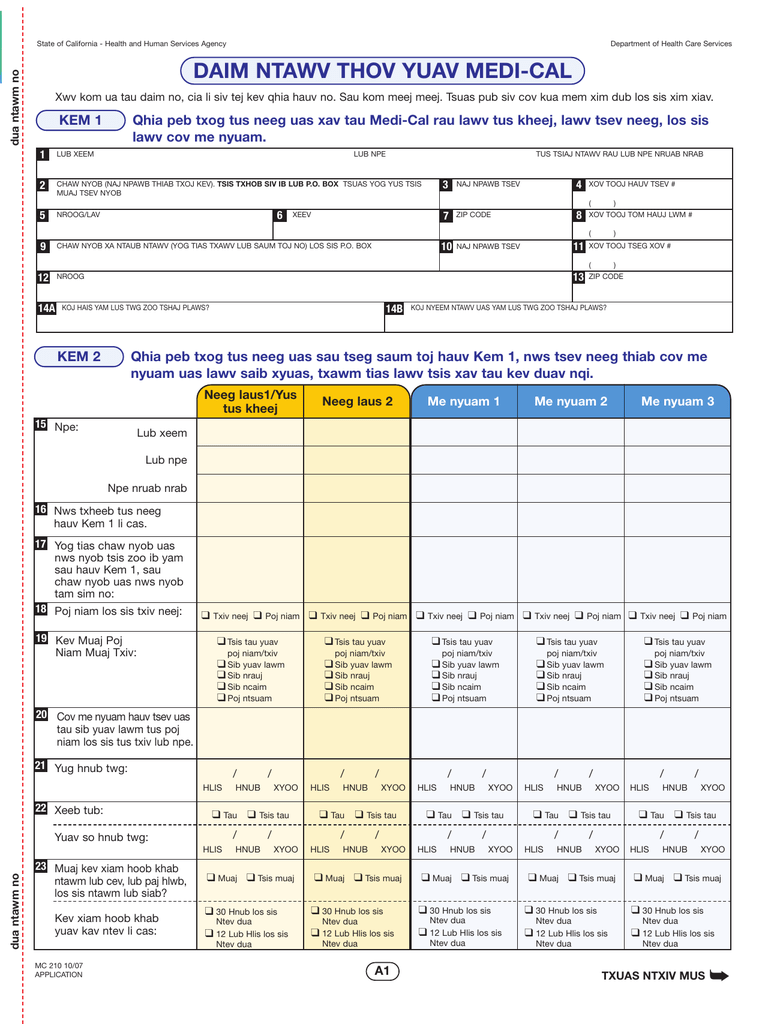 State of California - Health and Human Services Agency Department of Health Care Services dua ntawm no DAIM NTAWV THOV YUAV MEDI-CAL Xwv kom ua tau daim no, cia li siv tej kev qhia hauv no. Sau kom meej meej. Tsuas pub siv cov kua mem xim dub los sis xim xiav. Qhia peb txog tus neeg uas xav tau Medi-Cal rau lawv tus kheej, lawv tsev neeg, los sis lawv cov me nyuam. KEM 1 1 LUB XEEM 2 CHAW NYOB (NAJ NPAWB THIAB TXOJ KEV). TSIS TXHOB SIV IB LUB P.O. BOX TSUAS YOG YUS TSIS MUAJ TSEV NYOB 5 NROOG/LAV 9 CHAW NYOB XA NTAUB NTAWV (YOG TIAS TXAWV LUB SAUM TOJ NO) LOS SIS P.O. BOX LUB NPE TUS TSIAJ NTAWV RAU LUB NPE NRUAB NRAB 3 NAJ NPAWB TSEV 4 7 ZIP CODE 8 10 NAJ NPAWB TSEV XOV TOOJ HAUV TSEV # ( 6 XEEV ) XOV TOOJ TOM HAUJ LWM # ( ) 11 XOV TOOJ TSEG XOV # 13 ZIP CODE ( 12 NROOG 14A 14B KOJ HAIS YAM LUS TWG ZOO TSHAJ PLAWS? ) KOJ NYEEM NTAWV UAS YAM LUS TWG ZOO TSHAJ PLAWS? Qhia peb txog tus neeg uas sau tseg saum toj hauv Kem 1, nws tsev neeg thiab cov me nyuam uas lawv saib xyuas, txawm tias lawv tsis xav tau kev duav nqi. KEM 2 Neeg laus1/Yus tus kheej 15 Npe: Neeg laus 2 Me nyuam 1 Me nyuam 3 Me nyuam 2 Lub xeem Lub npe Npe nruab nrab 16 Nws txheeb tus neeg hauv Kem 1 li cas. 17 Yog tias chaw nyob uas nws nyob tsis zoo ib yam sau hauv Kem 1, sau chaw nyob uas nws nyob tam sim no: 18 Poj niam los sis txiv neej: K Txiv neej 19 Kev Muaj Poj Niam Muaj Txiv: K Poj niam K Txiv neej K Poj niam K Txiv neej K Poj niam K Txiv neej K Poj niam K Txiv neej K Poj niam K Tsis tau yuav K Tsis tau yuav K Tsis tau yuav K Tsis tau yuav K Tsis tau yuav poj niam/txiv K Sib yuav lawm K Sib nrauj K Sib ncaim K Poj ntsuam poj niam/txiv K Sib yuav lawm K Sib nrauj K Sib ncaim K Poj ntsuam poj niam/txiv K Sib yuav lawm K Sib nrauj K Sib ncaim K Poj ntsuam poj niam/txiv K Sib yuav lawm K Sib nrauj K Sib ncaim K Poj ntsuam K Sib yuav lawm K Sib nrauj K Sib ncaim K Poj ntsuam poj niam/txiv 20 Cov me nyuam hauv tsev uas tau sib yuav lawm tus poj niam los sis tus txiv lub npe. 21 Yug hnub twg: / HLIS 22 Xeeb tub: K Tau K dua ntawm no HLIS Kev xiam hoob khab yuav kav ntev li cas: MC 210 10/07 APPLICATION / XYOO Tsis tau / Yuav so hnub twg: 23 Muaj kev xiam hoob khab ntawm lub cev, lub paj hlwb, los sis ntawm lub siab? / HNUB HNUB HLIS K Tau K / / HNUB Tsis tau / XYOO HLIS / XYOO HNUB HLIS K Tau K / / HNUB HLIS HNUB K Muaj K Tsis muaj K 30 Hnub los sis K 30 Hnub los sis K 30 Hnub los sis K K K A1 Ntev dua 12 Lub Hlis los sis Ntev dua HLIS / XYOO Tsis tau / XYOO K Muaj K Tsis muaj Ntev dua 12 Lub Hlis los sis Ntev dua / HNUB K Tau K / K Muaj K Tsis muaj Ntev dua 12 Lub Hlis los sis Ntev dua HLIS Tsis tau / XYOO / XYOO HNUB HLIS K Tau K / / HNUB Tsis tau / XYOO K Muaj K Tsis muaj HLIS XYOO HNUB / XYOO K Muaj K Tsis muaj K 30 Hnub los sis K 30 Hnub los sis K K 12 Lub Hlis los sis Ntev dua 12 Lub Hlis los sis Ntev dua Ntev dua Ntev dua TXUAS NTXIV MUS ¯ SECTION KEM 2 2 Txuas ntxiv mus 24 Puas muaj leej twg uas tau txais kev pab nyiaj ntsuab, SSI, Nyiaj Muas Noj los sis Medi-Cal? Neeg laus1/Yus tus kheej Neeg laus 2 Me nyuam 1 Me nyuam 2 Me nyuam 3 K Tau K Tsis tau K Tau K Tsis tau K Tau K Tsis tau K Tau K Tsis tau K Tau K Tsis tau K Tau K Tsis tau K Tau K Tsis tau K Tau K Tsis tau K Tau K Tsis tau K Tau K Tsis tau Yog tias “Tau,” ua leej twg lub npe? 25 Medi-Cal kev pab BIC daim ntawv naj npawb twg, yog tias koj muaj: 26 Xav tau kev pab them nqi kho mob? 27 Koj puas muaj los sis tab tom yuav ib lub tsev uas tsis nyob hauv California? KEM 3 28 Tsis tau K Muaj K Tsis tau K Muaj K K Muaj K Tsis tau Tsis tau K Muaj K Me nyuam 2 Me nyuam 3 Tsis tau yug los Niam Lub Npe: Niam Lub Npe: Niam Lub Npe: Niam Lub Npe: K Xiam hoob khab K Tuag lawm 29 K Ua hauj lwm K Tsis ua hauj lwm K Tsis nyob hauv no Niam puas: K Xiam hoob khab K Tuag lawm Txiv lub npe: Txiv puas: K Xiam hoob khab K Tuag lawm KEM 4 K Ua hauj lwm K Tsis ua hauj lwm K Tsis nyob hauv no K Ua hauj lwm K Tsis ua hauj lwm K Tsis nyob hauv no Txiv puas: K Xiam hoob khab K Tuag lawm K Xiam hoob khab K Tuag lawm K Ua hauj lwm K Tsis ua hauj lwm K Tsis nyob hauv no Niam puas: K Ua hauj lwm K Xiam hoob khab K Tsis ua hauj lwm Txiv lub npe: K Ua hauj lwm K Tsis ua hauj lwm K Tsis nyob hauv no Txiv puas: K Xiam hoob khab K Tuag lawm Txiv lub npe: K Ua hauj lwm K Tsis ua hauj lwm K Tsis nyob hauv no Txiv puas: K Ua hauj lwm K Xiam hoob khab K Tsis ua hauj lwm K Tuag lawm K Tsis nyob hauv no Sau txhua qhov nyiaj khwv tau/nyiaj txiag uas cov neeg hauv Kem 2 tau txais. 31 TAU KHWV NYIAJ/TAU NYIAJ TXIAG QHOV TWG LOS (Ua hauj lwm, nyiaj laus) 32 KHWV TAU NYIAJ/TAU NYIAJ TXIAG NPAUM CAS 33 TAU NYIAJ KHWV/TAU NYIAJ TXIAG PES TSAWG ZAUS (Txhua lub hlis, ob zaug tauj ib hlis, txhua lis piam, ib zaug tauj ob lis piam, txhua hnub) Sau qhia txog tej nqi uas txhua tus neeg uas tau sau tseg rau hauv Kem 2 yuav tau them. KOJ TSEV NEEG TEJ NQI DAB TSI 34 LEEJ TWG THEM TUS NQI NO 35 TXHUA LUB HLIS THEM PES TSAWG 36 KEV ZOV ME NYUAM LOS SIS COV NEEG UAS KOJ SAIB XYUAS (Sau tus me nyuam los sis tus neeg uas koj saib xyuas lub npe) Nyiaj Txhawb Pab Me Nyuam 1. Nyiaj Them Tus Uas Yus Tau Nrauj 2. Lwm Qhov Isalas Them Nqi Kho Mob 3. Tus Nqi Rau Medicare 4. MC 210 10/07 APPLICATION Niam puas: Txiv lub npe: LEEJ TWG TAU TXAIS QHOV NYIAJ KHWV TAU/NYIAJ TXIAG KEM 5 Tsis tau Teb rau txhua tus me nyuam hauv Kem 2. Me nyuam 1 Niam puas: 30 K Muaj K A2 37 HNUB NYOOG 38 LEEJ TWG THEM TUS NQI NO 39 TXHUA LUB HLIS THEM PES TSAWG dua ntawm no KEM 6 2 SECTION Tsis txhob uas Kem no yog tias koj tsuas ua ntaub ntawv thov kev pab rau cov me nyuam muaj hnub nyoog 19 xyoos rov hauv thiab/los sis cov poj niam xeeb tub(kev pab kuaj poj niam uas xeeb tub xwb). Dua li ces teb tej lus nug no rau txhua tus neeg uas sau tseg rau hauv Kem 2. 40 Leej twg puas muaj nyiaj ntsuab los sis tej daim tshev uas lawv tsis tau pauv? Yog tias “Muaj,” sau qhia muaj nyiaj npaum li cas (Saib tej kev qhia hauv no) K Muaj K Tsis muaj 41 Leej twg puas muaj ib qho kev sau tshev, kev ceev nyiaj, los sis isalas tag ib sim neej? (Saib tej kev qh
