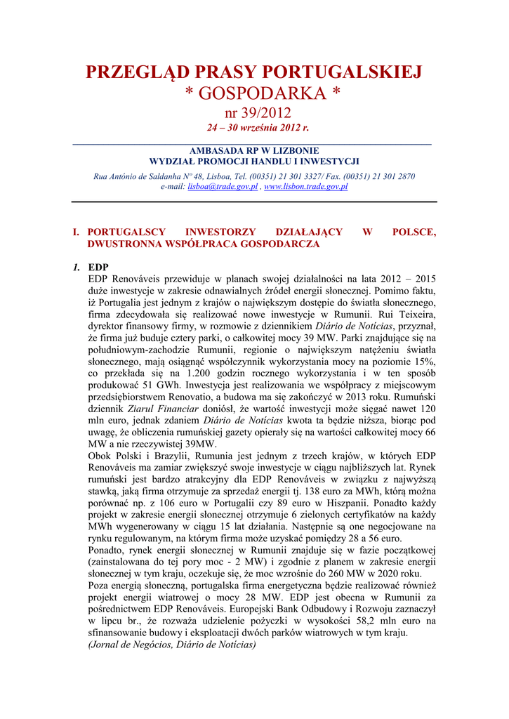 PRZEGLĄD PRASY PORTUGALSKIEJ * GOSPODARKA * nr 39/2012 24 – 30 września 2012 r. ______________________________________________________________________ AMBASADA RP W LIZBONIE WYDZIAŁ PROMOCJI HANDLU I INWESTYCJI Rua António de Saldanha Nº 48, Lisboa, Tel. (00351) 21 301 3327/ Fax. (00351) 21 301 2870 e-mail: [email protected] , www.lisbon.trade.gov.pl I. PORTUGALSCY INWESTORZY DZIAŁAJĄCY DWUSTRONNA WSPÓŁPRACA GOSPODARCZA W POLSCE, 1. EDP EDP Renováveis przewiduje w planach swojej działalności na lata 2012 – 2015 duże inwestycje w zakresie odnawialnych źródeł energii słonecznej. Pomimo faktu, iż Portugalia jest jednym z krajów o największym dostępie do światła słonecznego, firma zdecydowała się realizować nowe inwestycje w Rumunii. Rui Teixeira, dyrektor finansowy firmy, w rozmowie z dziennikiem Diário de Notícias, przyznał, że firma już buduje cztery parki, o całkowitej mocy 39 MW. Parki znajdujące się na południowym-zachodzie Rumunii, regionie o największym natężeniu światła słonecznego, mają osiągnąć współczynnik wykorzystania mocy na poziomie 15%, co przekłada się na 1.200 godzin rocznego wykorzystania i w ten sposób produkować 51 GWh. Inwestycja jest realizowania we współpracy z miejscowym przedsiębiorstwem Renovatio, a budowa ma się zakończyć w 2013 roku. Rumuński dziennik Ziarul Financiar doniósł, że wartość inwestycji może sięgać nawet 120 mln euro, jednak zdaniem Diário de Notícias kwota ta będzie niższa, biorąc pod uwagę, że obliczenia rumuńskiej gazety opierały się na wartości całkowitej mocy 66 MW a nie rzeczywistej 39MW. Obok Polski i Brazylii, Rumunia jest jednym z trzech krajów, w których EDP Renováveis ma zamiar zwiększyć swoje inwestycje w ciągu najbliższych lat. Rynek rumuński jest bardzo atrakcyjny dla EDP Renováveis w związku z najwyższą stawką, jaką firma otrzymuje za sprzedaż energii tj. 138 euro za MWh, którą można porównać np. z 106 euro w Portugalii czy 89 euro w Hiszpanii. Ponadto każdy projekt w zakresie energii słonecznej otrzymuje 6 zielonych certyfikatów na każdy MWh wygenerowany w ciągu 15 lat działania. Następnie są one negocjowane na rynku regulowanym, na którym firma może uzyskać pomiędzy 28 a 56 euro. Ponadto, rynek energii słonecznej w Rumunii znajduje się w fazie początkowej (zainstalowana do tej pory moc - 2 MW) i zgodnie z planem w zakresie energii słonecznej w tym kraju, oczekuje się, że moc wzrośnie do 260 MW w 2020 roku. Poza energią słoneczną, portugalska firma energetyczna będzie realizować również projekt energii wiatrowej o mocy 28 MW. EDP jest obecna w Rumunii za pośrednictwem EDP Renováveis. Europejski Bank Odbudowy i Rozwoju zaznaczył w lipcu br., że rozważa udzielenie pożyczki w wysokości 58,2 mln euro na sfinansowanie budowy i eksploatacji dwóch parków wiatrowych w tym kraju. (Jornal de Negócios, Diário de Notícias) PRZEGLĄD PRASY PORTUGALSKIEJ - GOSPODARKA nr 39/2012 2. Banco Comercial Português Bank Sabadell zwiększy swoje udziały w BCP do poziomu 5%, w ramach trwającego obecnie procesu dokapitalizowania. W ten sposób hiszpańska grupa przygotowuje się do stania się znaczącym udziałowcem w BCP obok angolskiej firmy naftowej Sonangol. Według oficjalnych źródeł, hiszpański Sabadell będzie uczestniczył w zwiększeniu kapitału banku Millenium BCP. Chodzi o zwiększenie udziału z aktualnych 3,97% do ok. 5%, co jeszcze nie zostało oficjalnie potwierdzone. Grupa Sabadell jest związana z BCP od 2000 r., kiedy doszło do podpisania umowy o partnerstwie strategicznym. Aktualnie Sabadell nie jest obecny w organach administracyjnych BCP, co może się zmienić po potwierdzeniu zwiększenia udziałów. Oczekuje się, że Sonangol zwiększy swoje udziały z aktualnych 11,03% (Angolczycy otrzymali pozwolenie na zwiększenie udziałów do 20%). (Diário Económico) Zwiększenie udziału Joe Berardo w BCP Joe Berardo, akcjonariusz banku, wziął udział w procesie dokapitalizowania BCP. W rozmowie z Diário de Notícias przyznał, że wykorzystał aktualną operację zwiększenia kapitału do wzmocnienia swojej pozycji poprzez wykup praw do akcji. Obecnie grupa Berardo ma w swoim posiadaniu 3,07% kapitału BCP. Ta inwestycja zbiegła się w czasie ze sprzedażą przez portugalskiego biznesmena 32% udziałów, które posiadał w Grupie Sogrape. Berardo poinformował, że sprzedaż akcji firmy winiarskiej nie miała na celu zapewnienia płynności, a zwiększenie udziałów w BCP wynika z przekonania, że pozycja BCP na rynku będzie coraz silniejsza. W operacji zwiększenia kapitału banku wzięli udział także inni akcjonariusze, m.in. Sonangol (posiadająca 11,03% kapitału BCP), Teixeira Duarte (5,36%), Sabadell (3,97%) i EDP (2,99%). Udziału w dokapitalizowaniu nie wzięła Caixa Geral de Depósitos (2,99%). Struktura akcjonariatu banku BCP odnotowuje tym samym zmiany. Przewidywane jest również wejście do kapitału BCP nowego akcjonariusza zagranicznego z 5% udziałem, którym ma być firma europejska spoza obszaru bankowego. Dokapitalizowanie BCP zakończyło się w piątek 28.09. We wtorek 2 października zostaną ogłoszone rezultaty subskrypcji, a 8 października wejdą do obrotu nowe akcje. Niewykupione w ramach aktualnej subskrypcji akcje zostaną zakupione przez Państwo za cenę 0,04 euro. (Diário de Notícias) 3. Jerónimo Martins Pingo Doce, marka grupy Jerónimo Martins, zakwestionowała decyzję Urzędu Ochrony Konkurencji (Autoridade de Concorrência), który nałożył na nią karę w wysokości 30 tys. euro. Na początku sierpnia tego roku Urząd zastosował wobec sieci supermarketów Pingo Doce grzywnę w wysokości 29,9 tys. euro za kampanię promocyjną przeprowadzoną 1 maja br., podczas której marka oferowała klientom 50% zniżki w przypadku, gdy wartość zakupów wynosiła powyżej 100 euro. Dodatkowo do kary 29,9 tys. doliczone zostały 250 euro z tytułu koszt