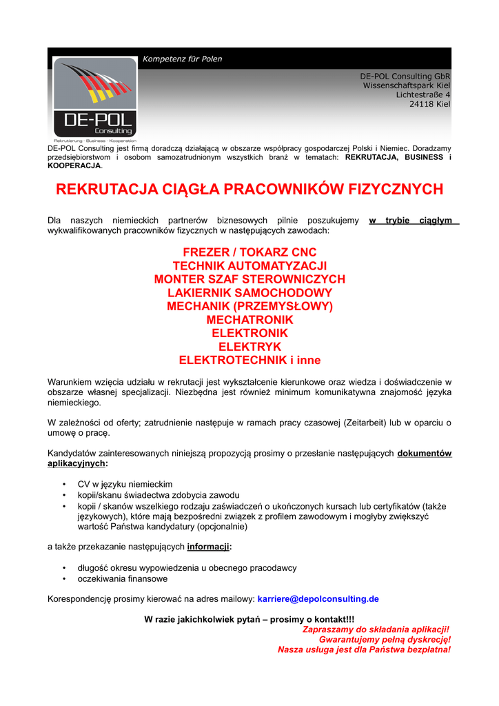 DE-POL Consulting jest firmą doradczą działającą w obszarze współpracy gospodarczej Polski i Niemiec. Doradzamy przedsiębiorstwom i osobom samozatrudnionym wszystkich branż w tematach: REKRUTACJA, BUSINESS i KOOPERACJA. REKRUTACJA CIĄGŁA PRACOWNIKÓW FIZYCZNYCH Dla naszych niemieckich partnerów biznesowych pilnie poszukujemy wykwalifikowanych pracowników fizycznych w następujących zawodach: w trybie ciągłym FREZER / TOKARZ CNC TECHNIK AUTOMATYZACJI MONTER SZAF STEROWNICZYCH LAKIERNIK SAMOCHODOWY MECHANIK (PRZEMYSŁOWY) MECHATRONIK ELEKTRONIK ELEKTRYK ELEKTROTECHNIK i inne Warunkiem wzięcia udziału w rekrutacji jest wykształcenie kierunkowe oraz wiedza i doświadczenie w obszarze własnej specjalizacji. Niezbędna jest również minimum komunikatywna znajomość języka niemieckiego. W zależności od oferty; zatrudnienie następuje w ramach pracy czasowej (Zeitarbeit) lub w oparciu o umowę o pracę. Kandydatów zainteresowanych niniejszą propozycją prosimy o przesłanie następujących dokumentów aplikacyjnych: • • • CV w języku niemieckim kopii/skanu świadectwa zdobycia zawodu kopii / skanów wszelkiego rodzaju zaświadczeń o ukończonych kursach lub certyfikatów (także językowych), które mają bezpośredni związek z profilem zawodowym i mogłyby zwiększyć wartość Państwa kandydatury (opcjonalnie) a także przekazanie następujących informacji: • • długość okresu wypowiedzenia u obecnego pracodawcy oczekiwania finansowe Korespondencję prosimy kierować na adres mailowy: [email protected] W razie jakichkolwiek pytań – prosimy o kontakt!!! Zapraszamy do składania aplikacji! Gwarantujemy pełną dyskrecję! Nasza usługa jest dla Państwa bezpłatna!