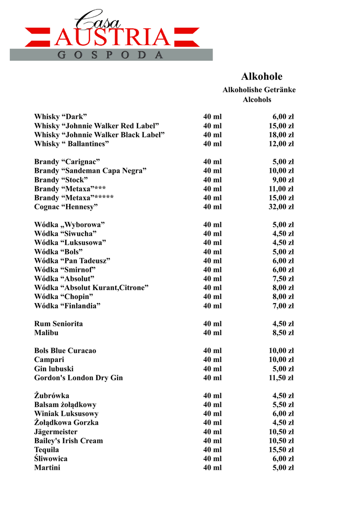Alkohole Alkoholishe Getränke Alcohols Whisky “Dark” Whisky “Johnnie Walker Red Label” Whisky “Johnnie Walker Black Label” Whisky “ Ballantines” 40 ml 40 ml 40 ml 40 ml 6,00 zł 15,00 zł 18,00 zł 12,00 zł Brandy “Carignac” Brandy “Sandeman Capa Negra” Brandy “Stock” Brandy “Metaxa”*** Brandy “Metaxa”***** Cognac “Hennesy” 40 ml 40 ml 40 ml 40 ml 40 ml 40 ml 5,00 zł 10,00 zł 9,00 zł 11,00 zł 15,00 zł 32,00 zł Wódka „Wyborowa” Wódka “Siwucha” Wódka “Luksusowa” Wódka “Bols” Wódka “Pan Tadeusz” Wódka “Smirnof” Wódka “Absolut” Wódka “Absolut Kurant,Citrone” Wódka “Chopin” Wódka “Finlandia” 40 ml 40 ml 40 ml 40 ml 40 ml 40 ml 40 ml 40 ml 40 ml 40 ml 5,00 zł 4,50 zł 4,50 zł 5,00 zł 6,00 zł 6,00 zł 7,50 zł 8,00 zł 8,00 zł 7,00 zł Rum Seniorita Malibu 40 ml 40 ml 4,50 zł 8,50 zł Bols Blue Curacao Campari Gin lubuski Gordon's London Dry Gin 40 ml 40 ml 40 ml 40 ml 10,00 zł 10,00 zł 5,00 zł 11,50 zł Żubrówka Balsam żołądkowy Winiak Luksusowy Żołądkowa Gorzka Jägermeister Bailey's Irish Cream Tequila Śliwowica Martini 40 ml 40 ml 40 ml 40 ml 40 ml 40 ml 40 ml 40 ml 40 ml 4,50 zł 5,50 zł 6,00 zł 4,50 zł 10,50 zł 10,50 zł 15,50 zł 6,00 zł 5,00 zł