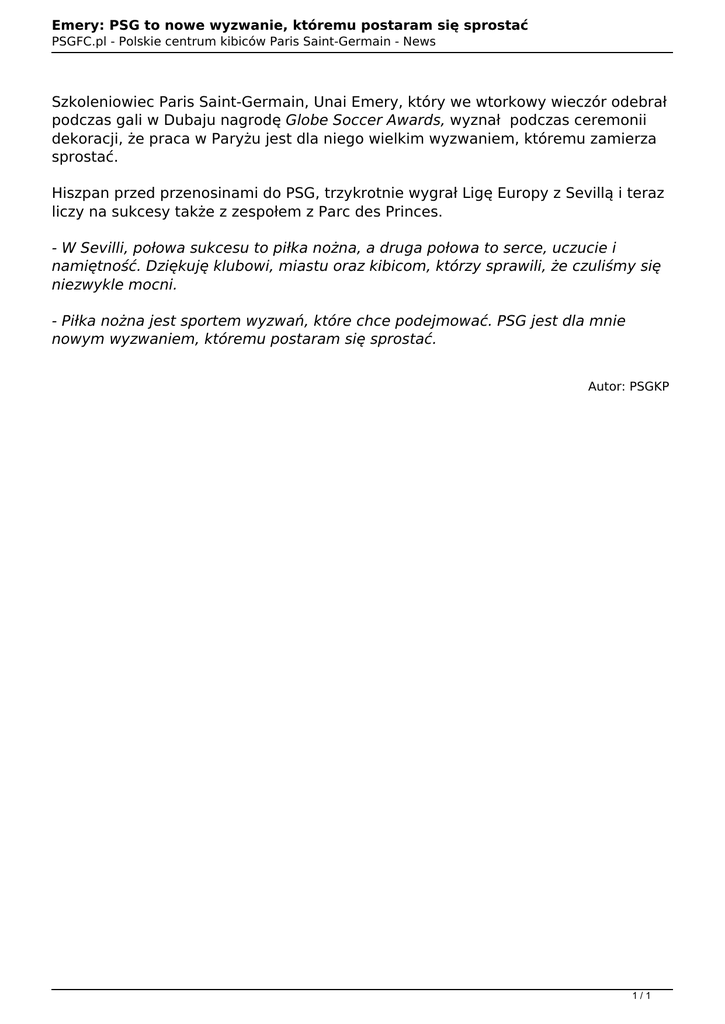 Emery: PSG to nowe wyzwanie, któremu postaram się sprostać PSGFC.pl - Polskie centrum kibiców Paris Saint-Germain - News Szkoleniowiec Paris Saint-Germain, Unai Emery, który we wtorkowy wieczór odebrał podczas gali w Dubaju nagrodę Globe Soccer Awards, wyznał podczas ceremonii dekoracji, że praca w Paryżu jest dla niego wielkim wyzwaniem, któremu zamierza sprostać. Hiszpan przed przenosinami do PSG, trzykrotnie wygrał Ligę Europy z Sevillą i teraz liczy na sukcesy także z zespołem z Parc des Princes. - W Sevilli, połowa sukcesu to piłka nożna, a druga połowa to serce, uczucie i namiętność. Dziękuję klubowi, miastu oraz kibicom, którzy sprawili, że czuliśmy się niezwykle mocni. - Piłka nożna jest sportem wyzwań, które chce podejmować. PSG jest dla mnie nowym wyzwaniem, któremu postaram się sprostać. Autor: PSGKP 1/1 Powered by TCPDF (www.tcpdf.org)