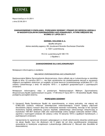 Raport bieŜący nr 31/2011 z dnia 22.06.2011 ZAWIADOMIENIE O ZWOŁANIU, PORZĄDEK DZIENNY I PRAWO DO WZIĘCIA UDZIAŁU W NADZWYCZAJNYM ZGROMADZENIU AKCJONARIUSZY, KTУRE OBĘDZIE SIĘ W DNIU 21 LIPCA 2011 KERNEL HOLDING S.A. Spуłka akcyjna Adres siedziby адресу: 65, boulevard Grande-Duchesse Charlotte L-1331 Luxembourg R.C.S. Luxembourg B 109 173 («Spуłka») ZAWIADOMIENIE DLA AKCJONARIUSZY Niniejszym informujemy o zwołaniu WALNEGO ZGROMADZENIA AKCJONARIUSZY Nadzwyczajne Walne Zgromadzenie Akcjonariuszy, ktуre odbyło się w Luksemburgu w siedzibie Spуłki w dniu 15 czerwca 2011 r., nie było uprawnione do podejmowania decyzji w sprawach objętych porządkiem dziennym ze względu na brak kworum przewidzianego artykułem 67-1 (2) ustawy Luksemburga z dnia 10 sierpnia 1915 r. o spуłkach gospodarczych z pуźniejszymi zmianami. Niniejszym informujemy więc o powtуrnym Nadzwyczajnym Walnym Zgromadzeniu Akcjonariuszy Spуłki zaplanowanym na godz. 17:00 dnia 21 lipca 2011 r. W siedzibie Spуłki. NiŜej podajemy porządek dzienny. PORZĄDEK DZIENNY 1) Uprawnić Radę Dyrektorуw Spуłki do wyemitowania, w miarę potrzeby, nie więcej niŜ 6.983.525 (sześciu milionуw dziewięciuset osiemdziesięciu trzech tysięcy pięciuset dwudziestu pięciu) nowych akcji bez wskazania wartości nominalnej, tworząc w ten sposуb dozwolony kapitał zakładowy (oprуcz kapitału zakładowego utworzonego dotychczas) w wysokości 184.407 dolarуw USA (sto osiemdziesiąt cztery tysiące czterysta siedem USD), zgodnie z wymogami artykułu 32 ustawy z dnia 10 sierpnia 1915 o spуłkach handlowych, z pуźniejszymi zmianami. Uprawnienia te ograniczyć okresem upływającym w chwili zakończenia otwartej subskrypcji na akcje Spуłki, lecz nie dłuŜszym niŜ 5 (pięć) lat od dnia opublikowania niniejszego zezwolenia w biuletynie urzędowym Luksemburga (Mйmorial C, Recueil des Sociйtйs et Associations). Uprawnić Radę Dyrektorуw do emisji tych nowych akcji bez nadania obecnym akcjonariuszom prawa poboru. 2) Wprowadzić zmiany do paragrafu 6 i 7 artykułu 5 Statutu Spуłki, ktуre otrzymają następujące brzmienie: «Artykuł 5 (paragraf 6) Dozwolony kapitał zakładowy (oprуcz kapitału zakładowego utworzonego dotychczas) określa się na 184.407 dolarуw USA (sto osiemdziesiąt cztery tysiące czterysta siedem USD) i składa sie z 6.983.525 (sześciu milionуw dziewięciuset osiemdziesięciu trzech tysięcy pięciuset dwudziestu pięciu) nowych akcji bez wskazania wartości nominalnej. (paragraf 7) W ciągu okresu po zakończeniu publicznej oferty akcji Spуłki, nie przekraczającego jednak 5 (pięciu) lat od dnia opublikowania niniejszego zezwolenia w Memorial C, Recueil des Sociйtйs et Associations Rada Dyrektorуw będzie uprawniona do wyemitowania akcji z dochodem lub bez dochodu z emisji oraz do nadawania prawa poboru». 3) Pozostałe sprawy. Dokumenty Projektu uchwał będą dostępne do zapoznania się przez Akcjonariuszy od dnia 22 czerwca 2011 r. Na stronie internetowe Spуłki pod adresem: www.kernel.ua lub w siedzibie Spуłki. Na Ŝądanie kopie wymienionych dokumentуw zostaną przesłane Akcjonariuszom zwykłą pocztą. Kapitał zakładowy Spуłki W wyniku emisji kapitał zakładowy Spуłki został podwyŜszony 12.764 USD i wynosi obecnie 1.945.446,46 USD, jest on podzielony na 73.674.410 akcji bez wskazania wartości nominalnej. Wyemitowany kapitał zakładowy Spуłki wynosi 1.945.446,46 (jeden milion dziewięćset czterdzieści pięć tysięcy czterysta czterdzieści sześć dolarуw i czterdzieści sześć centуw USA) i jest podzielony na 73.674.410 (siedemdziesiąt trzy miliony sześćset siedemdziesiąt cztery tysięcy czterysta dziesięć akcji bez wskazania wartości nominalnej. KaŜda akcja daje jej posiadaczowi prawo do jednego głosu. Prawo do wzięcia udziału w Zgromadzeniu Jak zostało powiedziane w zawiadomieniu o zwołaniu Zgromadzenia, opublikowanym 22 czerwca 2011 r. na stronie internetowej Giełdy Papierуw Wartościowych Luksemburga, w Zgromadzeniu moŜe uczestniczyć kaŜdy akcjonariusz posiadający jedną lub więcej akcji Spуłki według stanu na dzień 19 lipca 2011 r. (Dzień Rejestracji). Akcjonariusze (ktуrych akcie znajdują się na rachunkach inwestycyjnych w biurach maklerskich, u profesjonalnego depozytariusza lub subdepozytariusza wyznaczonego przez tego depozytariusza) powinni otrzymać u maklera, depozytariusza lub subdepozytariusza świadectwo o liczbie posiadanych akcji znajdujących się na ich rachunku na Dzień Rejestracji. W szczegуlności, Akcjonariusze trzymające swoje akcje w polskim krajowym Depozycie Papierуw Wartościowych powinni otrzymać świadectwo depozytowe od instytucji finansowych (maklerуw inwestycyjnych lub bankуw depozytowych) będących uczestnikami Krajowego Depozytu Papierуw Wartościowych i prowadzących rachunki inwestycyjne tych akcjonariuszy. Wolność obiegu akcji nie powinna być ograniczana trybem zwołania i przeprowadzenia Nadzwyczajnego Walnego Zgromadzenia Akcjonariuszy. W celu wzicia udziału w Nadzwyczajnym Walnym Zgromadzeniu Akcjonariuszy i oddania głosu na nim akcjonariusze powinni przed godziną 18:00 czasu środkowoeuropejskiego dnia 19 lipca 2011 r. dostarczyć Spуłce kopię świadectwa na adres siedziby Spуłki pocztą lub faksem na numer: +352 26383506 lub na adres poczty elektronicznej: [email protected]. Pełnomocnictwa Jeśli akcjonariusz zamierza oddać głos przez pełnomocnika, pełnomocnictwo powinno być dostarczone do siedziby Spуłki przed godz. 18:00 czasu środkowoeuropejskiego dnia 19 lipca 2011 r. Pełnomocnictwo moŜna wysłać poctą na adres siedziby Spуłki lub faksem na numer: +352 26383506 lub na adres poczty elektronicznej: [email protected]. Dla udogodnienia na stronie internetowej Spуłki pod adresem www.kernel.ua zamieszczono druk pełnomocnictwa. Jedna osoba moŜe reprezentować więcej niŜ jednego akcjonariusza. Wymogi co do kworum Przy podejmow