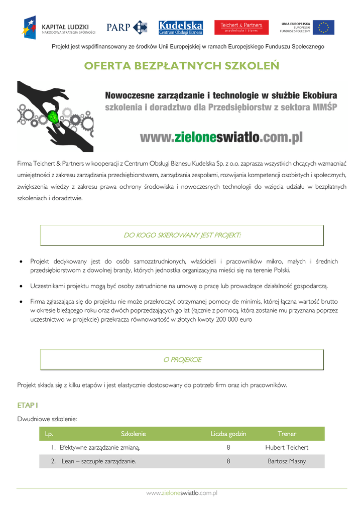 OFERTA BEZPŁATNYCH SZKOLEŃ Firma Teichert & Partners w kooperacji z Centrum Obsługi Biznesu Kudelska Sp. z o.o. zaprasza wszystkich chcących wzmacniać umiejętności z zakresu zarządzania przedsiębiorstwem, zarządzania zespołami, rozwijania kompetencji osobistych i społecznych, zwiększenia wiedzy z zakresu prawa ochrony środowiska i nowoczesnych technologii do wzięcia udziału w bezpłatnych szkoleniach i doradztwie. DO KOGO SKIEROWANY JEST PROJEKT: Projekt dedykowany jest do osób samozatrudnionych, właścicieli i pracowników mikro, małych i średnich przedsiębiorstwom z dowolnej branży, których jednostka organizacyjna mieści się na terenie Polski. Uczestnikami projektu mogą być osoby zatrudnione na umowę o pracę lub prowadzące działalność gospodarczą. Firma zgłaszająca się do projektu nie może przekroczyć otrzymanej pomocy de minimis, której łączna wartość brutto w okresie bieżącego roku oraz dwóch poprzedzających go lat (łącznie z pomocą, która zostanie mu przyznana poprzez uczestnictwo w projekcie) przekracza równowartość w złotych kwoty 200 000 euro O PROJEKCIE Projekt składa się z kilku etapów i jest elastycznie dostosowany do potrzeb firm oraz ich pracowników. ETAP I Dwudniowe szkolenie: Lp. Szkolenie Liczba godzin Trener 1. Efektywne I zarządzanie zmianą. 8 Hubert Teichert 2. Lean I – szczupłe zarządzanie. 8 Bartosz Masny www.zieloneswiatlo.com.pl DORADZTWO: Po dwudniowym szkoleniu następuje spotkanie z doradcą, podczas którego zostaje opracowany indywidualny plan działania, ustalenie ścieżki rozwoju dla firmy oraz uczestnika szkolenia. Z uwagi na tematykę oraz spotkanie z doradcą w celu ustalenia planów rozwojowych, wskazane jest, aby w pierwszym etapie projektu uczestniczyły osoby decyzyjne. Istnieje możliwość zakończenia udziału po pierwszym etapie projektu. ETAP II W zależności od wyników stworzonego Programu Działań Rozwojowych uczestnik projektu może wziąć udział i wybrać ścieżkę oraz tematykę szkoleń korzystną dla swojej firmy i własnego rozwoju. Mają Państwo możliwość uczestniczenia w dowolnej tematyce szkoleń i doradztwie oraz delegować na nie swoich pracowników. ŚCIEŻKI TEMATYCZNE: I. NOWOCZESNE ZARZĄDZANIE Lp. Szkolenie Liczba godzin Trener 1. Budowanie reputacji i wizerunku firmy przyjaznej środowisku 8 Joanna Jonczek 2. Warsztaty automotywacji i motywacji. 8 Joanna Kołtoniak 8 Michał Głuszyk 8 Hubert Teichert 8 Hubert Teichert 8 Agnieszka Deka 8 Paweł Roszkowski 8 Joanna Dauksza 8 Agnieszka Gajewska 8 Berenika Gocłowska 3. 4. 5. 6. 7. 8. 9. 10. Jakie zyski przynosi odpowiedzialność społeczna i środowiskowa w organizacji? Przekroczenie punktów krytycznych w trakcie wprowadzania zmiany dotyczącej ekologii firmy (praca na schemacie rozmowy oceniająco-motywującej wg. H. Teicherta) Work Life Balance – ekologia życia zawodowego i prywatnego Korzyści biznesowe ze skutecznej komunikacji ekologicznej przedsiębiorstwa (w firmie i poza nią). Eko Ego – Zarządzanie własną energią i czasem jako krok do ekologicznego funkcjonowania firmy Eko zarządzanie relacjami z pracownikami – coaching skoncentrowany na wdrażaniu celów. Eko Team Building – jako sposób na oswajanie pracowników z eko myśleniem i procedurami Ja jestem OK i Ty jesteś OK jako podstawa budująca ekologiczną platformę realizowania projektów przez grupy pracownicze. Istnieje również możliwość dostosowania tematyki szkoleń oraz doradztwa indywidulanie pod potrzeby przedsiębiorstwa w zależności od wyników badań potrzeb szkoleniowych. www.zieloneswiatlo.com.pl II. PRAWO OCHRONY ŚRODOWISKA Lp. III. Szkolenie Liczba godzin Trener 1. Spełnienie wymagań formalno prawnych w zakresie ochrony środowiska przez przedsiębiorstwa 8 Katarzyna Kudelska 2. Metody i zasady prowadzenia ewidencji środowiskowej 8 Anna Hojka 3. Sprawozdawczość środowiskowa 8 Anna Gudowska Liczba godzin Trener TECHNOLOGIE W SŁUŻBIE ŚRODOWISKA Lp. Szkolenie 1. Elektroniczna dokumentacja chroni środowisko 8 Jędrzej Kudelski 2. Świadomy wybór sprzętu elektronicznego receptą na efektywne korzystanie z zasobów 8 Jędrzej Kudelski 3. Bujaj w chmurze – bądź nowoczesny i ekologiczny 8 Jędrzej Kudelski 4. E-faktura – nowoczesność i oszczędność 8 Jędrzej Kudelski 5. Wideokonferencja zamiast stania w korkach 8 Jędrzej Kudelski CERTYFIKAT Uczestnicy, którzy zdecydują się na dalszy udział w projekcie w ramach jednej ze ścieżek szkoleniowo-doradczych i wdrożenie co najmniej jednej rekomendacji wynikającej z opracowanego planu działań, mają możliwość uzyskania certyfikatu GreenLine Certificate | Strategy & Balance. TEICHERT & PARTNERS ZAPEWNIA: Bezpłatne szkolenie w trzech ścieżkach szkoleniowych – uczestnik ma możliwość wyboru ilości szkoleń i ich terminów. Profesjonalnych doradców i trenerów – wiedza i umiejętności przekazywane są przez trenerów praktyków w swoich dziedzinach. Komfortowe klimatyzowane sale szkoleniowe. Poczęstunek oraz lunch podczas szkolenia. Pakiet szkoleniowy (notes, długopis, pendrive, torba ekologiczna) oraz literatura. www.zieloneswiatlo.com.pl Dofinansowanie kosztów dojazdu i noclegów podczas odbywania się szkoleń. Dla firm decydujących się na wdrożenia działań proekologicznych – certyfikat GreenLine Certificate | Strategy&Balance. REKRUTACJA: Dokumenty rekrutacyjne wystarczy wypełnić są na stronie projektu www.zieloneswiatlo.com.pl w postaci dwóch formularzy „Zgłoszenie przedsiębiorstwa” oraz „Zgłoszenie pracownika” i wysłać elektronicznie. W przypadku firm, które są na pełnej księgowości trzeba dostarczyć sprawozdanie finansowe z trzech ostatnich lat. Kserokopie zaświadczeń o otrzymanej pomocy de minimis w okresie trzech ostatnich lat. Wszystkie działania w projekcie są dla Przedsiębiorców bezpłatne i rozliczane w ramach pomocy de minimis. W razie dodatkowych pytań bądź wątpliwośc