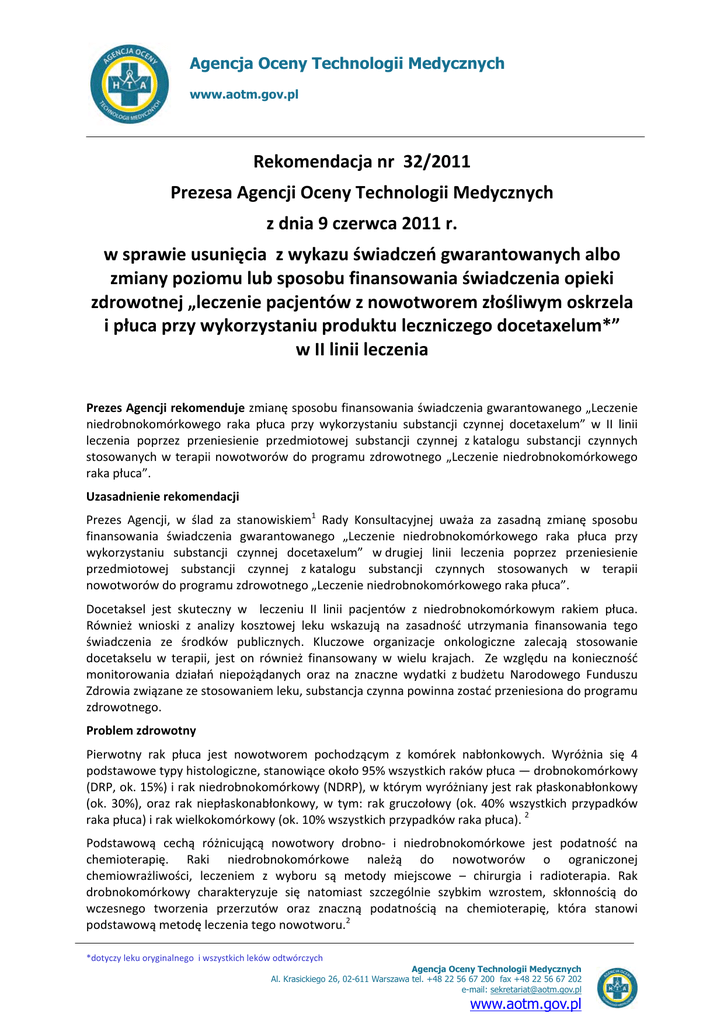 Agencja Oceny Technologii Medycznych www.aotm.gov.pl Rekomendacja nr 32/2011 Prezesa Agencji Oceny Technologii Medycznych z dnia 9 czerwca 2011 r. w sprawie usunięcia z wykazu świadczeń gwarantowanych albo zmiany poziomu lub sposobu finansowania świadczenia opieki zdrowotnej „leczenie pacjentów z nowotworem złośliwym oskrzela i płuca przy wykorzystaniu produktu leczniczego docetaxelum*” w II linii leczenia Prezes Agencji rekomenduje zmianę sposobu finansowania świadczenia gwarantowanego „Leczenie niedrobnokomórkowego raka płuca przy wykorzystaniu substancji czynnej docetaxelum” w II linii leczenia poprzez przeniesienie przedmiotowej substancji czynnej z katalogu substancji czynnych stosowanych w terapii nowotworów do programu zdrowotnego „Leczenie niedrobnokomórkowego raka płuca”. Uzasadnienie rekomendacji Prezes Agencji, w ślad za stanowiskiem1 Rady Konsultacyjnej uważa za zasadną zmianę sposobu finansowania świadczenia gwarantowanego „Leczenie niedrobnokomórkowego raka płuca przy wykorzystaniu substancji czynnej docetaxelum” w drugiej linii leczenia poprzez przeniesienie przedmiotowej substancji czynnej z katalogu substancji czynnych stosowanych w terapii nowotworów do programu zdrowotnego „Leczenie niedrobnokomórkowego raka płuca”. Docetaksel jest skuteczny w leczeniu II linii pacjentów z niedrobnokomórkowym rakiem płuca. Również wnioski z analizy kosztowej leku wskazują na zasadność utrzymania finansowania tego świadczenia ze środków publicznych. Kluczowe organizacje onkologiczne zalecają stosowanie docetakselu w terapii, jest on również finansowany w wielu krajach. Ze względu na konieczność monitorowania działań niepożądanych oraz na znaczne wydatki z budżetu Narodowego Funduszu Zdrowia związane ze stosowaniem leku, substancja czynna powinna zostać przeniesiona do programu zdrowotnego. Problem zdrowotny Pierwotny rak płuca jest nowotworem pochodzącym z komórek nabłonkowych. Wyróżnia się 4 podstawowe typy histologiczne, stanowiące około 95% wszystkich raków płuca — drobnokomórkowy (DRP, ok. 15%) i rak niedrobnokomórkowy (NDRP), w którym wyróżniany jest rak płaskonabłonkowy (ok. 30%), oraz rak niepłaskonabłonkowy, w tym: rak gruczołowy (ok. 40% wszystkich przypadków raka płuca) i rak wielkokomórkowy (ok. 10% wszystkich przypadków raka płuca). 2 Podstawową cechą różnicującą nowotwory drobno‐ i niedrobnokomórkowe jest podatność na chemioterapię. Raki niedrobnokomórkowe należą do nowotworów o ograniczonej chemiowrażliwości, leczeniem z wyboru są metody miejscowe – chirurgia i radioterapia. Rak drobnokomórkowy charakteryzuje się natomiast szczególnie szybkim wzrostem, skłonnością do wczesnego tworzenia przerzutów oraz znaczną podatnością na chemioterapię, która stanowi podstawową metodę leczenia tego nowotworu.2 *dotyczy leku oryginalnego i wszystkich leków odtwórczych Agencja Oceny Technologii Medycznych Al. Krasickiego 26, 02-611 Warszawa tel. +48 22 56 67 200 fax +48 22 56 67 202 e-mail: [email protected] www.aotm.gov.pl Rekomendacja nr 32/2011 Prezesa AOTM z dnia 9 czerwca 2011r. Określenie zaawansowania raka płuca obejmuje ocenę stanu guza pierwotnego (cecha T), regionalnych węzłów chłonnych (cecha N), narządów, w których mogą występować przerzuty (cecha M) z wykorzystaniem skali TNM‐UICC (International Union Against Cancer; UICC 2009). 2 U chorych poddanych zabiegowi operacyjnemu, w zależności od stopnia zaawansowania, prawdopodobieństwo pięcioletniego przeżycia wynosi 20‐70%, a najczęstszą formą niepowodzenia, niezależnie od stopnia zaawansowania, jest rozsiew nowotworu. 2 Ryzyko zachorowania na raka płuca zależy przede wszystkim od narażenia na działanie rakotwórczych składników dymu tytoniowego, a także niektórych fizycznych i chemicznych czynników środowiskowych (metale radioaktywne i gazowe produkty ich rozpadu, nikiel, chrom, arsen, azbest, związki węglowodorowe) oraz czynników genetycznych. 2 Dotychczasowe próby stosowania badań przesiewowych lub farmakologicznego zapobiegania w celu zmniejszenia umieralności z powodu raka płuca okazały się nieskuteczne, przy czym kontynuowane są prospektywne badania z wykorzystaniem niskodawkowej tomografii komputerowej. W związku z tym zasadnicze znaczenie ma pierwotna profilaktyka, która polega na całkowitej eliminacji narażenia na działanie składników dymu tytoniowego. 2 Eksperci oszacowali populację do stosowania docetakselu w ramach II linii NDRP w stadium zaawansowanym (nowotwór uogólniony lub miejscowo zaawansowany poza możliwościami doszczętnego leczenia) na około 800 osób (była to wartość oszacowana we własnym zakresie na podstawie częstości występowania nowotworu oraz innych demograficzno‐klinicznych czynników), w przypadku stosowania docetakselu w ramach drugiej linii leczenia niedrobnokomórkowego raka płuca w stadium zaawansowania miejscowego lub rozsiewu oszacowano liczbę chorych z tymi wskazaniami na około 1000 (na podstawie częstości występowania NDRP) lub na 2‐3 tysiące chorych NDRP rocznie (wszystkie typy histologiczne) w II linii leczenia. Na podstawie danych z Krajowego Rejestru Nowotworów w 2008 było około 11 tys. chorych na NDRP. Faktyczna liczba osób z NDRP może być większa, gdyż u ok. 1/3 pacjentów nie wpisano w karcie zgłoszenia nowotworu typu morfologicznego. Zakładając, że częstość występowaniu NDRP i DRP wśród nieokreślonych typów histologicznych jest podobna jak u tych pacjentów, u których określono typ morfologiczny, można szacować, że ok. 15 000 zachorowań na raka płuca to zachorowania na NDRP, ok. 3 800 to zachorowania na DRP i ok. 30 to zachorowania na mięsaki. Podmiot odpowiedzialny oszacował liczbę leczonych z rozpoznaniem C34 na ponad na rok 2014, a chorych przyjmujących docetaksel na osób. Według danych DGL NFZ w roku 2009 pacjentów chorych na nowotwór zło