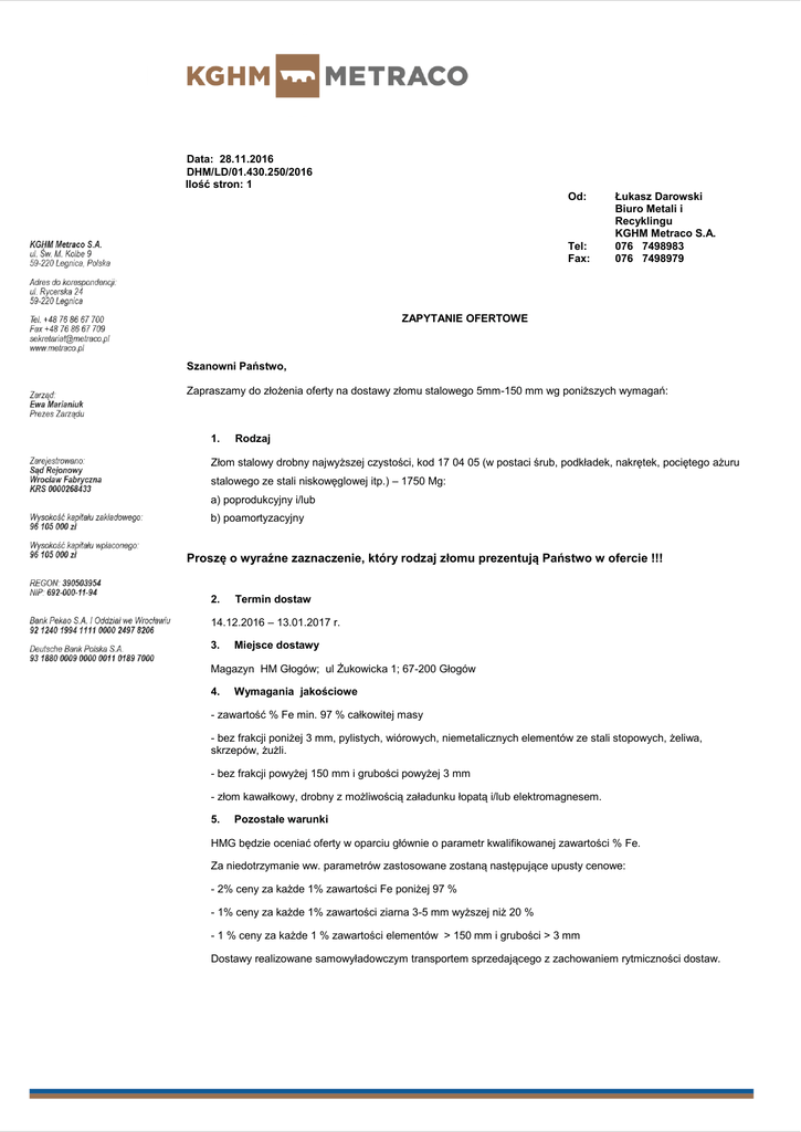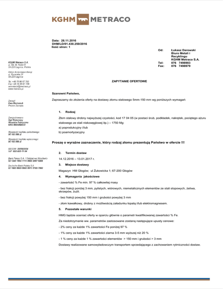 Data: 28.11.2016 DHM/LD/01.430.250/2016 Ilość stron: 1 Od: Tel: Fax: Łukasz Darowski Biuro Metali i Recyklingu KGHM Metraco S.A. 076 7498983 076 7498979 ZAPYTANIE OFERTOWE Szanowni Państwo, Zapraszamy do złożenia oferty na dostawy złomu stalowego 5mm-150 mm wg poniższych wymagań: 1. Rodzaj Złom stalowy drobny najwyższej czystości, kod 17 04 05 (w postaci śrub, podkładek, nakrętek, pociętego ażuru stalowego ze stali niskowęglowej itp.) – 1750 Mg: a) poprodukcyjny i/lub b) poamortyzacyjny Proszę o wyraźne zaznaczenie, który rodzaj złomu prezentują Państwo w ofercie !!! 2. Termin dostaw 14.12.2016 – 13.01.2017 r. 3. Miejsce dostawy Magazyn HM Głogów; ul Żukowicka 1; 67-200 Głogów 4. Wymagania jakościowe - zawartość % Fe min. 97 % całkowitej masy - bez frakcji poniżej 3 mm, pylistych, wiórowych, niemetalicznych elementów ze stali stopowych, żeliwa, skrzepów, żużli. - bez frakcji powyżej 150 mm i grubości powyżej 3 mm - złom kawałkowy, drobny z możliwością załadunku łopatą i/lub elektromagnesem. 5. Pozostałe warunki HMG będzie oceniać oferty w oparciu głównie o parametr kwalifikowanej zawartości % Fe. Za niedotrzymanie ww. parametrów zastosowane zostaną następujące upusty cenowe: - 2% ceny za każde 1% zawartości Fe poniżej 97 % - 1% ceny za każde 1% zawartości ziarna 3-5 mm wyższej niż 20 % - 1 % ceny za każde 1 % zawartości elementów > 150 mm i grubości > 3 mm Dostawy realizowane samowyładowczym transportem sprzedającego z zachowaniem rytmiczności dostaw. Ofertę należy dostarczyć w formie pisemnej w zamkniętej kopercie (WARUNEK KONIECZNY) adresowanej na ZOZ/KGHM Metraco S.A. Owczary 79b, 59-301 Lubin z dopiskiem: Oferta na złom stalowy do HMG grudzień 2016-styczeń 2017: do dnia 12.12.2016 r. do godz. 9.30. W dniu 12.12.2016 r. przeprowadzone zostaną negocjacje telefoniczne. Ostateczną decyzję dot. wyboru dostawców podjęta zostanie przez Dyrektora Finansowego HMG. W przypadku pytań lub wątpliwości proszę o kontakt KGHM Metraco S.A. Łukasz Darowski – Specjalista ds. handlu kom. 785 924 719, e-mail: [email protected] Sporządził: Łukasz Darowski