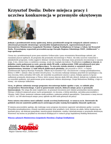 Krzysztof Dośla: Dobre miejsca pracy i uczciwa konkurencja w przemyśle okrętowym Jednym z przedstawicieli strony społecznej, którzy przedstawili uwagi do wstępnych założeń ustawy o aktywizacji przemysłu okrętowego i przemysłów komplementarnych, zaprezentowanych przez kierownictwo Ministerstwa Gospodarki Morskiej i Żeglugi Śródlądowej 22 lutego w Gdyni, był Krzysztof Dośla. Prezentujemy wypowiedź przewodniczącego Zarządu Regionu Gdańskiego NSZZ „Solidarność” z tego spotkania: Cieszę się z przedstawionych przez pana ministra Gróbarczyka i pana wiceministra Brzezickiego założeń, jak rozumiem jeszcze ogólnych, do programu dla przemysłu stoczniowego w Polsce. Ale żeby uczciwie rozmawiać o jakimkolwiek programie, trzeba najpierw dokonać rzetelnej oceny obecnego stanu przemysłu stoczniowego w naszym kraju. A ten, wbrew temu co niektórzy uważają, wcale nie wygląda tak dobrze. Przykładowo w jednej ze stoczni, w dodatku często podawanej za wzór, pracuje około 90 osób, a jednocześnie 1500 zatrudnionych jest jako jednoosobowe firmy lub osoby współpracujące. Ta stocznia została niestety w ostatnich latach upaństwowiona, kosztem 1,3 mld złotych publicznych pieniędzy, jak przyznali w 2014 r. w Sejmie przedstawiciele Agencji Rozwoju Przemysłu. Odbyło się to kosztem 9 tys. stoczniowców z innego przedsiębiorstwa, którzy w 2009 r. niemal z dnia na dzień stracili pracę. I ta stocznia wykazuje mniejszy przychód niż sąsiadująca z nią inna stocznia, która zatrudnia 430 osób, ale wszystkie na podstawie umowy o pracę. Kolejna sprawa to łączne zadłużenie przemysłu okrętowego w Polsce, które wynosi obecnie około 400 mln złotych. Jednak nie rozkłada się ono na wszystkie podmioty, jest generowane przez mniejszość sektora okrętowego. Grupa Remontowa Holding, z tego co wiemy, nie wykazuje zadłużenia. Liczę, że główne założenia nowego programu stoczniowego będzie zgodne z tym, co zakłada plan wicepremiera Morawieckiego. A jest to generowanie nowych, dobrych miejsc pracy w przemyśle innowacyjnym. Nie ulega dla mnie wątpliwości, że przemysł stoczniowy jest właśnie przemysłem innowacyjnym. Mówiąc o dobrych miejscach pracy warto przypomnieć, że stocznia, o której mówiłem, zatrudnia pracowników z Ukrainy, Indii i Korei, ponieważ rzekomo miała problem z naborem polskich specjalistów. Tymczasem w innej stoczni w 2015 r. na 100 oferowanych miejsc pracy zgłosiło się 800 osób gotowych do pracy! Nowa ustawa stoczniowa musi zakładać zasady uczciwej konkurencji, co oznacza m.in. kierowanie do polskich stoczni zamówień publicznych zawierających jako wymóg bezwzględny klauzule społeczne. W imieniu pracowników apeluję, aby realizując nowy program stoczniowy zapewnić zatrudnienie godne i uczciwe. Wszystkie przedsiębiorstwa z branży morskiej powinny brać przykład z tych, którym się udało, którzy konkurują nie kosztami pracy, ale dobrymi pomysłami, innowacyjnym działaniem, wiedzą i doświadczeniem w przemyśle okrętowym. Wzorować się można na przykład na stoczniach działających w ramach grupy kapitałowej Holding Remontowa. Więcej o planach Ministerstwa Gospodarki Morskiej i Żeglugi Śródlądowej