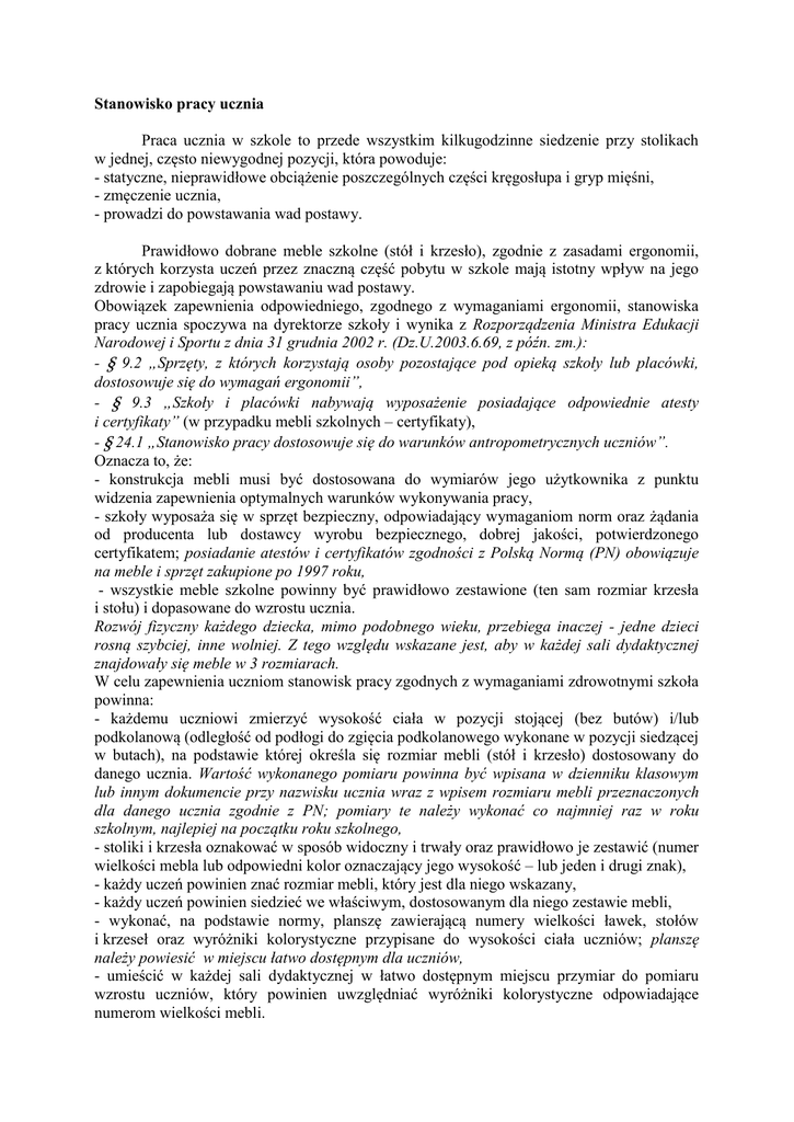 Stanowisko pracy ucznia Praca ucznia w szkole to przede wszystkim kilkugodzinne siedzenie przy stolikach w jednej, często niewygodnej pozycji, która powoduje: - statyczne, nieprawidłowe obciążenie poszczególnych części kręgosłupa i gryp mięśni, - zmęczenie ucznia, - prowadzi do powstawania wad postawy. Prawidłowo dobrane meble szkolne (stół i krzesło), zgodnie z zasadami ergonomii, z których korzysta uczeń przez znaczną część pobytu w szkole mają istotny wpływ na jego zdrowie i zapobiegają powstawaniu wad postawy. Obowiązek zapewnienia odpowiedniego, zgodnego z wymaganiami ergonomii, stanowiska pracy ucznia spoczywa na dyrektorze szkoły i wynika z Rozporządzenia Ministra Edukacji Narodowej i Sportu z dnia 31 grudnia 2002 r. (Dz.U.2003.6.69, z późn. zm.): - § 9.2 „Sprzęty, z których korzystają osoby pozostające pod opieką szkoły lub placówki, dostosowuje się do wymagań ergonomii”, - § 9.3 „Szkoły i placówki nabywają wyposażenie posiadające odpowiednie atesty i certyfikaty” (w przypadku mebli szkolnych – certyfikaty), - § 24.1 „Stanowisko pracy dostosowuje się do warunków antropometrycznych uczniów”. Oznacza to, że: - konstrukcja mebli musi być dostosowana do wymiarów jego użytkownika z punktu widzenia zapewnienia optymalnych warunków wykonywania pracy, - szkoły wyposaża się w sprzęt bezpieczny, odpowiadający wymaganiom norm oraz żądania od producenta lub dostawcy wyrobu bezpiecznego, dobrej jakości, potwierdzonego certyfikatem; posiadanie atestów i certyfikatów zgodności z Polską Normą (PN) obowiązuje na meble i sprzęt zakupione po 1997 roku, - wszystkie meble szkolne powinny być prawidłowo zestawione (ten sam rozmiar krzesła i stołu) i dopasowane do wzrostu ucznia. Rozwój fizyczny każdego dziecka, mimo podobnego wieku, przebiega inaczej - jedne dzieci rosną szybciej, inne wolniej. Z tego względu wskazane jest, aby w każdej sali dydaktycznej znajdowały się meble w 3 rozmiarach. W celu zapewnienia uczniom stanowisk pracy zgodnych z wymaganiami zdrowotnymi szkoła powinna: - każdemu uczniowi zmierzyć wysokość ciała w pozycji stojącej (bez butów) i/lub podkolanową (odległość od podłogi do zgięcia podkolanowego wykonane w pozycji siedzącej w butach), na podstawie której określa się rozmiar mebli (stół i krzesło) dostosowany do danego ucznia. Wartość wykonanego pomiaru powinna być wpisana w dzienniku klasowym lub innym dokumencie przy nazwisku ucznia wraz z wpisem rozmiaru mebli przeznaczonych dla danego ucznia zgodnie z PN; pomiary te należy wykonać co najmniej raz w roku szkolnym, najlepiej na początku roku szkolnego, - stoliki i krzesła oznakować w sposób widoczny i trwały oraz prawidłowo je zestawić (numer wielkości mebla lub odpowiedni kolor oznaczający jego wysokość – lub jeden i drugi znak), - każdy uczeń powinien znać rozmiar mebli, który jest dla niego wskazany, - każdy uczeń powinien siedzieć we właściwym, dostosowanym dla niego zestawie mebli, - wykonać, na podstawie normy, planszę zawierającą numery wielkości ławek, stołów i krzeseł oraz wyróżniki kolorystyczne przypisane do wysokości ciała uczniów; planszę należy powiesić w miejscu łatwo dostępnym dla uczniów, - umieścić w każdej sali dydaktycznej w łatwo dostępnym miejscu przymiar do pomiaru wzrostu uczniów, który powinien uwzględniać wyróżniki kolorystyczne odpowiadające numerom wielkości mebli. Użytkownik mebli (uczeń) powinien wiedzieć, jaki rozmiar mebli ma wybrać i rozumieć dlaczego. W tym celu szkoła powinna w każdym roku szkolnym przeprowadzić szkolenie uczniów poszczególnych klas w zakresie higieny, zdrowia, zasad ergonomii pod kątem właściwego doboru mebli oraz prawidłowej pozycji ciała w trakcie ich użytkowania w wyniku których uczeń będzie umiał: - odczytać z planszy odpowiedni do swojego wzrostu numer wielkości stołu i krzesła lub ich oznaczenie kolorystyczne, - odszukać w klasie/pracowni, w której ma zajęcia, meble odpowiednie do swojego wzrostu, - sprawdzić, czy stolik i krzesło, które wybrał mają ten sam numer lub kolor, - dobrać stanowisko pracy o jeden numer większe – w myśl zasady, że „lepiej siedzieć za wysoko niż za nisko”, jeśli nie znajdzie mebli „swojego rozmiaru”. PAMIĘTAJMY Utrwalenie w świadomości młodzieży znaczenia właściwego doboru mebli dla ich zdrowia będzie sukcesem, jeśli prowadzić będzie do wyrobienia prawidłowych nawyków i do samokontroli w organizacji swojego stanowiska pracy w szkole, w domu, a w przyszłości w pracy.