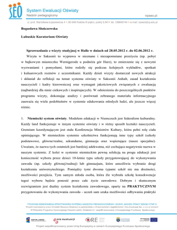Bogusława Słończewska Lubuskie Kuratorium Oświaty Sprawozdanie z wizyty studyjnej w Halle w dniach od 28.05.2012 r. do 02.06.2012 r. Wizyta w Saksonii to wyprawa w nieznane i niezapomniane przeżycia (np. pobyt w bajkowym miasteczku Wernigerode u podnóża gór Harz), to zmierzenie się z nowymi wyzwaniami i pomysłami, które rodziły się podczas kolejnych wykładów, spotkań i kuluarowych rozmów z uczestnikami. Każdy dzień wizyty dostarczał nowych atrakcji i skłaniał do refleksji na temat systemu oświaty w Saksonii Anhalt, zasad kształcenia nauczycieli i kadry kierowniczej oraz wymagań jakościowych związanych z ewaluacją (najbardziej dla mnie ciekawych i inspirujacych). W odniesieniu do poszczególnych punktów programu wizyty, dokonując analizy i porównań zebranego materiału informacyjnego zauważa się wiele podobieństw w systemie edukowania młodych ludzi, ale jeszcze więcej różnic. 1. Niemiecki system oświaty. Modelem edukacji w Niemczech jest federalizm kulturalny. Każdy land funkcjonuje w innym systemie oświaty i w różny sposób kształci nauczycieli. Gremium koordynującym jest stała Konferencja Ministrów Kultury, która pełni rolę ciała opiniującego. W niemieckim systemie szkolnictwa funkcjonują inne typy szkół (szkoły podstawowe, główne/realne, sekundarne, gimnazja oraz wspierające (nasze specjalne). Uważam, że nazwa tych ostatnich jest bardziej adekwatna, niż cechująca negatywnie nazwa w naszym systemie. Z kolei w systemie niemieckim pewną selekcją na progu edukacji jest konieczność wyboru przez dzieci 10-letnie typu szkoły przygotowującej do wykonywania zawodu (np. szkoły głównej/realnej) lub gimnazjum, które umożliwia wybranie drogi kształcenia uniwersyteckiego. Pomiędzy tymi dwoma typami szkół nie ma drożności, możliwości przejścia. Tym samym młoda osoba, która źle wybrała szkołę konsekwencje tegoż wyboru będzie ponosić przez całe życie zawodowe. Dobrym i skutecznym rozwiązaniem jest dualny system kształcenia zawodowego, oparty na PRAKTYCZNYM przygotowaniu do wykonywania zawodu - uczeń sam szuka możliwości odbywania praktyki w zakładzie pracy, a szkoła przygotowuje go teoretycznie. Kolejną różnicą związaną z niemieckim systemem oświaty jest indywidualne rozwiązywanie kwestii uczęszczania/przydziału dziecka do danej klasy. W tym przypadku możliwe jest „przeskoczenie” klasy, a decydującą rolę odgrywają umiejętności ucznia oraz decyzja jego rodziców. 2. Kształcenie nauczycieli. Nauczyciel w Niemczech do wykonywania zawodu przygotowywany jest komplementarnie, zgodnie z typem szkoły, w której będzie pracował (szkoła podstawowa, sekundarna, gimnazjalna lub specjalna). Charakterystyczna jest dwuetapowość kształcenia oraz to, że każda część kończy się egzaminem państwowym. Pierwszy etap to kształcenie uniwersyteckie, zgodnie z kierunkiem i typem szkoły, drugi to praktyczne przygotowanie do zawodu, nabywanie i rozwijanie kompetencji zawodowych. Dużą uwagę przykłada się do części praktycznej, która trwa 16 miesięcy i ma charakter modułowy. Nauczyciele kształcą się w zakresie: uczenia się i nauczania, wychowania, oceniania i doradztwa oraz metodyki. Ciekawym rozwiązaniem przygotowywania nauczycieli do wykonywania zawodu jest to, że właściwe kształcenie poprzedza 20-godzinny moduł przygotowawczy w czasie, którego kandydaci zapoznawani są ze specyfiką wykonywania zawodu nauczyciela i mają możliwość zweryfikowania swoich wyobrażeń ze szkolną rzeczywistością. Poza tym już na etapie ich kształcenia przygotowywani są do nauczania dwóch przedmiotów. Zdane egzaminy (obie części) dają kwalifikacje do wykonywania zawodu nauczyciela i starania się o zatrudnienie w szkole danego typu na terenie całej federacji. Charakterystyczny dla systemu kształcenia nauczycieli jest także ich wysoki status zawodowy potwierdzony wysokimi i pewnymi zarobkami (nie ma potrzeby wprowadzania dodatkowych systemów motywujących) w przypadku uzyskania zatrudnienia. 3. Kadry kierujące placówkami oświatowymi. Podobnie, jak w przypadku kształcenia nauczycieli w Saksonii Anhalt dużą wagę przykłada się do praktycznego przygotowania kadr kierowniczych. W związku z tym stawia się na: silnego, ustawicznie doskonalącego swoje umiejętności i kompetencje oraz wskazującego kierunki rozwoju dobrego przywódcę. wspomaganie w wyborze i towarzyszenie w rozwoju od początku drogi zawodowej, ze szczególnym zwróceniem uwagi na fazę preorientacji zawodowej przed wyborem i podjęciem decyzji. praktyczne przygotowanie do pełnienia funkcji kierowniczej, radzenia sobie w nowej, trudnej sytuacji. wykorzystywanie wyników ewaluacji szkoły do inicjowania zmian w szkole, w tym pomoc w doskonaleniu kadr kierujących placówkami oświatowymi. różnorodność działań kadry kierowniczej, bez zaburzania ich autonomii w podejmowaniu decyzji. wyposażanie kadry kierowniczej w przydatne umiejętności i kompetencje w zakresie komunikacji interpersonalnej, podejmowania decyzji oraz delegowania uprawnień. Wypracowaniu silnego przywództwa dyrektora ma pomóc przyjęty w Saksonii-Anhalt system kształcenia kadr do zarządzania placówkami oświatowymi, czyli Program Szkolenia Kadr. Zarządzających FESA i studia dla kadry kierowniczej kończące się dyplomem MBA. Całość systemu oparta została na modelu samorozwoju osobistego, PRAKTYCZNEGO przygotowania do pełnienia funkcji kierowniczej przed podjęciem decyzji o jej przyjęciu. Dlatego też, podobnie, jak w przypadku nauczycieli, dużą wagę w szkoleniu przykłada się do fazy orientacji, która pozwala kandydatowi zapoznać się ze specyfiką pracy na stanowisku dyrektora i zreflektować, czy poradzi sobie z tego rodzaju wyzwaniem. Czyni się nawet starania, by ten etap rozbudować o nowe formy, np. o badanie predyspozycji osobowych kandydata na dyrektora. Podsumowując, osoba zostająca dyrektorem jest p