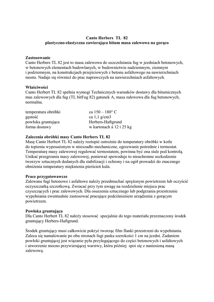 Canto Herbers TL 82 plastyczno-elastyczna zawierająca bitum masa zalewowa na gorąco Zastosowanie Canto Herbers TL 82 jest to masa zalewowa do uszczelniania fug w jezdniach betonowych, w betonowych elementach budowlanych, w budownictwie nadziemnym, ziemnym i podziemnym, na konstrukcjach przejściowych z betonu asfaltowego na nawierzchniach mostu. Nadaje się również do prac naprawczych na nawierzchniach asfaltowych. Właściwości Canto Herbert TL 82 spełnia wymogi Technicznych warunków dostawy dla bitumicznych mas zalewowych dla fug (TL bitFug 82) gatunek A, masa zalewowa dla fug betonowych, normalna. temperatura obróbki gęstość powłoka gruntująca forma dostawy ca 150 – 180° C ca 1,1 g/cm3 Herbers-Haftgrund w kartonach á 12 i 25 kg Zalecenia obróbki masy Canto Herbers TL 82 Masę Canto Herbert TL 82 należy roztopić ostrożnie do temperatury obróbki w kotle do topienia wyposażonym w mieszadło mechaniczne, ogrzewanie pośrednie i termostat. Temperaturę masy zalewowej regulować termostatem, powinna być ona stale pod kontrolą. Unikać przegrzania masy zalewowej, ponieważ spowoduje to nieuchronne uszkodzenie tworzyw sztucznych dodanych dla stabilizacji i ochrony i na ogół prowadzi do znacznego obniżenia temperatury mięknienia pierścień kula. Prace przygotowawcze Zalewane fugi betonowe i asfaltowe należy przedmuchać sprężonym powietrzem lub oczyścić oczyszczarką szczotkową. Zwracać przy tym uwagę na rozdzielenie miejsca prac czyszczących i prac zalewowych. Dla osuszenia sztucznego lub podgrzania przestrzenie wypełniania ewentualnie zastosować pracujące podciśnieniem urządzenia z gorącym powietrzem. Powłoka gruntująca Dla Canto Herbert TL 82 należy stosować specjalnie do tego materiału przeznaczony środek gruntujący Herbers-Haftgrund. Środek gruntujący musi całkowicie pokryć tworząc film flanki przestrzeni do wypełniania. Zaleca się namalowanie po obu stronach fugi paska szerokości 1 cm na jezdni. Zadaniem powłoki gruntującej jest wiązanie pyłu przylegającego do części betonowych i asfaltowych i utworzenie mocno przywierającej warstwy, która później spoi się z naniesioną masą zalewową. Zalewanie fug Po obróbce wstępnej fugi można zalewać tylko przy pogodzie suchej i temperaturze powierzchni elementu budowlanego powyżej + 5° C. Przed rozpoczęciem prac zalewania przestrzegać następujących punktów: 1. Naniesiona powłoka gruntująca musi być obsuszona, to znaczy, że powierzchnia z naniesioną powłoką gruntującą przy dotknięci palcem musi być odporna na ścieranie. 2. Fuga z naniesioną powłoką gruntującą musi być wolna od pyłu i sucha, aby zapewnić intensywne połączenie z betonem lub asfaltem. 3. Prace zalewania muszą być wykonane przy pomocy odpowiedniej maszyny do zalewania (patrz wyżej). 4. Masa zalewowa przy obróbce musi mieć podaną temperaturę. Jeżeli temperatura zalewania będzie znacznie poniżej wymaganej, to ucierpi zdolność płynięcia. Masa zalewowa ewentualnie nie wypełnia już całkowicie zalewanej fugi, Powstaje niebezpieczeństwo tworzenia się przestrzeni pustych, które potem pod toczącym się ruchem mogą osiadać. 5. W każdym przypadku należy unikać zalewania już wystygłą resztką stosowanej masy. 6. Ostudzenie masy zalewowej po zalaniu może zależnie od wymiarów przestrzeni do wypełnienia fugi powodować zmniejszenie objętości masy zalewowej; warunkuje to przy zalewaniu drugi etap pracy. Zaleca się wykonanie następnego zalewania bezpośrednio po przeprowadzeniu pierwszego zalewania. 7. Zalewanie fugi powinno być wykonane tak, aby nie było konieczne usuwanie masy zalewowej wystającej ponad flanki fugi. Usuwanie może działać ujemnie na przyczepność masy zalewowej do ścianek fugi. Zużycie materiału Zużycie masy zalewowej przy wypełnianiu fug oblicza się według następującego wzoru: długość fugi (cm) x szerokość fugi (cm) x głębokość fugi (cm) x gęstość (g.cm3) = zużycie w gramach. Zapotrzebowanie na powłokę gruntującą wynosi około 3% ilości masy zalewowej. Opakowanie Masa Canto Herbers TL 82 jest rozlewana do pojemników z blachy cienkiej i transportowana na paletach jednokierunkowych. Powleczenie pojemnika transportowego środkiem antyadhezyjnym i możliwość otwarcia tzw. zamka błyskawicznego gwarantuje szybkie, bezproblemowe i bezpieczne wyjęcie masy z pojemnika. Niniejsza informacja o produkcje odpowiada naszemu obecnemu stanowi wiedzy, podane dane są wartościami średnimi w warunkach normalnych. Użytkownik jest zobowiązany do sprawdzenia przydatności i możliwości zastosowania do przewidzianych celów. Chętnie służymy pomocą przy pytaniach dotyczących stosowania. Obowiązują nasze ogólne warunki handlowe i dostawy.