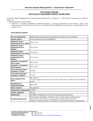 Mazurski Związek Międzygminny – Gospodarka Odpadami ZAPYTANIE CENOWE DOTYCZĄCE ZAMÓWIEŃ PONIŻEJ 30 000 EURO Mazurski Związek Międzygminny Gospodarka Odpadami ul. Wodna 4, 11-500 Giżycko zaprasza do złożenia oferty na: 1. Opis przedmiotu zamówienia : 1) dostawa i montaż urządzenia wielofunkcyjnego z funkcją drukowania, skanowania, faksu oraz kopiowania dla małych biur typu Konica Minolta bizhub C308 lub równorzędna o parametrach nie gorszych niż: Specyfikacja kopiarki Proces kopiowania Elektrostatyczne kopiowanie laserowe, tandemowe, pośrednie System tonera Toner polimeryzowany Simitri® HD Prędkość druku / 30 str./min. kopiowania A4 w czerni Prędkość druku / kopiowania A4 w kolorze 30 str./min. Prędkość druku / 15 str./min. kopiowania A3 w czerni Prędkość druku / kopiowania A3 w kolorze 15 str./min. Prędkość w dupleksie A4 w czerni 30 str./min. Prędkość w dupleksie A4 w kolorze 30 str./min. Czas pierwszej kopii / wydruku w czerni 5.6 sek. Czas pierwszej kopii / wydruku w kolorze 7.3 sek. Czas nagrzewania (sek.) Ok. 20 sek. * * Czas przygotowania do pracy może różnić się w zależności od środwiska pracy Rozdzielczość kopiowania (dpi) 600 x 600 Skala szarości 256 odcieni Kopiowanie wielokrotne 1-9,999 A5-A3 Skalowanie 25-400% w odstępach 0.1%; automatyczne powiększenie Funkcje kopiowania Wstawianie rozdziałów; okładek i stron; kopia próbna (drukowana i ekranowa); druk próbny do regulacji; funkcje grafiki cyfrowej; pamięć ustawień zadań; tryb plakatu; powtarzanie obrazu; nakładanie Strona 1 Format oryginału Procedury zamówień publicznych do 30 000 euro Mazurski Związek Międzygminny tel. +48 87 428 43 42 Gospodarka Odpadami fax. +48 87 429 13 75 11-500 Giżycko, ul. Wodna 4 www.mzmgo.mazury.pl; e-mail: [email protected] Mazurski Związek Międzygminny – Gospodarka Odpadami (opcjonalne); pieczętowanie; ochrona kopii Specyfikacja drukarki Rozdzielczość drukowania (dpi) 1 800 x 6001 200 x 1 200PCL 6 (XL 3.0)PCL 5c Systemy operacyjne PostScript 3 (CPSI 3016)XPSWindows VISTA (32/64)Windows 7 (32/64)Windows 8 (32/64)Windows Server 2008 (32/64)Windows Server 2008 R2 (64)Windows Server 2012 (64)Windows Server 2012 R2Macintosh OS X 10.xUnix, Linux, Citrix Czcionki drukarki 80 PCL Latin, 137 PostScript 3 Emulation Latin Funkcje drukowania Bezpośredni wydruk plików PCL; PS; TIFF; XPS; PDF (wer. 1.7); szyfrowanych plików PDF i OOXML (DOCX; XLSX; PPTX); Mixmedia i Mixplex; programowanie zadań "Easy Set”; nakładka; znak wodny' ochrona kopii; tryb "carbon copy" Specyfikacja skanera Prędkość skanowania w kolorze Do 160 obrazów/min. (opcjonalnie z DF-704) Prędkość skanowania w czerni Do 160 obrazów/min. (opcjonalnie z DF-704) Rozdzielczość skanowania (dpi) Maks. 600 x 600 Skanowanie do e-mail (Scan-to-Me)Skanowanie do SMB (Scan-to-Home) Tryby skanowania Skanowanie do FTPSkanowanie do skrzynki użytkownika,Skanowanie do USB, Skanowanie do WebDAVSkanowanie do DPWSSkanowanie sieciowe TWAIN Formaty plików JPEG; TIFF; PDF; PDF/A 1a i 1b (opcja); kompaktowy PDF; szyfrowany PDF; przeszukiwalny PDF (opcja); XPS; kompaktowy XPS; PPTX; przeszukiwalny DOCX/XLSX (opcja) Miejsca docelowe 2 100 (pojedynczo i grupami); obsługa LDAP skanowania Funkcje skanowania Komentarze (tekst/godzina/data) dla PDF; do 400 programów prac; Podgląd skanowania w czasie rzeczywistym Specyfikacja faksu Super G3 (opcjonalnie) Transmisja faksu Analogowai-FaxKolorowy i-Fax (RFC3949-C)IP-Fax Rozdzielczość faksu (dpi) Maks.: 600 x 600 (ultra-fine) Kompresja faksu MH; MR; MMR; JBIG Prędkość modemu (Kbps) Do 33.6 Kbps Strona 2 Standard faksu Procedury zamówień publicznych do 30 000 euro Mazurski Związek Międzygminny tel. +48 87 428 43 42 Gospodarka Odpadami fax. +48 87 429 13 75 11-500 Giżycko, ul. Wodna 4 www.mzmgo.mazury.pl; e-mail: [email protected] Mazurski Związek Międzygminny – Gospodarka Odpadami Miejsca docelowe faksowania 2100 (pojedynczo i grupami) Funkcje faksowania Odpytywanie; przesunięcie czasowe; PC-Faks; odbiór do skrzynki poufnej; Odbiór do e-mail/FTP/SMBB; do 400 programów zadań Specyfikacja skrzynek użytkownika Maks. ilość przechowywanych dokumentów Do 3000 dokumentów lub 10 000 stron Rodzaje skrzynek PublicznyPrywatny (z hasłem lub uwierzytelnieniem)Grupowy (z uwierzytelnieniem) Rodzaje skrzynek systemowych Bezpieczny drukDruk szyfrowanych PDFOdbiór faksuOdpytywanie faksu Funkcjonalność skrzynek użytkownika PobieranieWysyłanie (e-mail/FTP/SMB i faks)Kopiowanie ze skrzynki do skrzynki Specyfikacja systemu 2,048 (standard) Standardowy dysk twardy (GB) 250 (standard) Standardowe interfejsy 10-Base-T/100-Base-T/1000-Base-T Ethernet; USB 2.0 Protokoły sieciowe TCP/IP (IPv4 / IPv6); IPX/SPX; NetBEUI; AppleTalk (EtherTalk); SMB; LPD; IPP; SNMP; HTTP Rodzaje ramek Ethernet 802.2; Ethernet 802.3; Ethernet II; Ethernet SNAP Automatyczny podajnik dokumentów Do 100 oryginałów; A6-A3; 35-163 g/m² Dostępny RADF lub Dalscan ADF Rozmiar papieru A6-SRA3, własne formaty papieru; papier bannerowy maks. 1 200 x 297 mm Gramatura papieru (g/m²) 52-300 g/m² Pojemność papieru (arkusze) Standard: 1 150 arkuszyMaks.: 6 650 arkuszy Standardowe podajniki papieru Taca 1: 500 arkuszy, A5-A3, 52-256 g/m² Taca 2: 500 arkuszy, A5-SRA3, 52-256 g/m² Podajnik ręczny: 150 arkuszy, A6-SRA3, własne formaty papieru, banner, 60-300 g/m² Opcjonalne podajniki papieru Taca 3: 500 arkuszy, A5-A3, 52-256 g/m² Taca 3 + 4: 2x 500 arkuszy, A5-A3, 52-256 g/m² Kaseta o dużej pojemności: 2,500 arkuszy, A4, 52-256 g/m² Automatyczny dupleks A5-SRA3; 52-256 g/m² Tryby wykańczania (opcja) Przesunięcie; grupowanie; sortowanie; zszywanie; dziurkowanie; składanie na pół; broszurowanie Pojemność wyjścia (z finiszerem) Maks.: 3,300 arkuszy Pojemność wyjścia (bez finiszera) Maks.: 250 arkuszy Zszywanie 50 arkuszy lub 48 arkuszy + 2 okładki (do 209 g/m² Strona 3 Standardowa pamięć systemu (MB) Procedury zamówień publicznych do 30 00