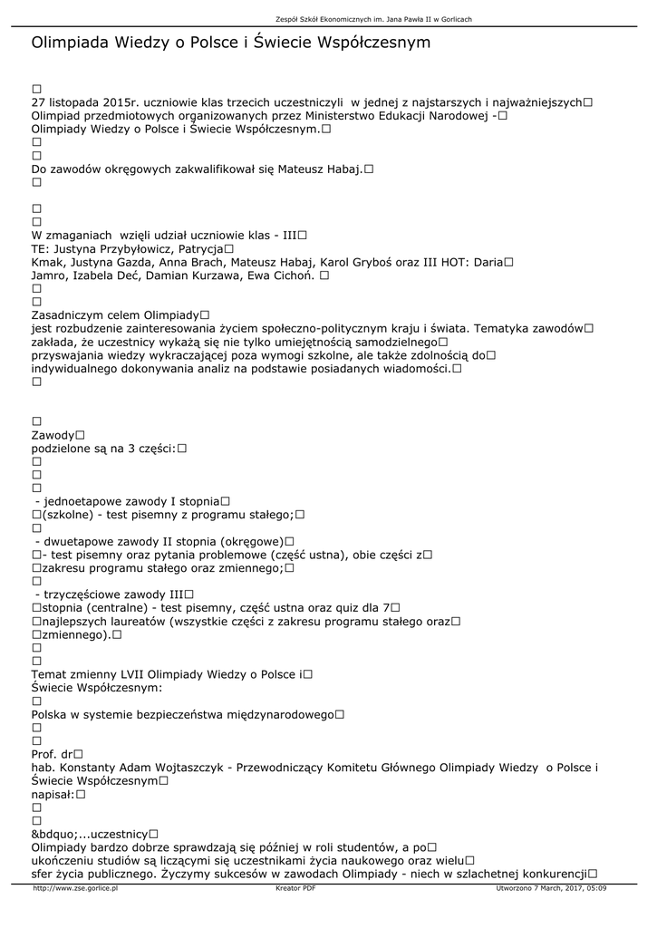 Zespół Szkół Ekonomicznych im. Jana Pawła II w Gorlicach Olimpiada Wiedzy o Polsce i Świecie Współczesnym 27 listopada 2015r. uczniowie klas trzecich uczestniczyli w jednej z najstarszych i najważniejszych Olimpiad przedmiotowych organizowanych przez Ministerstwo Edukacji Narodowej - Olimpiady Wiedzy o Polsce i Świecie Współczesnym. Do zawodów okręgowych zakwalifikował się Mateusz Habaj. W zmaganiach wzięli udział uczniowie klas - III TE: Justyna Przybyłowicz, Patrycja Kmak, Justyna Gazda, Anna Brach, Mateusz Habaj, Karol Gryboś oraz III HOT: Daria Jamro, Izabela Deć, Damian Kurzawa, Ewa Cichoń. Zasadniczym celem Olimpiady jest rozbudzenie zainteresowania życiem społeczno-politycznym kraju i świata. Tematyka zawodów zakłada, że uczestnicy wykażą się nie tylko umiejętnością samodzielnego przyswajania wiedzy wykraczającej poza wymogi szkolne, ale także zdolnością do indywidualnego dokonywania analiz na podstawie posiadanych wiadomości. Zawody podzielone są na 3 części: - jednoetapowe zawody I stopnia (szkolne) - test pisemny z programu stałego; - dwuetapowe zawody II stopnia (okręgowe) - test pisemny oraz pytania problemowe (część ustna), obie części z zakresu programu stałego oraz zmiennego; - trzyczęściowe zawody III stopnia (centralne) - test pisemny, część ustna oraz quiz dla 7 najlepszych laureatów (wszystkie części z zakresu programu stałego oraz zmiennego). Temat zmienny LVII Olimpiady Wiedzy o Polsce i Świecie Współczesnym: Polska w systemie bezpieczeństwa międzynarodowego Prof. dr hab. Konstanty Adam Wojtaszczyk - Przewodniczący Komitetu Głównego Olimpiady Wiedzy o Polsce i Świecie Współczesnym napisał: „...uczestnicy Olimpiady bardzo dobrze sprawdzają się później w roli studentów, a po ukończeniu studiów są liczącymi się uczestnikami życia naukowego oraz wielu sfer życia publicznego. Życzymy sukcesów w zawodach Olimpiady - niech w szlachetnej konkurencji http://www.zse.gorlice.pl Kreator PDF Utworzono 7 March, 2017, 05:09 Zespół Szkół Ekonomicznych im. Jana Pawła II w Gorlicach zwyciężają najlepsi. Powodzenia!..." Olimpiada ma opinię jednej z najcięższych i najbardziej wymagających, a jej program wykracza dalece poza podstawę programową wiedzy o społeczeństwie. Uczestnicy muszą zmierzyć się z pytaniami dotyczącymi problemów współczesnego świata, gospodarki, polityki międzynarodowej, konstytucyjnych ustrojów państw, integracji europejskiej oraz historii najnowszej. Zakres materiału jest olbrzymi, trudność pytań więcej niż trudna, co sprawia, że zawody co roku stoją na bardzo wysokim poziomie i są przedmiotem zainteresowania kilku tysięcy uczniów ze szkół ponadgimnazjalnych z całej Polski. Wszystkim uczestnikom gratulujemy, a Mateuszowi życzymy powodzenia i trzymamy kciuki! Paulina Kwiatek http://www.zse.gorlice.pl Kreator PDF Utworzono 7 March, 2017, 05:09