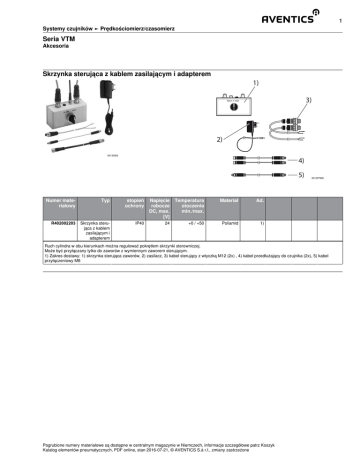 1 Systemy czujników ► Prędkościomierz/czasomierz Seria VTM Akcesoria Skrzynka sterująca z kablem zasilającym i adapterem 1) 3) Return 0 Start 2) 00133563 4) 5) Numer materiałowy Typ stopień ochrony R402002203 Skrzynka sterująca z kablem zasilającym i adapterem IP40 Napięcie robocze DC, max. [V] 24 Temperatura otoczenia min./max. Materiał Ad. +0 / +50 Poliamid 1) 001237990 Ruch cylindra w obu kierunkach można regulować pokrętłem skrzynki sterowniczej. Może być przyłączany tylko do zaworów z wymiennym zaworem sterującym. 1) Zakres dostawy: 1) skrzynka sterująca zaworów, 2) zasilacz, 3) kabel sterujący z wtyczką M12 (2x) , 4) kabel przedłużający do czujnika (2x), 5) kabel przyłączeniowy M8 Pogrubione numery materiałowe są dostępne w centralnym magazynie w Niemczech, informacje szczegółowe patrz Koszyk Katalog elementów pneumatycznych, PDF online, stan 2016-07-21, © AVENTICS S.à r.l., zmiany zastrzeżone