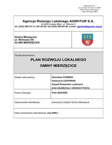 Załącznik Nr 1 do uchwały Nr XX/115/2008 Rady Gminy Mierzęcice z dnia 29 maja 2008r. Agencja Rozwoju Lokalnego AGROTUR S.A. 42-693 Krupski Młyn, ul. Główna 5 tel. (032) 285-70-13, 381-03-20, fax (032) 284-84-36, e-mail: [email protected] Gmina Mierzęcice ul. Wolności 95 42-460 MIERZĘCICE Temat opracowania: PLAN ROZWOJU LOKALNEGO GMINY MIERZĘCICE Zespół wykonawczy: Stanisław KORMAN Katarzyna ŁĘGOWIAK Zespół Ekspertów Lokalnych przy współpracy z władzami Gminy Prezes Zarządu: Piotr BUDZISZ Opracowanie aktualizacji: pracownicy Urzędu Gminy Mierzęcice Data opracowania (aktualizacji): maj 2008 r. PLAN ROZWOJU LOKALNEGO GMINY MIERZĘCICE SPIS TREŚCI 1 WSTĘP.......................................................................................................................................................................4 1.1Cel opracowania.....................................................................................................................................................4 1.2 Metodologia opracowania....................................................................................................................................6 2 OBSZAR I CZAS REALIZACJI PLANU ROZWOJU LOKALNEGO...................................................................6 3 AKTUALNA SYTUACJA SPOŁECZNO-GOSPODARCZA GMINY MIERZĘCICE..........................................7 3.1Położenie, powierzchnia, ludność..........................................................................................................................7 3.2Środowisko przyrodnicze.....................................................................................................................................11 3.3Zagospodarowanie przestrzenne..........................................................................................................................15 3.4Gospodarka..........................................................................................................................................................16 3.5 Sfera społeczna...................................................................................................................................................16 3.6Szanse rozwojowe ...............................................................................................................................................19 3.7Zagrożenia rozwojowe ........................................................................................................................................20 ZADANIA POLEGAJCE NA POPRAWIE SYTAUACJI NA DANYM OBSZARZE ........................................21 4.1Zakres zadań przyjętych do realizacji..................................................................................................................21 4.2Zadania do zrealizowania według hierarchii ważności .......................................................................................21 5 REALIZACJA ZADAŃ I PROJEKTÓW................................................................................................................23 5.1Szczegółowy opis zadań i projektów do realizacji w latach 2008-2013..............................................................23 6 POWIĄZANIE PROJEKTÓW Z INNYMI DZIAŁANIAMI REALIZOWANYMI NA TERENIE GMINY/WOJEWÓDZTWA.......................................................................................................................................46 7 OCZEKIWANE WSKAŹNIKI OSIĄGNIĘĆ PLANU...........................................................................................47 8 PLAN FINANSOWY NA LATA 2008 – 2013........................................................................................................50 8.1Źródła finansowania planu rozwoju lokalnego w latach 2008 – 2013................................................................50 9 SYSTEM WDRAŻANIA, SPOSOBY MONITOROWANIA, OCENY I KOMUNIKACJI SPOŁECZNEJ..............................................................................................................................52 9.1System wdrażania................................................................................................................................................52 9.2Sposoby monitorowania, oceny i komunikacji społecznej..................................................................................55 9.2.1 Monitoring..................................................................................................................................................55 Brak.............................................................................................................................................................................56 9.2.2 Organizacja monitoringu............................................................................................................................56 9.2.3 Narzędzia monitoringu................................................................................................................................58 9.2.4 Sposoby inicjowania współpracy pomiędzy sektorem publicznym, prywatnym i organizacjami pozarządowymi.....................................................................................................................................................62 9.2.5 Public Relations Planu Rozwoju Lokalnego...............................................................................................62 Agencja Rozwoju Lokalnego AGROTUR S.A. str. 2 PLAN ROZWOJU LOKALNEGO GMINY MIERZĘCICE SPIS RYSUNKÓW I TABEL Tabela 1: Położenie komunikacyjne powiatu będzińskiego..........................................................................................7 Tabela 2: Udział Gminy Mierzęcice w ogólnej powierzchni powiatu będzińskiego i na tle pozostałych gmin powiatu będzińskiego...............................................................................................................................