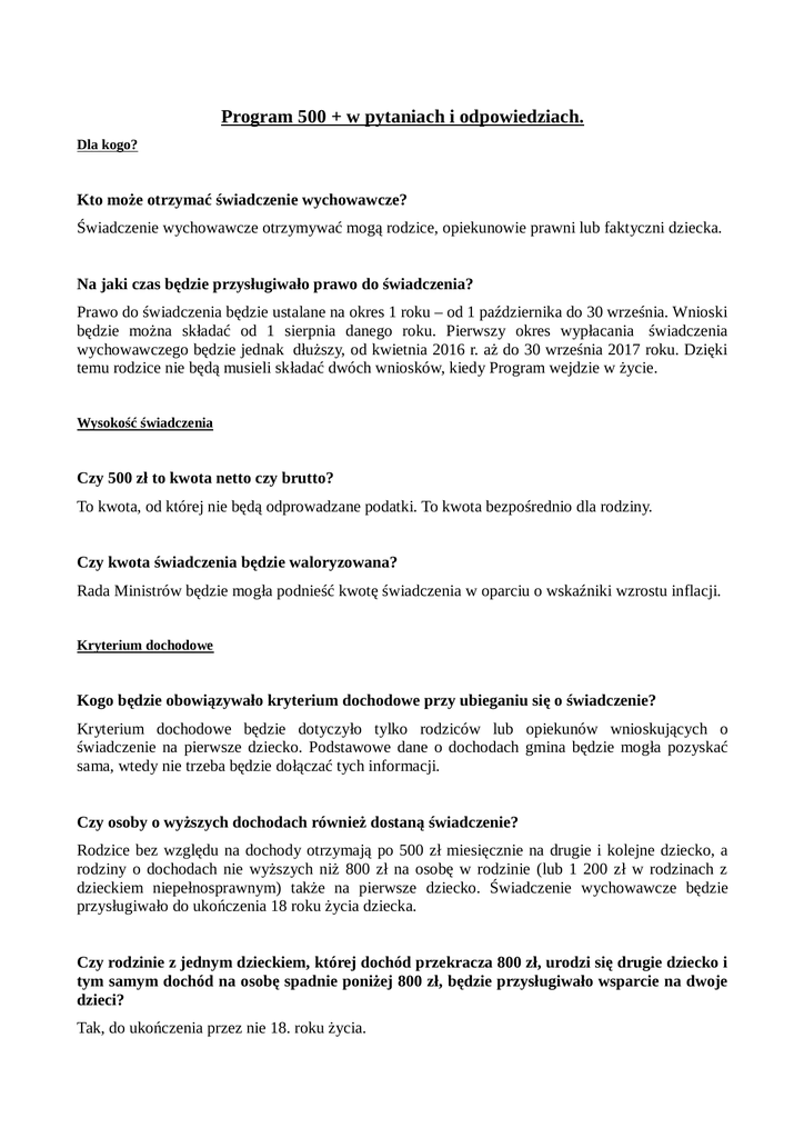 Program 500 + w pytaniach i odpowiedziach. Dla kogo? Kto może otrzymać świadczenie wychowawcze? Świadczenie wychowawcze otrzymywać mogą rodzice, opiekunowie prawni lub faktyczni dziecka. Na jaki czas będzie przysługiwało prawo do świadczenia? Prawo do świadczenia będzie ustalane na okres 1 roku – od 1 października do 30 września. Wnioski będzie można składać od 1 sierpnia danego roku. Pierwszy okres wypłacania świadczenia wychowawczego będzie jednak dłuższy, od kwietnia 2016 r. aż do 30 września 2017 roku. Dzięki temu rodzice nie będą musieli składać dwóch wniosków, kiedy Program wejdzie w życie. Wysokość świadczenia Czy 500 zł to kwota netto czy brutto? To kwota, od której nie będą odprowadzane podatki. To kwota bezpośrednio dla rodziny. Czy kwota świadczenia będzie waloryzowana? Rada Ministrów będzie mogła podnieść kwotę świadczenia w oparciu o wskaźniki wzrostu inflacji. Kryterium dochodowe Kogo będzie obowiązywało kryterium dochodowe przy ubieganiu się o świadczenie? Kryterium dochodowe będzie dotyczyło tylko rodziców lub opiekunów wnioskujących o świadczenie na pierwsze dziecko. Podstawowe dane o dochodach gmina będzie mogła pozyskać sama, wtedy nie trzeba będzie dołączać tych informacji. Czy osoby o wyższych dochodach również dostaną świadczenie? Rodzice bez względu na dochody otrzymają po 500 zł miesięcznie na drugie i kolejne dziecko, a rodziny o dochodach nie wyższych niż 800 zł na osobę w rodzinie (lub 1 200 zł w rodzinach z dzieckiem niepełnosprawnym) także na pierwsze dziecko. Świadczenie wychowawcze będzie przysługiwało do ukończenia 18 roku życia dziecka. Czy rodzinie z jednym dzieckiem, której dochód przekracza 800 zł, urodzi się drugie dziecko i tym samym dochód na osobę spadnie poniżej 800 zł, będzie przysługiwało wsparcie na dwoje dzieci? Tak, do ukończenia przez nie 18. roku życia. Czy rodzice dostaną 500 złotych na drugie dziecko, w przypadku, gdy pierwsze skończyło 18 lat, ale nadal pozostaje na ich utrzymaniu? Dziecko do 25 r.ż., które nadal mieszka z rodzicami, jest uwzględniane przy obliczaniu dochodu na osobę w rodzinie. Dzięki temu jego młodszy brat lub siostra może nadal otrzymywać wsparcie, jeśli dochód na osobę nie przekroczy 800 zł (1200 zł w przypadku dziecka niepełnosprawnego). Jak otrzymać świadczenie (składanie wniosku, wypłata świadczeń) Jak otrzymać świadczenie? Wystarczy złożyć wniosek – przez internet lub w gminie.. Świadczenie zostanie przekazane bezpośrednio na konto wskazane przez rodzica lub gotówką. Kiedy można złożyć wniosek? Wnioski będzie można składać od momentu startu programu. Jeśli wniosek zostanie złożony w ciągu pierwszych 3 miesięcy, rodzice dostaną wyrównanie wstecz – pozwoli to uniknąć kolejek i zapewni płynność wypłat. W kolejnych miesiącach świadczenie będzie wypłacane od miesiąca, w którym rodzice złożą wniosek. Do programu będzie można dołączyć w dowolnym momencie. Liczenie dochodu Czy urzędnicy ośrodków pomocy społecznej będą mieli dostęp do informacji o dochodach Polaków, którzy wystąpią o 500 zł zasiłku na dziecko? Gromadzenie danych o dochodach będzie odbywało się w ten sam sposób, jak w przypadku innych świadczeń. Dostęp do podstawowych informacji o dochodach gmina będzie miała jedynie w przypadku tych osób, które starają się o świadczenie na pierwsze dziecko. Status rodziny (samotni rodzice, rodziny patchworkowe, rozwód, adopcja, piecza zastępcza) Czy samotni rodzice również dostaną wsparcie z Programu? Świadczenie otrzyma każda rodzina bez względu na stan cywilny rodziców. Otrzymają je zatem zarówno rodziny, w których rodzice są w związku małżeńskim jak i rodziny niepełne oraz rodzice pozostający w nieformalnych związkach. Rodziny niepełne, obok świadczenia wychowawczego mogą też otrzymać świadczenia wypłacane z Funduszu Alimentacyjnego czy specjalny dodatek z ustawy o świadczeniach rodzinnych. Jak liczyć dzieci z tzw. patchworkowych związków? Jeżeli rodzina obok dzieci z poprzednich związków posiadać będzie jeszcze wspólne dziecko do składu rodziny wliczane będą wszystkie dzieci. Jak zasiłek będzie wypłacany w przypadku rodziców, którzy się rozwodzą? Świadczenie przysługiwać będzie temu z rodziców, który z dzieckiem zamieszkuje i na którego utrzymaniu dziecko się znajduje. Czy Program Rodzina 500plus dotyczy także dzieci adoptowanych? Tak, świadczenie będzie przysługiwać na takich samych zasadach jak w przypadku dzieci biologicznych. Czy dzieciom, które znajdują się w tzw. pieczy zastępczej, 500 zł nie będzie przysługiwać? Dla rodzin zastępczych kierowane jest odrębne wsparcie w oparciu o ustawę o wspieraniu rodziny i systemie pieczy zastępczej, w którym obok licznych dodatków podstawowe wsparcie kształtuje się na poziomie nie niższym niż 660 zł (rodziny spokrewnione) oraz 1000 zł (rodziny niespokrewnione). Dodatkowe wsparcie w wysokości 500 zł otrzymają także rodziny zastępcze, na podstawie ustawy o wspieraniu rodziny i systemie pieczy zastępczej. Wydatkowanie świadczenia Czy projekt zakłada kontrolę wydatkowania przyznanych środków? Nie traktujemy polskich rodzin, jako rodziny patologiczne. Szanujemy autonomię rodziny i wierzymy, że ona najlepiej wie, czego dziecku potrzeba. Projekt ustawy zawiera możliwe do zastosowania w nadzwyczajnych sytuacjach, mechanizmy zapobiegające marnotrawieniu świadczeń lub zapobiegania wydatkowaniu świadczenia niezgodnie z jego przeznaczeniem. Będzie to takie samo rozwiązanie jak obowiązujące od wielu lat w ustawie o świadczeniach rodzinnych. W przypadku sygnałów o marnotrawieniu świadczenia, u rodziny będzie mógł zostać przeprowadzony wywiad środowiskowy, aby ustalić jak wygląda sytuacja w danej rodzinie. Urzędnicy pomocy społecznej z reguły wiedzą, gdzie mogą być problem