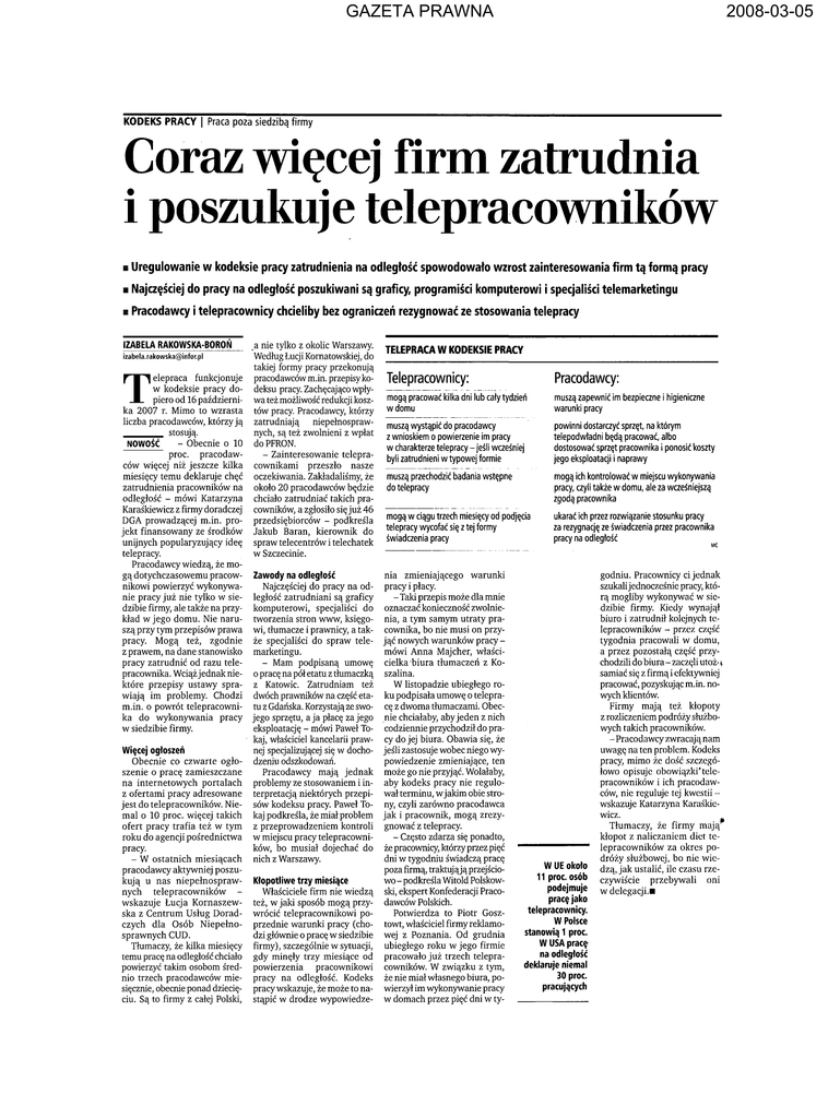 GAZETA PRAWNA 2008-03-05 KODEKS PRACY | Praca poza siedzibą firmy Coraz więcej firm zatrudnia i poszukuje telepracowników • Uregulowanie w kodeksie pracy zatrudnienia na odległość spowodowało wzrost zainteresowania firm tą formą pracy • Najczęściej do pracy na odległość poszukiwani są graficy, programiści komputerowi i specjaliści telemarketingu m Pracodawcy i telepracownicy chcieliby bez ograniczeń rezygnować ze stosowania telepracy IZABELA RAKOWSKA-BORON [email protected] elepraca funkcjonuje w kodeksie pracy do piero od 16 październi ka 2007 r. Mimo to wzrasta liczba pracodawców, którzy ją ^ ^ ^ ^ _ stosują. NOWOŚĆ - Obecnie o 10 proc. pracodaw ców więcej niż jeszcze kilka miesięcy temu deklaruje chęć zatrudnienia pracowników na odległość - mówi Katarzyna Karaśkiewicz z firmy doradczej DGA prowadzącej m.in. pro jekt finansowany ze środków unijnych popularyzujący ideę telepracy. T Pracodawcy wiedzą, że mo gą dotychczasowemu pracow nikowi powierzyć wykonywa nie pracy już nie tylko w sie dzibie firmy, ale także na przy kład w jego domu. Nie naru szą przy tym przepisów prawa pracy. Mogą też, zgodnie z prawem, na dane stanowisko pracy zatrudnić od razu telepracownika. Wciąż jednak nie które przepisy ustawy spra wiają im problemy. Chodzi m.in. o powrót telepracownika do wykonywania pracy w siedzibie firmy. Więcej ogłoszeń Obecnie co czwarte ogło szenie o pracę zamieszczane na internetowych portalach z ofertami pracy adresowane jest do telepracowników. Nie mal o 10 proc. więcej takich ofert pracy trafia też w tym roku do agencji pośrednictwa pracy. - W ostatnich miesiącach pracodawcy aktywniej poszu kują u nas niepełnospraw nych telepracowników wskazuje Łucja Romaszew ska z Centrum Usług Dorad czych dla Osób Niepełno sprawnych CUD. Tłumaczy, że kilka miesięcy temu pracę na odległość chciało powierzyć takim osobom śred nio trzech pracodawców mie sięcznie, obecnie ponad dziecię ciu. Są to firmy z całej Polski, a nie tylko z okolic Warszawy. Według Łucji Kornatowskiej, do takiej formy pracy przekonują pracodawców m.in. przepisy ko deksu pracy. Zachęcająco wpły wa też możliwość redukcji kosz tów pracy. Pracodawcy, którzy zatrudniają niepełnospraw nych, są też zwolnieni z wpłat do PFRON. - Zainteresowanie telepracownikami przeszło nasze oczekiwania. Zakładaliśmy, że około 20 pracodawców będzie chciało zatrudniać takich pra cowników, a zgłosiło się już 46 przedsiębiorców - podkreśla Jakub Baran, kierownik do spraw telecentrów i telechatek w Szczecinie. Zawody na odległość Najczęściej do pracy na od ległość zatrudniani są graficy komputerowi, specjaliści do tworzenia stron www, księgo wi, tłumacze i prawnicy, a tak że specjaliści do spraw tele marketingu. - Mam podpisaną umowę o pracę na pół etatu z tłumaczką z Katowic. Zatrudniam też dwóch prawników na część eta tu z Gdańska. Korzystają ze swo jego sprzętu, a ja płacę za jego eksploatację - mówi Paweł To kaj, właściciel kancelarii praw nej specjalizującej się w docho dzeniu odszkodowań. Pracodawcy mają jednak problemy ze stosowaniem i in terpretacją niektórych przepi sów kodeksu pracy. Paweł To kaj podkreśla, że miał problem z przeprowadzeniem kontroli w miejscu pracy telepracowni ków, bo musiał dojechać do nich z Warszawy. Kłopotliwe trzy miesiące Właściciele firm nie wiedzą też, w jaki sposób mogą przy wrócić telepracownikowi po przednie warunki pracy (cho dzi głównie o pracę w siedzibie firmy), szczególnie w sytuacji, gdy minęły trzy miesiące od powierzenia pracownikowi pracy na odległość. Kodeks pracy wskazuje, że może to na stąpić w drodze wypowiedze- TELEPRACA W KODEKSIE PRACY Telepracownicy: Pracodawcy: mogą pracować kilka dni lub cały tydzień w domu muszą zapewnić im bezpieczne i higieniczne warunki pracy muszą wystąpić do pracodawcy z wnioskiem o powierzenie im pracy w charakterze telepracy - jeśli wcześniej byli zatrudnieni w typowej formie powinni dostarczyć sprzęt, na którym telepodwładni będą pracować, albo dostosować sprzęt pracownika i ponosić koszty jego eksploatacji i naprawy muszą przechodzić badania wstępne do telepracy mogą ich kontrolować w miejscu wykonywania pracy, czyli także w domu, ale za wcześniejszą zgodą pracownika mogą w ciągu trzech miesięcy od podjęcia telepracy wycofać się z tej formy świadczenia pracy ukarać ich przez rozwiązanie stosunku pracy za rezygnację ze świadczenia przez pracownika pracy na odległość nia zmieniającego warunki pracy i płacy. - Taki przepis może dla mnie oznaczać konieczność zwolnie nia, a tym samym utraty pra cownika, bo nie musi on przy jąć nowych warunków pracy mówi Anna Majcher, właści cielka biura tłumaczeń z Ko szalina. W listopadzie ubiegłego ro ku podpisała umowę o telepra cę z dwoma tłumaczami. Obec nie chciałaby, aby jeden z nich codziennie przychodził do pra cy do jej biura. Obawia się, że jeśli zastosuje wobec niego wy powiedzenie zmieniające, ten może go nie przyjąć. Wolałaby, aby kodeks pracy nie regulo wał terminu, w jakim obie stro ny, czyli zarówno pracodawca jak i pracownik, mogą zrezy gnować z telepracy. - Często zdarza się ponadto, że pracownicy, którzy przez pięć dni w tygodniu świadczą pracę poza firmą, traktująją przejścio wo - podkreśla Witold Polskowski, ekspert Konfederacji Praco dawców Polskich. Potwierdza to Piotr Gosztowt, właściciel firmy reklamo wej z Poznania. Od grudnia ubiegłego roku w jego firmie pracowało już trzech telepra cowników. W związku z tym, że nie miał własnego biura, po wierzył im wykonywanie pracy w domach przez pięć dni w ty- W UE około 11 proc. osób podejmuje pracę jako telepracownicy. W Polsce stanowią 1 proc. W USA pracę na odległość deklaruje niemal 30 proc. pracujących godniu. Pracownicy ci jednak szukali jednocześnie prac