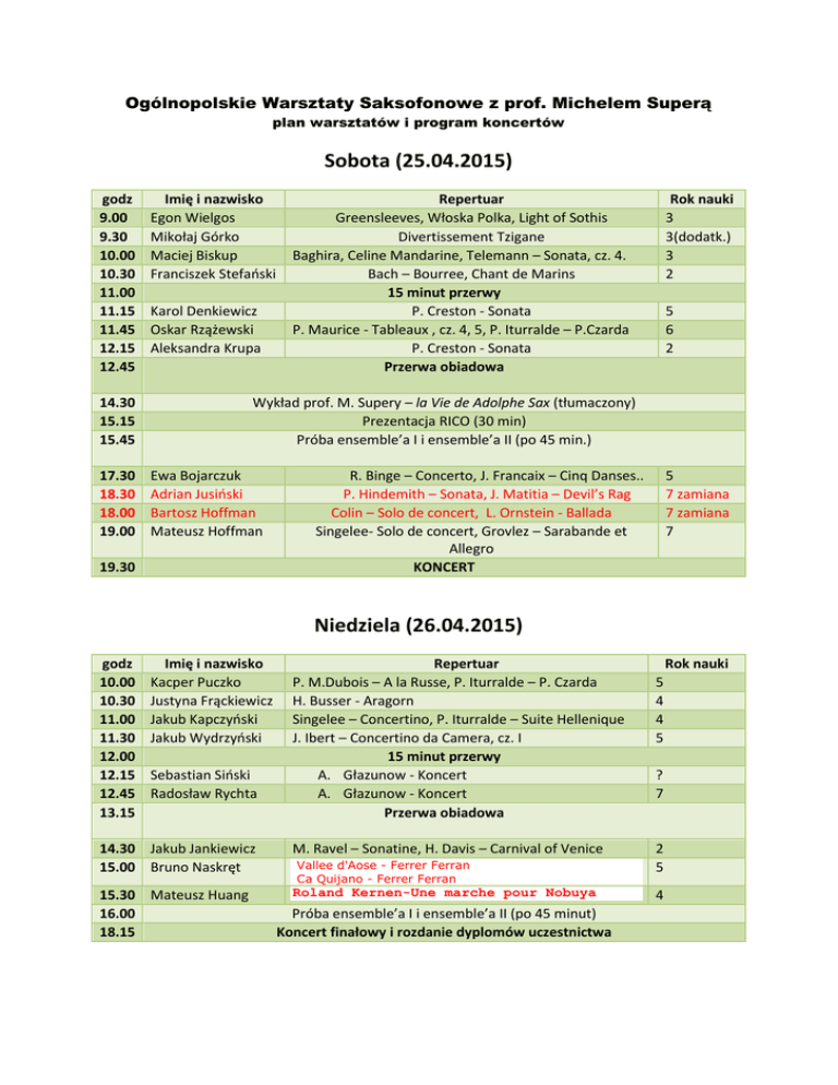 Ogólnopolskie Warsztaty Saksofonowe z prof. Michelem Superą plan warsztatów i program koncertów Sobota (25.04.2015) godz 9.00 9.30 10.00 10.30 11.00 11.15 11.45 12.15 12.45 Imię i nazwisko Egon Wielgos Mikołaj Górko Maciej Biskup Franciszek Stefański Karol Denkiewicz Oskar Rzążewski Aleksandra Krupa 14.30 15.15 15.45 17.30 18.30 18.00 19.00 Repertuar Greensleeves, Włoska Polka, Light of Sothis Divertissement Tzigane Baghira, Celine Mandarine, Telemann – Sonata, cz. 4. Bach – Bourree, Chant de Marins 15 minut przerwy P. Creston - Sonata P. Maurice - Tableaux , cz. 4, 5, P. Iturralde – P.Czarda P. Creston - Sonata Przerwa obiadowa Rok nauki 3 3(dodatk.) 3 2 5 6 2 Wykład prof. M. Supery – la Vie de Adolphe Sax (tłumaczony) Prezentacja RICO (30 min) Próba ensemble’a I i ensemble’a II (po 45 min.) Ewa Bojarczuk Adrian Jusiński Bartosz Hoffman Mateusz Hoffman 19.30 R. Binge – Concerto, J. Francaix – Cinq Danses.. P. Hindemith – Sonata, J. Matitia – Devil’s Rag Colin – Solo de concert, L. Ornstein - Ballada Singelee- Solo de concert, Grovlez – Sarabande et Allegro KONCERT 5 7 zamiana 7 zamiana 7 Niedziela (26.04.2015) godz 10.00 10.30 11.00 11.30 12.00 12.15 12.45 13.15 Imię i nazwisko Kacper Puczko Justyna Frąckiewicz Jakub Kapczyński Jakub Wydrzyński Sebastian Siński Radosław Rychta Repertuar P. M.Dubois – A la Russe, P. Iturralde – P. Czarda H. Busser - Aragorn Singelee – Concertino, P. Iturralde – Suite Hellenique J. Ibert – Concertino da Camera, cz. I 15 minut przerwy A. Głazunow - Koncert A. Głazunow - Koncert Przerwa obiadowa 14.30 Jakub Jankiewicz 15.00 Bruno Naskręt M. Ravel – Sonatine, H. Davis – Carnival of Venice 15.30 Mateusz Huang 16.00 18.15 Roland Kernen-Une marche pour Nobuya Vallee d'Aose - Ferrer Ferran Ca Quijano - Ferrer Ferran Próba ensemble’a I i ensemble’a II (po 45 minut) Koncert finałowy i rozdanie dyplomów uczestnictwa Rok nauki 5 4 4 5 ? 7 2 5 4 Koncert uczestników – informacje na stronie www (sobota 19.30) Koncert Finałowy (niedziela 18.15) 1. Tery Riley – In C Wszyscy chętni uczestnicy warsztatów (ensemble I) – wciąż można zgłaszać się do ensemble’a I 2. Johan van der Linden – Clockwise (ensemble II – materiały prześlę e-mailem) 3. Andre Wainegein - Rapsodie Michel Supera – saksofon, Marta Kluczyńska – dyrygent, Orkiestra ZPSM nr 4. Koordynator Alicja Wołyńczyk 502 55 88 88 [email protected] www.saxophone.art.pl/warsztaty.html