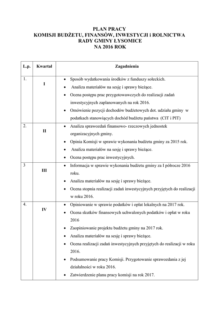 PLAN PRACY KOMISJI BUDŻETU, FINANSÓW, INWESTYCJI i ROLNICTWA RADY GMINY ŁYSOMICE NA 2016 ROK L.p. Kwartał Zagadnienia Sposób wydatkowania środków z funduszy sołeckich. 1. I Analiza materiałów na sesję i sprawy bieżące. Ocena postępu prac przygotowawczych do realizacji zadań inwestycyjnych zaplanowanych na rok 2016. Omówienie pozycji dochodów budżetowych dot. udziału gminy w podatkach stanowiących dochód budżetu państwa (CIT i PIT) Analiza sprawozdań finansowo- rzeczowych jednostek 2. II organizacyjnych gminy. Opinia Komisji w sprawie wykonania budżetu gminy za 2015 rok. Analiza materiałów na sesję i sprawy bieżące. Ocena postępu prac inwestycyjnych. Informacja w sprawie wykonania budżetu gminy za I półrocze 2016 3 III roku. Analiza materiałów na sesję i sprawy bieżące. Ocena stopnia realizacji zadań inwestycyjnych przyjętych do realizacji w roku 2016. Opiniowanie w sprawie podatków i opłat lokalnych na 2017 rok. 4. IV Ocena skutków finansowych uchwalonych podatków i opłat w roku 2016 Zaopiniowanie projektu budżetu gminy na 2017 rok. Analiza materiałów na sesję i sprawy bieżące. Ocena realizacji zadań inwestycyjnych przyjętych do realizacji w roku 2016. Podsumowanie pracy Komisji. Przygotowanie sprawozdania z jej działalności w roku 2016. Zatwierdzenie planu pracy komisji na rok 2017.