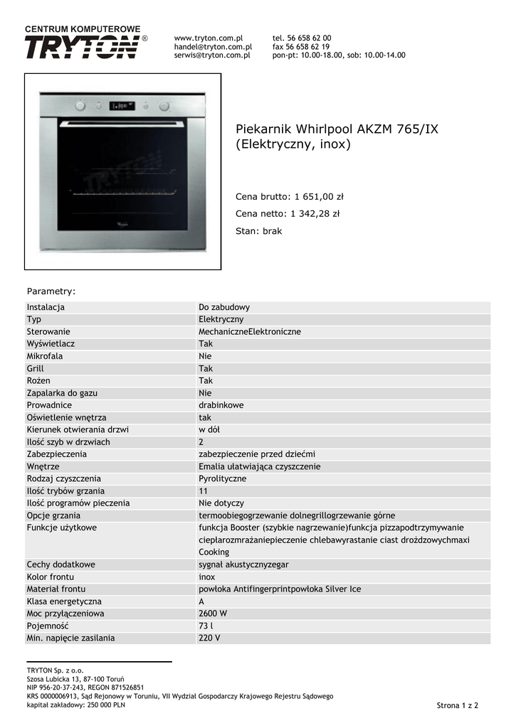 www.tryton.com.pl [email protected] [email protected] tel. 56 658 62 00 fax 56 658 62 19 pon-pt: 10.00-18.00, sob: 10.00-14.00 Piekarnik Whirlpool AKZM 765/IX (Elektryczny, inox) Cena brutto: 1 651,00 zł Cena netto: 1 342,28 zł Stan: brak Parametry: Instalacja Typ Sterowanie Wyświetlacz Mikrofala Grill Rożen Zapalarka do gazu Prowadnice Oświetlenie wnętrza Kierunek otwierania drzwi Ilość szyb w drzwiach Zabezpieczenia Wnętrze Rodzaj czyszczenia Ilość trybów grzania Ilość programów pieczenia Opcje grzania Funkcje użytkowe Cechy dodatkowe Kolor frontu Materiał frontu Klasa energetyczna Moc przyłączeniowa Pojemność Min. napięcie zasilania Do zabudowy Elektryczny MechaniczneElektroniczne Tak Nie Tak Tak Nie drabinkowe tak w dół 2 zabezpieczenie przed dziećmi Emalia ułatwiająca czyszczenie Pyrolityczne 11 Nie dotyczy termoobiegogrzewanie dolnegrillogrzewanie górne funkcja Booster (szybkie nagrzewanie)funkcja pizzapodtrzymywanie ciepłarozmrażaniepieczenie chlebawyrastanie ciast drożdzowychmaxi Cooking sygnał akustycznyzegar inox powłoka Antifingerprintpowłoka Silver Ice A 2600 W 73 l 220 V TRYTON Sp. z o.o. Szosa Lubicka 13, 87-100 Toruń NIP 956-20-37-243, REGON 871526851 KRS 0000006913, Sąd Rejonowy w Toruniu, VII Wydział Gospodarczy Krajowego Rejestru Sądowego kapitał zakładowy: 250 000 PLN Strona 1 z 2 www.tryton.com.pl [email protected] [email protected] Maks. napięcie zasilania Wymiary urządzenia (Szer/Wys/Gł) Wymiary opakowania (Szer/Wys/Gł) Waga urządzenia Waga z opakowaniem Długość kabla zasilającego Typ wtyczki Wyposażenie Strona www produktu tel. 56 658 62 00 fax 56 658 62 19 pon-pt: 10.00-18.00, sob: 10.00-14.00 230 V 595x595x564 mm 630x690x650 mm 40,5 kg 42,5 kg Nie dotyczy Nie dotyczy blacharuszt/drabinka suszarniczataca do ociekania http://www.whirlpool.pl/piekarnik-do-zabudowy%2cchowane-pokr%C4%9 9t%C5%82a%2cpiekarnik-linia-ambient-%5BAKZM-765_IX%5D-600437/85257 6501000/#prettyPhoto Mimo dołożenia wszelkich starań nie gwarantujemy, że publikowane dane techniczne nie zawierają uchybień lub błędów. W przypadku jakichkolwiek wątpliwości prosimy przed podjęciem decyzji o kontakt z handlowcem. Przedstawiona oferta cenowa ma charakter informacyjny, nie stanowi oferty handlowej w rozumieniu Art.66 par.1 Kodeksu Cywilnego oraz innych właściwych przepisów prawnych. TRYTON Sp. z o.o. Szosa Lubicka 13, 87-100 Toruń NIP 956-20-37-243, REGON 871526851 KRS 0000006913, Sąd Rejonowy w Toruniu, VII Wydział Gospodarczy Krajowego Rejestru Sądowego kapitał zakładowy: 250 000 PLN Strona 2 z 2