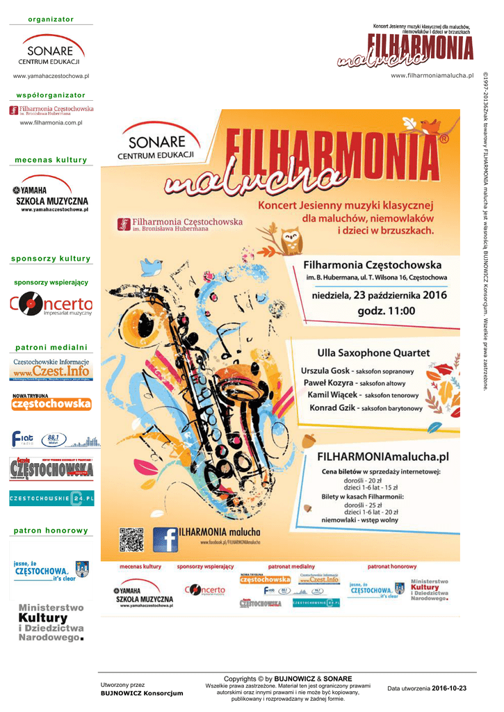 organizator współorganizator www.filharmonia.com.pl mecenas kultury sponsorz y kultury sponsorzy wspierający patroni medialni patron honorow y Utworzony przez BUJNOWICZ Konsorcjum Copyrights © by BUJNOWICZ & SONARE Wszelkie prawa zastrzeżone. Materiał ten jest ograniczony prawami autorskimi oraz innymi prawami i nie może być kopiowany, publikowany i rozprowadzany w żadnej formie. Data utworzenia 2016-10-23 ©1997-20136Znak towarowy FILHARMONIA malucha jest własnością BUJNOWICZ Konsorcjum. Wszelkie prawa zastrzeżone. www.filharmoniamalucha.pl www.yamahaczestochowa.pl organizator www.filharmoniamalucha.pl Repertuar Koncertu Jesiennego, 23.10.2016r. Ulla Saxophone Quartet w składzie: współorganizator www.filharmonia.com.pl mecenas kultury Urszula GOSK – saksofon sopranowy Paweł KOZYRA – saksofon altowy Kamil WIĄCEK – saksofon tenorowy Konrad GZIK – saksofon barytonowy wykona następujący program sponsorz y kultury 1. Jan Sebastian Bach, Koncert Brandenburski nr 6 cz.III 2:27 2. Jan Sebastian Bach, Aria Georg Gershwin, I’ve Got Rhytm- wejście na scenę sponsorzy wspierający patroni medialni 2:30 3. Leo Delibes, Lakme - Flower’s duet 2:45 4. Jaques Ibert, Histories - A Giddy Girl 1:21 5. Bruce A. Evans, The Diamond State 2:40 6. Leonard Bernstein, West Side Story - America 3:15 7. Astor Piazzolla, Libertango 3:00 8. Pedro Iturralde , Suita Hellenistyczna - Kalamatianos 2:30 Georg Gershwin, I’ve Got Rhytm- zejście ze sceny 10. Henry Mancini, Pink Panther 2:30 11. Danny Elfman, Mission Impossibile patron honorow y Uwaga: 1:00 kolejność utworów i czas trwania mogą ulec zmianie Prowadzenie: Ewa PALUCH – animator Bartosz SZARANIEC – konferansjer Strona 2 z 2 Autor: BUJNOWICZ & SONARE dn. 2016-10-23 ©1997-2016Znak towarowy FILHARMONIA malucha jest własnością BUJNOWICZ Konsorcjum. Wszelkie prawa zastrzeżone. www.yamahaczestochowa.pl