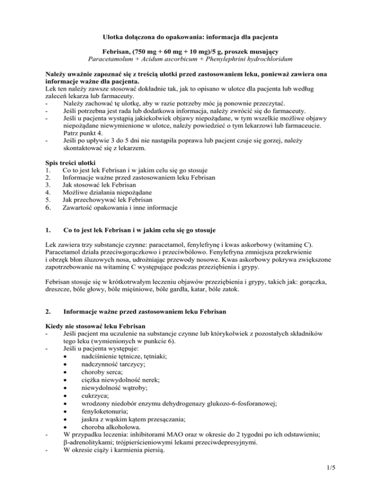 Ulotka dołączona do opakowania: informacja dla pacjenta Febrisan, (750 mg + 60 mg + 10 mg)/5 g, proszek musujący Paracetamolum + Acidum ascorbicum + Phenylephrini hydrochloridum Należy uważnie zapoznać się z treścią ulotki przed zastosowaniem leku, ponieważ zawiera ona informacje ważne dla pacjenta. Lek ten należy zawsze stosować dokładnie tak, jak to opisano w ulotce dla pacjenta lub według zaleceń lekarza lub farmaceuty. Należy zachować tę ulotkę, aby w razie potrzeby móc ją ponownie przeczytać. Jeśli potrzebna jest rada lub dodatkowa informacja, należy zwrócić się do farmaceuty. Jeśli u pacjenta wystąpią jakiekolwiek objawy niepożądane, w tym wszelkie możliwe objawy niepożądane niewymienione w ulotce, należy powiedzieć o tym lekarzowi lub farmaceucie. Patrz punkt 4. Jeśli po upływie 3 do 5 dni nie nastąpiła poprawa lub pacjent czuje się gorzej, należy skontaktować się z lekarzem. Spis treści ulotki 1. Co to jest lek Febrisan i w jakim celu się go stosuje 2. Informacje ważne przed zastosowaniem leku Febrisan 3. Jak stosować lek Febrisan 4. Możliwe działania niepożądane 5. Jak przechowywać lek Febrisan 6. Zawartość opakowania i inne informacje 1. Co to jest lek Febrisan i w jakim celu się go stosuje Lek zawiera trzy substancje czynne: paracetamol, fenylefrynę i kwas askorbowy (witaminę C). Paracetamol działa przeciwgorączkowo i przeciwbólowo. Fenylefryna zmniejsza przekrwienie i obrzęk błon śluzowych nosa, udrożniając przewody nosowe. Kwas askorbowy pokrywa zwiększone zapotrzebowanie na witaminę C występujące podczas przeziębienia i grypy. Febrisan stosuje się w krótkotrwałym leczeniu objawów przeziębienia i grypy, takich jak: gorączka, dreszcze, bóle głowy, bóle mięśniowe, bóle gardła, katar, bóle zatok. 2. Informacje ważne przed zastosowaniem leku Febrisan Kiedy nie stosować leku Febrisan Jeśli pacjent ma uczulenie na substancje czynne lub którykolwiek z pozostałych składników tego leku (wymienionych w punkcie 6). Jeśli u pacjenta występuje: • nadciśnienie tętnicze, tętniaki; • nadczynność tarczycy; • choroby serca; • ciężka niewydolność nerek; • niewydolność wątroby; • cukrzyca; • wrodzony niedobór enzymu dehydrogenazy glukozo-6-fosforanowej; • fenyloketonuria; • jaskra z wąskim kątem przesączania; • choroba alkoholowa. W przypadku leczenia: inhibitorami MAO oraz w okresie do 2 tygodni po ich odstawieniu; β-adrenolitykami; trójpierścieniowymi lekami przeciwdepresyjnymi. W okresie ciąży i karmienia piersią. 1/5 - U dzieci w wieku poniżej 12 lat. Ostrzeżenia i środki ostrożności Przed rozpoczęciem stosowania leku Febrisan należy omówić to z lekarzem lub farmaceutą. Ze względu na ryzyko przedawkowania nie należy stosować jednocześnie z innymi lekami zawierającymi paracetamol. Należy zachować ostrożność u osób stosujących leki przeciwzakrzepowe. Stosowanie leku u osób z niewydolnością wątroby, nadużywających alkohol oraz głodzonych stwarza ryzyko uszkodzenia wątroby. Należy zachować szczególną ostrożność u pacjentów z niewydolnością nerek, czynną chorobą wrzodową, przerostem gruczołu krokowego, podwyższonym ciśnieniem wewnątrzgałkowym, guzem chromochłonnym, a także u pacjentów uczulonych na kwas acetylosalicylowy oraz leczonych lekami uspokajającymi i innymi lekami sympatykomimetycznymi (tj. zmniejszającymi przekrwienie błon śluzowych, lekami hamującymi apetyt, lekami psychostymulującymi podobnymi do amfetaminy). W trakcie leczenia nie należy spożywać alkoholu. Należy skonsultować się z lekarzem nawet, jeśli powyższe ostrzeżenia dotyczą sytuacji występujących w przeszłości. Dzieci i młodzież Nie należy stosować leku u dzieci w wieku poniżej 12 lat. Pacjenci z zaburzeniami czynności nerek i (lub) wątroby Należy zachować szczególną ostrożność u pacjentów ze schorzeniami nerek i (lub) wątroby. Lek jest przeciwwskazany u pacjentów z niewydolnością wątroby i (lub) ciężką niewydolnością nerek. Pacjenci w podeszłym wieku Należy zachować ostrożność stosując lek Febrisan. Lek Febrisan a inne leki Należy powiedzieć lekarzowi lub farmaceucie o wszystkich lekach przyjmowanych przez pacjenta obecnie lub ostatnio, a także o lekach, które pacjent planuje przyjmować. Oddziaływanie leku Febrisan z innymi lekami wynika z oddziaływania substancji czynnych wchodzących w skład leku. Paracetamol Nasila działanie doustnych leków przeciwzakrzepowych z grupy kumaryny. Podawanie z niesteroidowymi lekami przeciwzapalnymi (np. ibuprofen) nasila ryzyko wystąpienia zaburzeń czynności nerek. Salicylamid wydłuża czas wydalania paracetamolu. Stosowanie z lekami przyspieszającymi metabolizm paracetamolu w wątrobie (ryfampicyna, niektóre leki nasenne i przeciwpadaczkowe) zwiększa ryzyko uszkodzenia wątroby. Podawany z inhibitorami MAO oraz w okresie do 2 tygodni po ich odstawieniu może wywołać stany pobudzenia i wysoką gorączkę. Równoczesne stosowanie paracetamolu z zydowudyną (AZT) może nasilać toksyczne działanie zydowudyny na szpik. Stosowany z lamotryginą lub chloramfenikolem zmniejsza ich stężenie w surowicy. Metoklopramid przyspiesza, a propantelina opóźnia wchłanianie paracetamolu z przewodu pokarmowego. Cymetydyna, izoniazyd, probenecyd, ranitydyna, propranolol, salicylamid – wydłużają okres półtrwania paracetamolu w surowicy. Spożywanie alkoholu podczas leczenia paracetamolem prowadzi do powstania toksycznego metabolitu wywołującego martwicę komórek wątrobowych, co w następstwie może prowadzić do niewydolności wątroby. Ze względu na ryzyko przedawkowania, leku nie należy stosować równocześnie z innymi lekami zawierającymi paracetamol. 2/5 Fenylefryna Inhibitory MAO nasilają działanie fenylefryny. Indometacyna, beta-adrenolityki (np. propranolol) lub metyldopa stosowane jednocześnie z fenylefryną mogą spowodowa