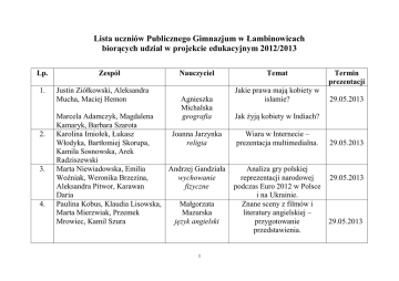 Lista uczniów Publicznego Gimnazjum w Łambinowicach biorących udział w projekcie edukacyjnym 2012/2013 Lp. 1. 2. 3. 4. Zespół Justin Ziółkowski, Aleksandra Mucha, Maciej Hemon Nauczyciel Agnieszka Michalska geografia Marcela Adamczyk, Magdalena Kamaryk, Barbara Szarota Karolina Imiołek, Łukasz Joanna Jarzynka Włodyka, Bartłomiej Skorupa, religia Kamila Sosnowska, Arek Radziszewski Marta Niewiadowska, Emilia Andrzej Gandziała Woźniak, Weronika Brzezina, wychowanie Aleksandra Pitwor, Karawan fizyczne Daria Paulina Kobus, Klaudia Lisowska, Małgorzata Marta Mierzwiak, Przemek Mazurska Mrowiec, Kamil Szura język angielski 1 Temat Jakie prawa mają kobiety w islamie? Termin prezentacji 29.05.2013 Jak żyją kobiety w Indiach? Wiara w Internecie – prezentacja multimedialna. Analiza gry polskiej reprezentacji narodowej podczas Euro 2012 w Polsce i na Ukrainie. Znane sceny z filmów i literatury angielskiej – przygotowanie przedstawienia. 29.05.2013 29.05.2013 29.05.2013 5. Brayan Leśniak, Bartek Banera, Robert Żarłak, Marcel Mondzelewski 6. Maciej Janocha, Dawid Ziemnik, Jakub Białas, Paweł Radlak, Paweł Ćwikliński Anna Wałtosz, Natalia Gruca, Roksana Kwiczala, Dominika Skiba Natalia Socha, Paulina Lipka, Nikola Nowakowska, Iza Kraska, Roksana Luda Gracjan Walkowicz, Arek Brzezina, Tomasz Dobek, Patryk Misiuda, Joasia Strugała Agnieszka Synowiec historia Gabriela Deszczka język niemiecki Magda Lipka-Auguścik, Kamila Mucha, Marcin Gąsiorek, Dawid Kamiński, Maciej Mazurek Błażej Środa, Szymon Browarski, Patryk Szkwarkowski Małgorzata Połomska- Skut język niemiecki Zofia Bomba wychowanie fizyczne 7. 8. 9. 10. 11. Franciszek Kudryński technika Edyta Golec sztuka Waldemar Kołaczyk muzyka 2 Zaprojektuj swój samochód marzeń- kształt nadwozia, 29.05.2013 przeznaczenie, wyposażenie, rodzaj napędu. Wpływ jednostki na dzieje świata 29.05.2013 Wykonawcy niemieckiej muzyki pop. Ich twórczość i osiągnięcia. 29.05.2013 Różne rodzaje fotografii. 29.05.2013 Kompresja utworu audio na wav, mp3, mp4 w różnych 29.05.2013 programach muzycznych oraz obniżanie i podwyższanie tonacji w utworze audio. Polonische Kuche euf detsch (polska kuchnia po 29.05.2013 niemiecku). Jaki związek ma fizyka ze sportem? 29.05.2013 12. Adrian Słodkowski, Paweł Bidziński, Patryk Marszałkowski 14. Michał Skiba, Sebastian Kasprzycki, Dominik Markiewicz, Patryk Ernst Sylwia Kurpan, Ewa Duda, Sebastian Kupczak, Natalia Jabłońska Szymon Nanowski, Emil Radziszewski, Mariusz Rypuła, Patryk Brodziński 15. 16. Robert Hałub informatyka Tadeusz Walczuk wychowanie fizyczne Irena Raróg chemia Iwona Wojdyło matematyka Skarby naszej gminy (strona internetowa www lub 29.05.2013 prezentacja). Historia Futbolu Gaelickiego – prezentacja multimedialna. 29.05.2013 Chemia w rondlu, czyli nasza żywność. 29.05.2013 Słynni matematycyprezentacja multimedialna Koordynator Mariusz Madej 3 29.05.2013