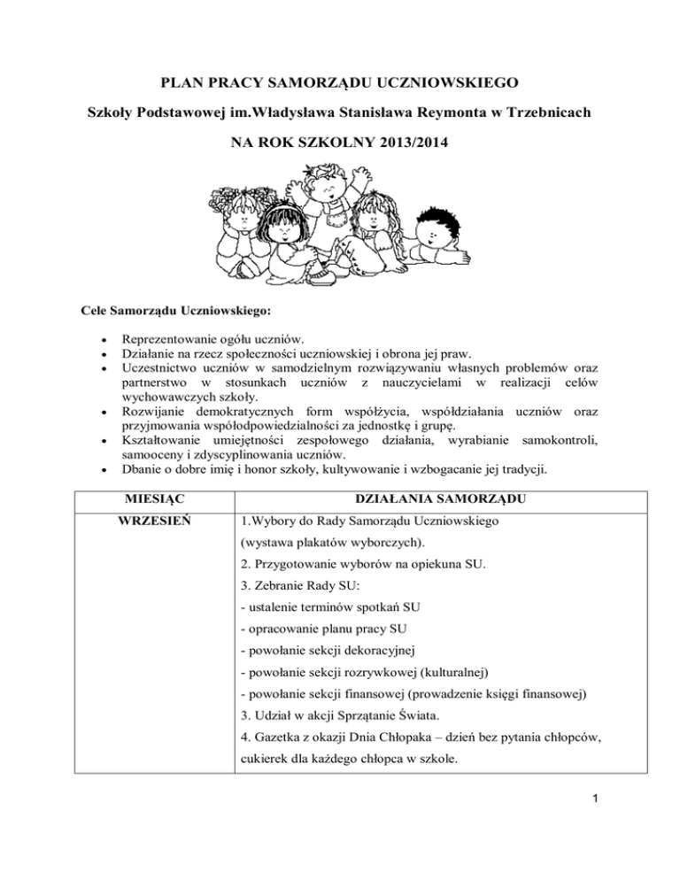 PLAN PRACY SAMORZĄDU UCZNIOWSKIEGO Szkoły Podstawowej im.Władysława Stanisława Reymonta w Trzebnicach NA ROK SZKOLNY 2013/2014 Cele Samorządu Uczniowskiego: Reprezentowanie ogółu uczniów. Działanie na rzecz społeczności uczniowskiej i obrona jej praw. Uczestnictwo uczniów w samodzielnym rozwiązywaniu własnych problemów oraz partnerstwo w stosunkach uczniów z nauczycielami w realizacji celów wychowawczych szkoły. Rozwijanie demokratycznych form współżycia, współdziałania uczniów oraz przyjmowania współodpowiedzialności za jednostkę i grupę. Kształtowanie umiejętności zespołowego działania, wyrabianie samokontroli, samooceny i zdyscyplinowania uczniów. Dbanie o dobre imię i honor szkoły, kultywowanie i wzbogacanie jej tradycji. MIESIĄC WRZESIEŃ DZIAŁANIA SAMORZĄDU 1.Wybory do Rady Samorządu Uczniowskiego (wystawa plakatów wyborczych). 2. Przygotowanie wyborów na opiekuna SU. 3. Zebranie Rady SU: - ustalenie terminów spotkań SU - opracowanie planu pracy SU - powołanie sekcji dekoracyjnej - powołanie sekcji rozrywkowej (kulturalnej) - powołanie sekcji finansowej (prowadzenie księgi finansowej) 3. Udział w akcji Sprzątanie Świata. 4. Gazetka z okazji Dnia Chłopaka – dzień bez pytania chłopców, cukierek dla każdego chłopca w szkole. 1 5. Zorganizowanie Poczty dla chłopaka. Apel i wybory Superchłopaka. PAŹDZIERNIK 1. Gazetka okolicznościowa z okazji Święta Edukacji Narodowej. 2. Apel z okazji Święta Edukacji Narodowej – wybory Supernauczyciela (wręczenie szkarłatnej róży) - złożenie życzeń nauczycielom, pracownikom szkoły. Wykonanie kartki z życzeniami przy wejściu do szkoły. 3. Dyskoteka Na dobry początek (połączona z obchodami Dnia Chłopaka, dyskoteka na Halloween) – organizacja konkursów podczas dyskoteki. Prowadzenie sklepiku szkolnego. 4. Dzień Orzecha 22 X – uczniowie, którzy przyniosą orzecha jako symbol jesieni zwolnieni są z pytania i kartkówek w tym dniu. LISTOPAD 1. Gazetka okolicznościowa z okazji Narodowego Święta Niepodległości lub Andrzejek. 2. Dyskoteka andrzejkowa, zabawy andrzejkowe w klasach. 3. Światowy Dzień Pluszowego Misia – 25 XI – wszyscy uczniowie przynoszą do szkoły misie. GRUDZIEŃ 1. Gazetka okolicznościowa Mikołajki i Święta Bożego Narodzenia 2. Mikołajki – wizyta św.Mikołaja w klasach. Konkurs na najpiękniejsze przebranie św. Mikołaja 3. Dzień dobroczynności – przystrojenie choinki szkolnej. 4. Udział w akcji charytatywnej – „Góra Grosza”. 5. Konkurs Najpiękniejsza klasowa choinka – najbardziej świątecznie udekorowana klasa. STYCZEŃ 1. Apel podsumowujący pracę SU w pierwszym półroczu. 2. Bal karnawałowy – wybory Miss i Mistera Szkoły (gazetka). 3. Udział w akcji Wielkiej Orkiestry Świątecznej Pomocy. 4. Dzień Babci i Dziadka gazetka okolicznościowa. LUTY 1. Gazetka okolicznościowa Walentynki. 2. Poczta Walentynkowa (kiermasz Walentynkowy- przygotowanie kart walentynkowych, drobnych upominków i ich sprzedaż, ewentualnie róż z dedykacją 2 muzyczną) ubieramy się na czerwono. 3. Konkurs na najpiękniejsze serce walentynkowe. 4.Tłusty czwartek – stragan z kalorycznymi pysznościami (sprzedaż pączków) Powiedział Bartek, że dziś tłusty czwartek, a Bartkowa uwierzyła, dobrych pączków nasmażyła – staropolskie przysłowie MARZEC 1. Gazetka okolicznościowa Dzień Kobiet 2. Wybory najsympatyczniejszej uczennicy i najsympatyczniejszego ucznia w szkole. 3. Apel z okazji Dnia Kobiet – złożenie życzeń paniom – dzień bez pytania dziewczyn, cukierek dla każdej kobiety w szkole (chłopcy śpiewają piosenkę dziewczynom w klasach). 4. Udział w obchodach Dnia Wiosny. KWIECIEŃ 1. Apel z okazji Dnia Ziemi – pomoc w przygotowaniu apelu – ubieramy się na zielono. 2. Dzień bez chipsa – akcja promująca zdrowy tryb życia. 3. Dyskoteka. 4. Wiosenna dekoracja sal – konkurs. 5. Gazetka okolicznościowa – Święta Wielkanocne. MAJ 1. Dzień Patrona szkoły – gazetka okolicznościowa. 2. Święto Konstytucji 3 Maja – gazetka, apel. 22. Uroczystość z okazji Dnia Matki. 1. Obchody Dnia Dziecka. 2. Apel podsumowujący szkolny konkurs SUPERKLASA CZERWIEC 3. Gazetka okolicznościowa - Wakacje. 4. Kiermasz podręczników. 5. Apel podsumowujący roczną pracę SU. Cały rok szkolny: Zbiórka nakrętek i zużytych baterii, kontynuowanie akcji szczęśliwy numer. Wywieszanie aktualnych informacji o pracy SU oraz przygotowywanie gazetek związanych z obowiązującą w danym czasie tematyką. 3 Projekt planu w czasie roku szkolnego, w miarę potrzeb może zostać zmodyfikowany. Zarząd SU chętnie podejmie nowe działania wynikające z potrzeby chwili. 4
