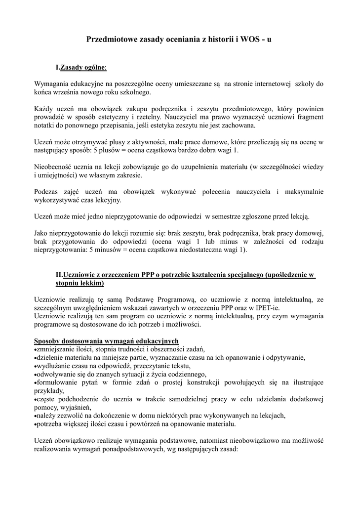 Przedmiotowe zasady oceniania z historii i WOS - u I.Zasady ogólne: Wymagania edukacyjne na poszczególne oceny umieszczane są na stronie internetowej szkoły do końca września nowego roku szkolnego. Każdy uczeń ma obowiązek zakupu podręcznika i zeszytu przedmiotowego, który powinien prowadzić w sposób estetyczny i rzetelny. Nauczyciel ma prawo wyznaczyć uczniowi fragment notatki do ponownego przepisania, jeśli estetyka zeszytu nie jest zachowana. Uczeń może otrzymywać plusy z aktywności, małe prace domowe, które przeliczają się na ocenę w następujący sposób: 5 plusów = ocena cząstkowa bardzo dobra wagi 1. Nieobecność ucznia na lekcji zobowiązuje go do uzupełnienia materiału (w szczególności wiedzy i umiejętności) we własnym zakresie. Podczas zajęć uczeń ma obowiązek wykonywać polecenia nauczyciela i maksymalnie wykorzystywać czas lekcyjny. Uczeń może mieć jedno nieprzygotowanie do odpowiedzi w semestrze zgłoszone przed lekcją. Jako nieprzygotowanie do lekcji rozumie się: brak zeszytu, brak podręcznika, brak pracy domowej, brak przygotowania do odpowiedzi (ocena wagi 1 lub minus w zależności od rodzaju nieprzygotowania: 5 minusów = ocena cząstkowa niedostateczna wagi 1). II.Uczniowie z orzeczeniem PPP o potrzebie kształcenia specjalnego (upośledzenie w stopniu lekkim) Uczniowie realizują tę samą Podstawę Programową, co uczniowie z normą intelektualną, ze szczególnym uwzględnieniem wskazań zawartych w orzeczeniu PPP oraz w IPET-ie. Uczniowie realizują ten sam program co uczniowie z normą intelektualną, przy czym wymagania programowe są dostosowane do ich potrzeb i możliwości. Sposoby dostosowania wymagań edukacyjnych zmniejszanie ilości, stopnia trudności i obszerności zadań, dzielenie materiału na mniejsze partie, wyznaczanie czasu na ich opanowanie i odpytywanie, wydłużanie czasu na odpowiedź, przeczytanie tekstu, odwoływanie się do znanych sytuacji z życia codziennego, formułowanie pytań w formie zdań o prostej konstrukcji powołujących się na ilustrujące przykłady, częste podchodzenie do ucznia w trakcie samodzielnej pracy w celu udzielania dodatkowej pomocy, wyjaśnień, należy zezwolić na dokończenie w domu niektórych prac wykonywanych na lekcjach, potrzeba większej ilości czasu i powtórzeń na opanowanie materiału. Uczeń obowiązkowo realizuje wymagania podstawowe, natomiast nieobowiązkowo ma możliwość realizowania wymagań ponadpodstawowych, wg następujących zasad: Podstawowe Ponadpodstawowe Rozwiązuje zadania, pracując równolegle Rozwiązuje zadania tylko w sytuacji, gdy z uczniami z normą intelektualną. nauczyciel uzna, że wymagania podstawowe z danego zakresu zostały opanowane. Czas pracy może być wydłużony. Rozwiązuje zadania z kart pracy, pracując indywidualnie. Sprawdziany i kartkówki różnicowane w porównaniu do ucznia z normą intelektualną pod względem trudności i sposobu oceniania. Niektóre prace klasowe uczeń pisze takie same jak reszta uczniów, tylko ma punktowane wyżej o 30%. Uczeń oceniany jest wg następujących kryteriów: Ocenę celującą otrzymuje uczeń, który opanował wiedzę i umiejętności wykraczające poza program. Ocena celująca jako ocena klasyfikacyjna jest wystawiana tylko w wyjątkowych przypadkach. Sytuacja taka powinna oznaczać konieczność powtórnego przebadania ucznia w Poradni Psychologiczno – Pedagogicznej i zmianę sposobu nauczania. Ocenę bardzo dobrą otrzymuje uczeń, który opanował wiedzę i umiejętności wykraczające poza poziom podstawowy. Ocenę dobrą otrzymuje uczeń, który opanował wiedzę i umiejętności w zakresie wymagań podstawowych. Ocenę dostateczną otrzymuje uczeń, który opanował wiedzę i umiejętności w zakresie wymagań koniecznych. Ocenę dopuszczającą otrzymuje uczeń, który opanował wiedzę i umiejętności w zakresie wymagań koniecznych, umożliwiających mu kontynuowanie nauki w następnym semestrze. Ocenę niedostateczną otrzymuje uczeń, którego braki w wiedzy i umiejętnościach uniemożliwiają mu kontynuowanie nauki w kolejnym semestrze . I.Uczniowie, którzy w opinii PPP mają wskazanie obniżenia wymagań Uczniowie realizują Podstawę Programową ze szczególnym uwzględnieniem wskazań określonych w opinii PPP . Uczniowie realizują ten sam program co uczniowie z normą intelektualną. Sposoby dostosowania wymagań edukacyjnych: Uczeń obowiązkowo realizuje wymagania podstawowe, natomiast nieobowiązkowo ma możliwość realizowania wymagań ponadpodstawowych. Sprawdziany i kartkówki są różnicowane w porównaniu do ucznia z normą intelektualną pod względem trudności i sposobu oceniania. Niektóre prace klasowe uczeń pisze takie same jak reszta uczniów, tylko ma punktowane wyżej o 30%. II.Uczniowie uzdolnieni Uczniowie mają możliwość uzyskiwania na bieżąco ocen celujących wagi 5, 3 i 1, wykazując opanowanie wymagań edukacyjnych na ocenę celującą, zgodnie z dokumentem "Wymagania edukacyjne z historii i WOS-u" na dany rok szkolny. Dodatkowo uczeń może uzyskać ocenę celującą za sukces w konkursie (dokładne wytyczne znajdują się w tabeli "Formy aktywności ucznia" (załącznik nr 1). Każda praca klasowa skonstruowana jest tak jak dla ogółu klasy. Jeżeli uczeń rozwiąże wszystkie zadania, może otrzymać zadanie na ocenę celującą, które sprawdza opanowanie wymagań wykraczających poza program. Przy pozostałych formach oceny nauczyciel umożliwia uzyskanie oceny celującej w miarę potrzeb i możliwości, jednak powinno to mieć miejsce jak najczęściej. Załącznik nr 3 Formy aktywności ucznia Formy aktywności Praca w grupach Zadanie domowe Aktywność na lekcji, praca na lekcji, udział w dyskusji Czynny udział w apelu Udział w konkursie Zeszyt Aktywność pozalekcyjna Kartkówka / sprawdzian Odpowiedź ustna Prezentacja, referat, projekt Udział w konkursie (dopuszczeni mogą być tylko ci uczniowie, któr
