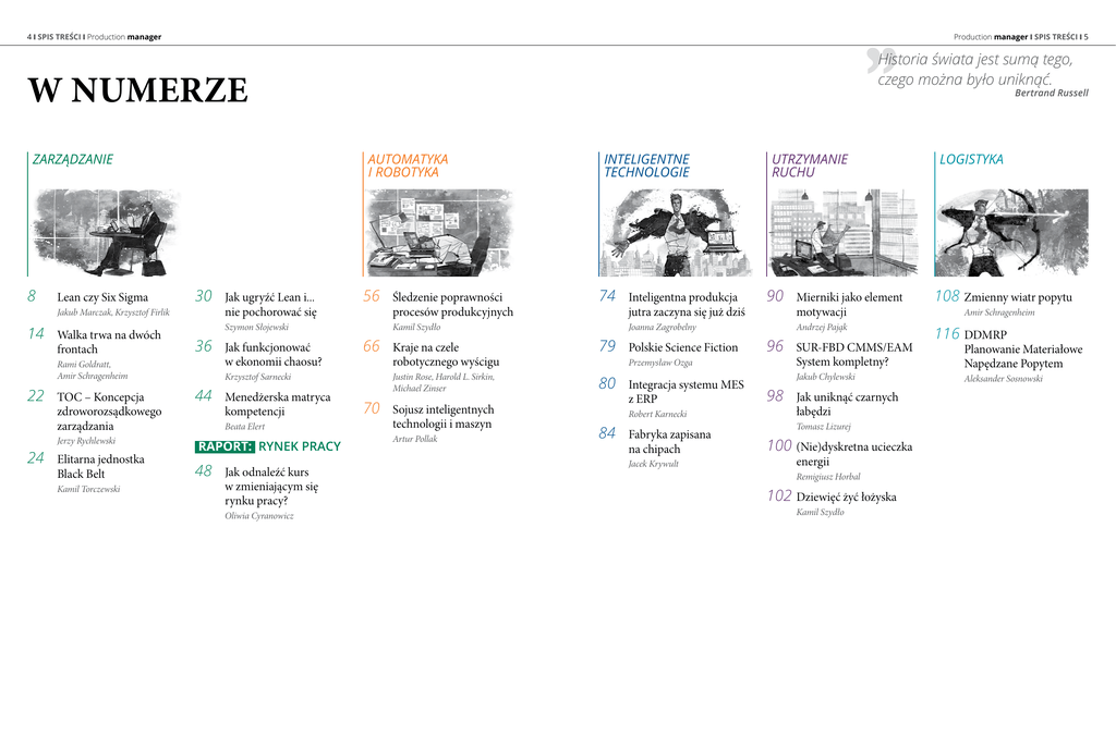 4 ❙ SPIS TREŚCI ❙ Production manager Production manager ❙ SPIS TREŚCI ❙ 5 Historia świata jest sumą tego, czego można było uniknąć. W NUMERZE Bertrand Russell ZARZĄDZANIE 8 Lean czy Six Sigma 30 Jak ugryźć Lean i... nie pochorować się Jakub Marczak, Krzysztof Firlik 14 Walka trwa na dwóch frontach Szymon Słojewski 36 Jak funkcjonować w ekonomii chaosu? Rami Goldratt, Amir Schragenheim 22 TOC – Koncepcja 44 Menedżerska matryca zdroworozsądkowego zarządzania Black Belt Krzysztof Sarnecki kompetencji Jerzy Rychlewski 24 Elitarna jednostka INTELIGENTNE TECHNOLOGIE AUTOMATYKA I ROBOTYKA 48 Jak odnaleźć kurs w zmieniającym się rynku pracy? procesów produkcyjnych Oliwia Cyranowicz Kamil Szydło 66 Kraje na czele robotycznego wyścigu 74 Inteligentna produkcja jutra zaczyna się już dziś Joanna Zagrobelny 79 Polskie Science Fiction 80 Integracja systemu MES 70 Sojusz inteligentnych 84 Fabryka zapisana technologii i maszyn Artur Pollak z ERP motywacji Andrzej Pająk 96 SUR-FBD CMMS/EAM LOGISTYKA 108 Zmienny wiatr popytu Jakub Chylewski 98 Jak uniknąć czarnych łabędzi Tomasz Lizurej 100 (Nie)dyskretna ucieczka energii Jacek Krywult Remigiusz Horbal 102 Dziewięć żyć łożyska Kamil Szydło Amir Schragenheim 116 DDMRP Planowanie Materiałowe Napędzane Popytem System kompletny? Robert Karnecki na chipach 90 Mierniki jako element Przemysław Ozga Justin Rose, Harold L. Sirkin, Michael Zinser Beata Elert RAPORT: RYNEK PRACY Kamil Torczewski 56 Śledzenie poprawności UTRZYMANIE RUCHU Aleksander Sosnowski